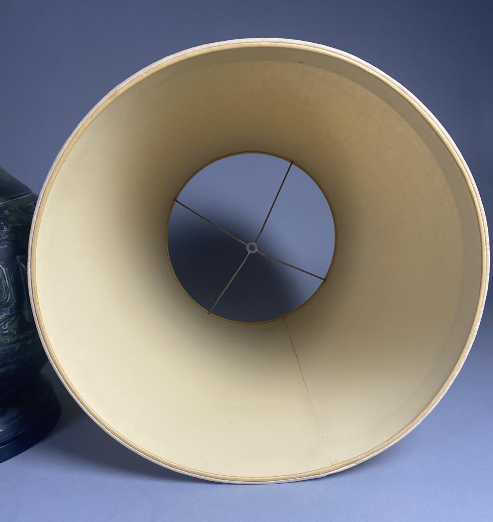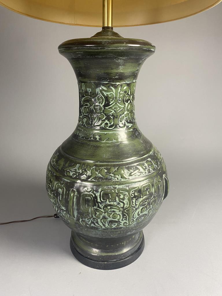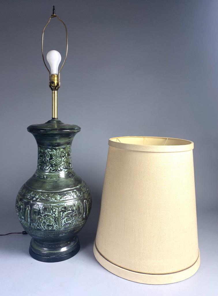 Oversized embossed ceramic lamp in a verdigris green finish. It appears to have its original linen covered drum shade. Overall height 50″, to top of socket 34″. CONDITION: SHIPPING: Local pick-up or third party shipping only for this lot. Please see the Shipping Policy for information on suggested shippers. We recommend the Pak Mail Store of Battle Creek to assist you. Please contact the shipper of your choice for shipping estimates on this lot. Refer to the Shipping section in our full Terms and Conditions for all information on shipping.