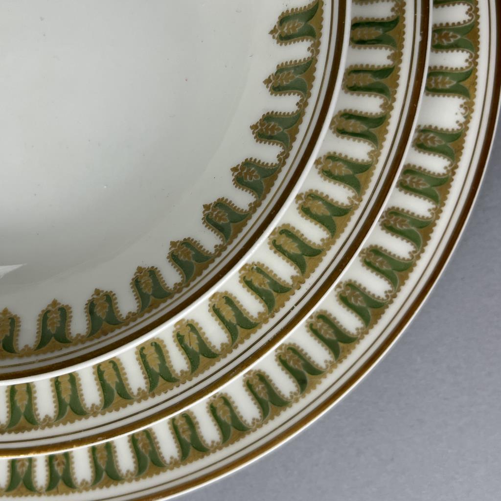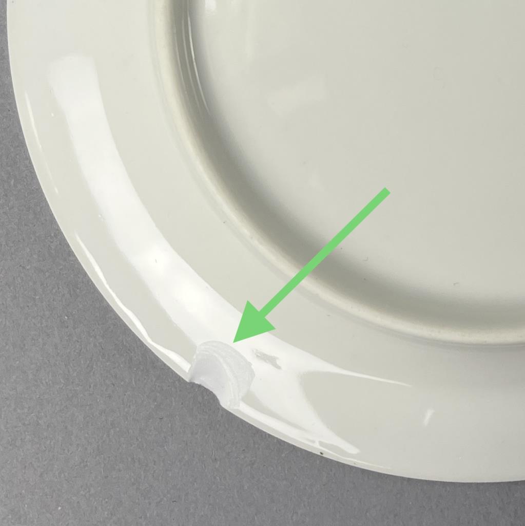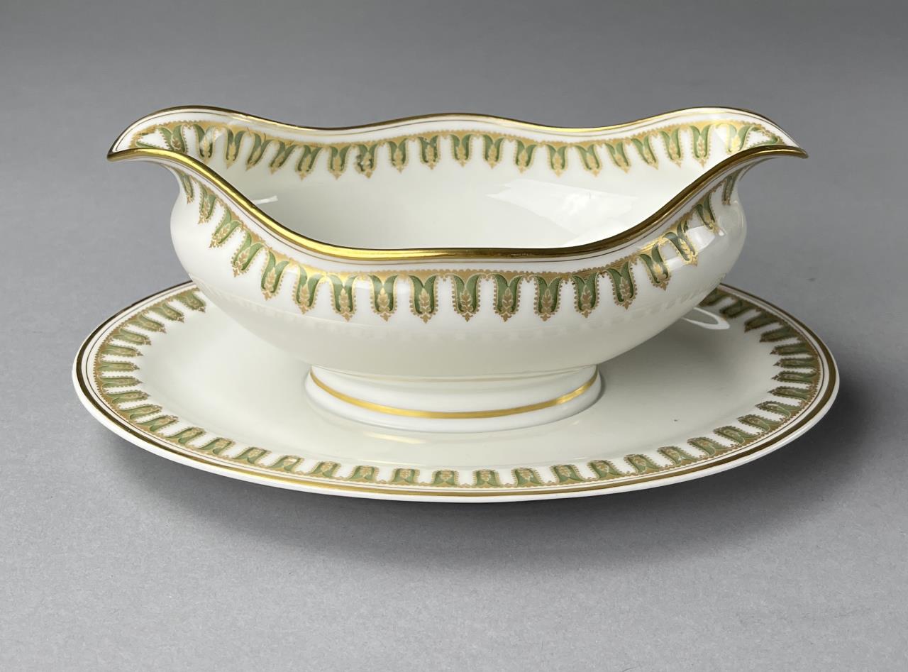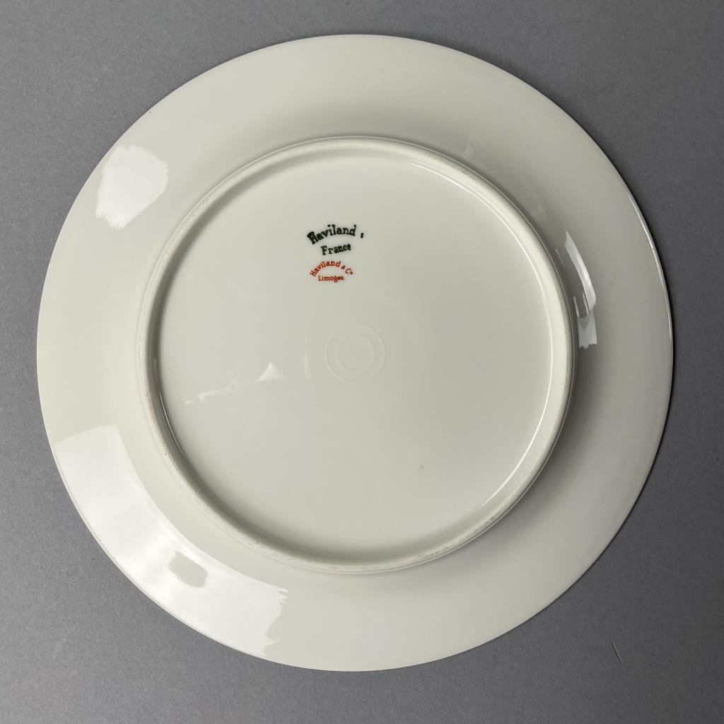 Set of antique Haviland (French) porcelain dinnerware service, circa early 20th Century, includes: (12) 8-11/16″ plates; (12) 7-1/2″ salad plates; (12) 6-1/8″ bread and butter plates; (12) cups and saucers; (12) butter pats; (1) 13-7/8″ oval platter; (1) 10″ oval open serving bowl; (1) 9-1/8″ round footed open serving bowl; (1) 8-2/3″ round covered footed serving bowl; (1) gravy boat with attached underplate; (1) cream pitcher and sugar bowl set. CONDITION: Chips to the rim of one of the large plates and one of the bread and butter plates. One cup is broken. There is no lid for the sugar bowl. SHIPPING: In-House Shipping Available. Please read our Shipping Policies and Terms and Conditions