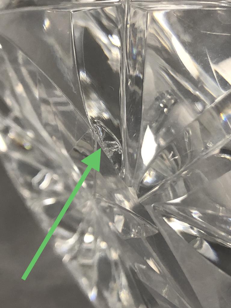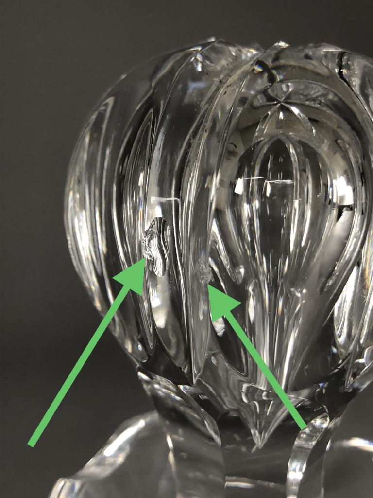 Cut glass leaded crystal decanter, with stopper with inverted tear shaped interior blown bubble, most likely Czech or German, mid to late 20th Century, approximately 10-2/3″ . CONDITION: Two small chips on the stopper and one small chip on the bottom edge of the decanter, please see last two photos. SHIPPING: In-House Shipping Available. Please read our Shipping Policies and Terms and Conditions