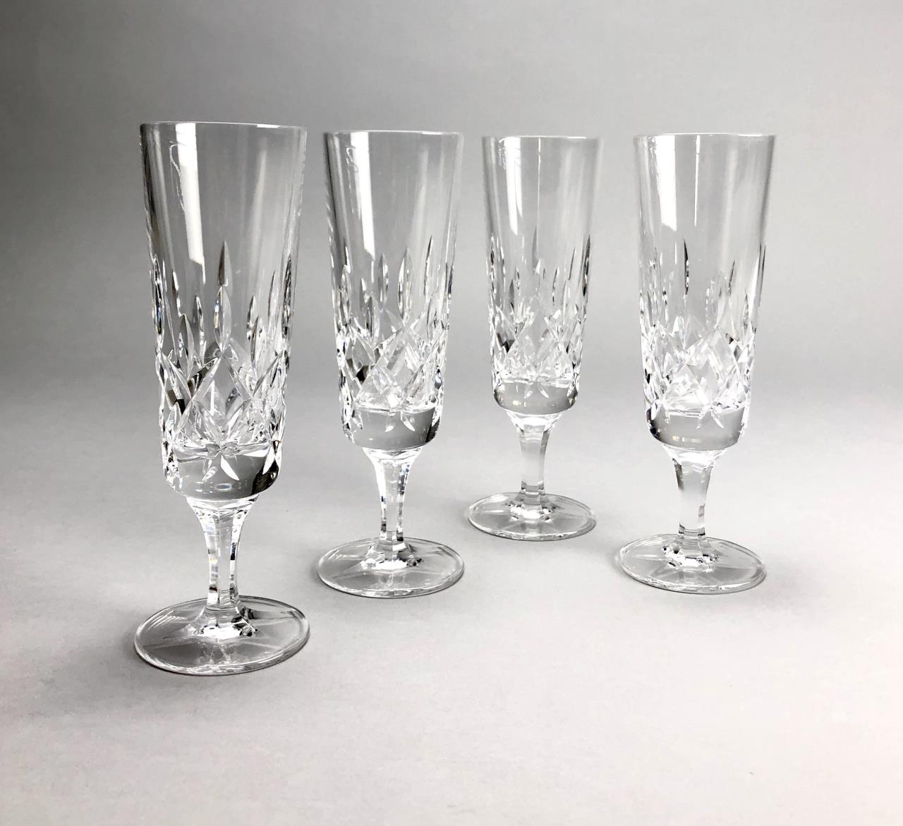 Four Gorham Crystal Champagne flutes, in the “King Edward” pattern, introduced in 1982 and discontinued in 1999, 7-3/8″ in height. CONDITION: SHIPPING: In-House Shipping Available. Please read our Shipping Policies and Terms and Conditions
