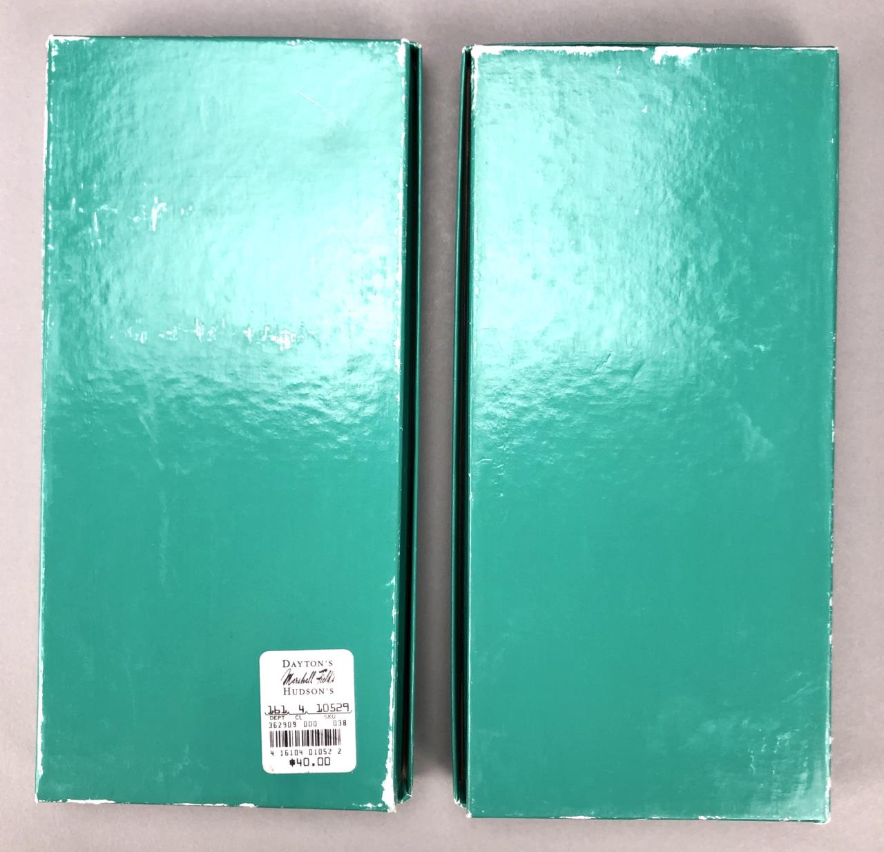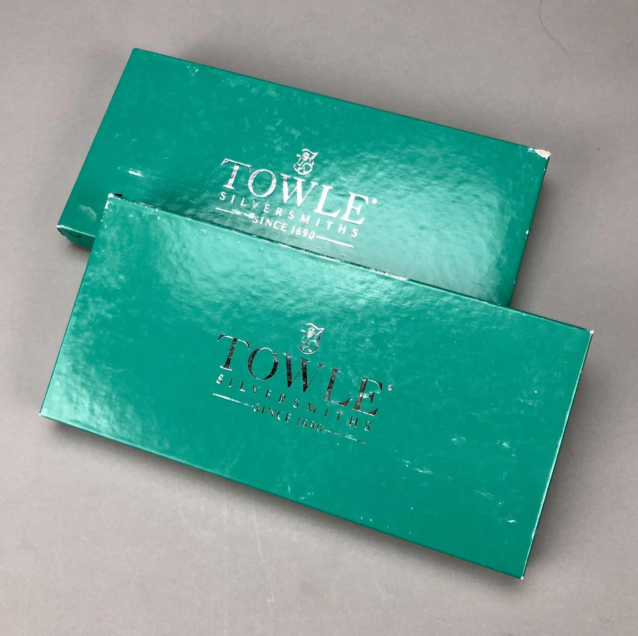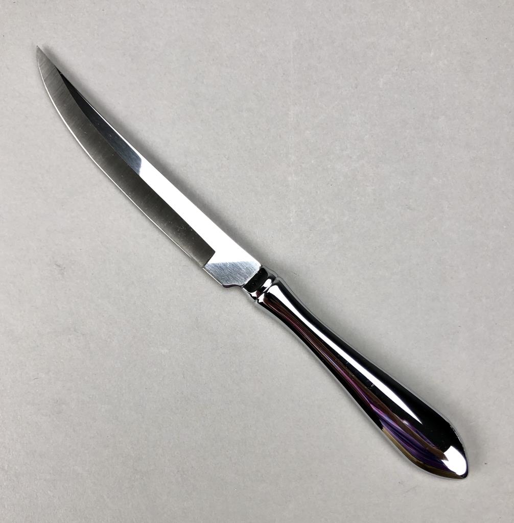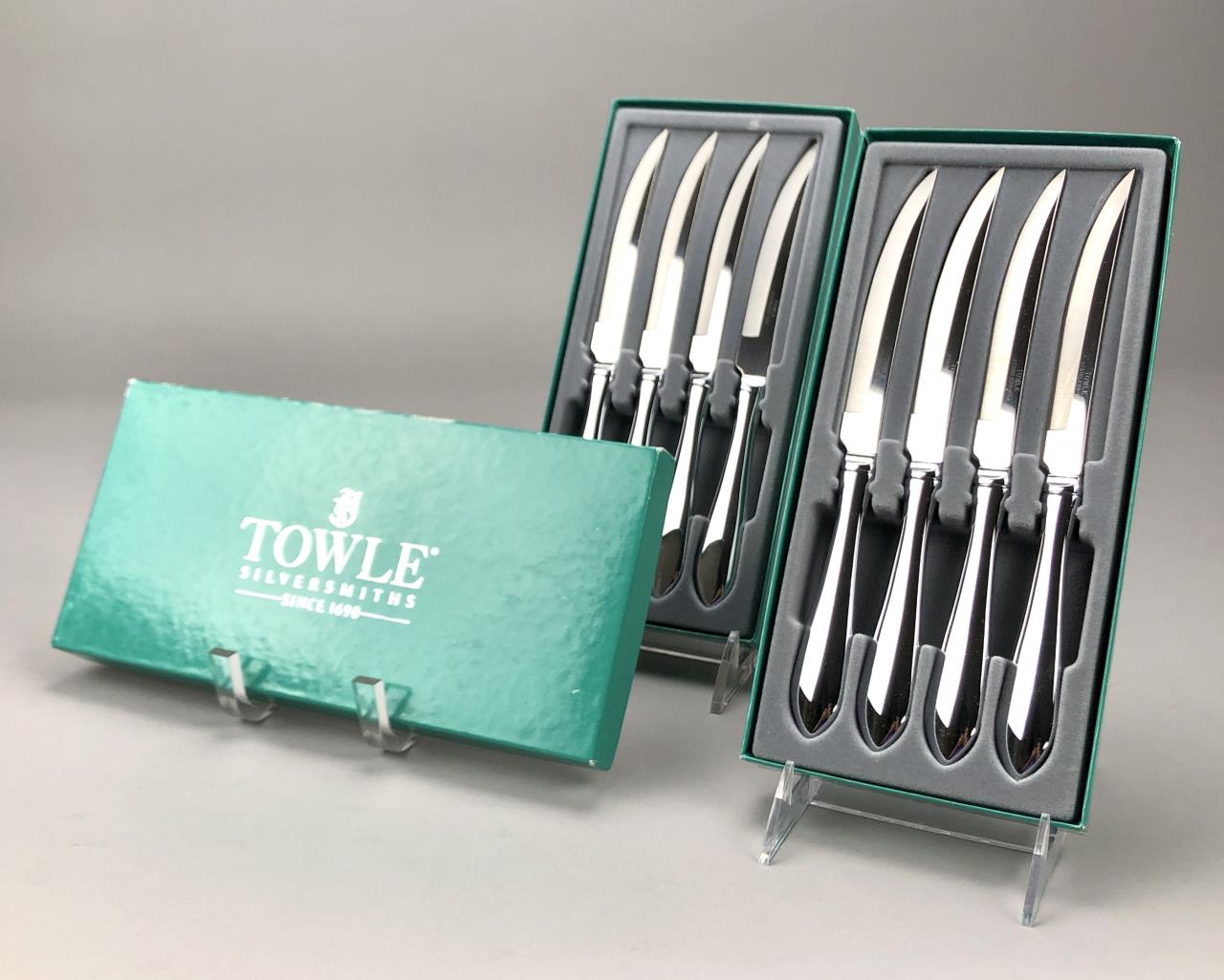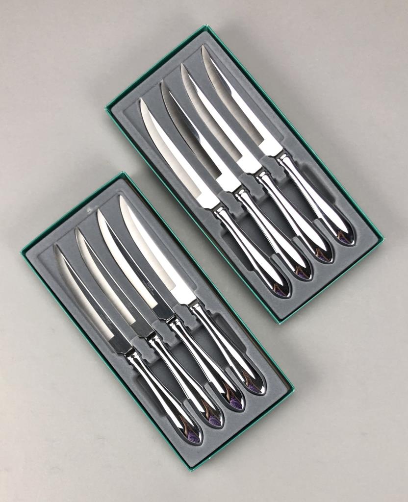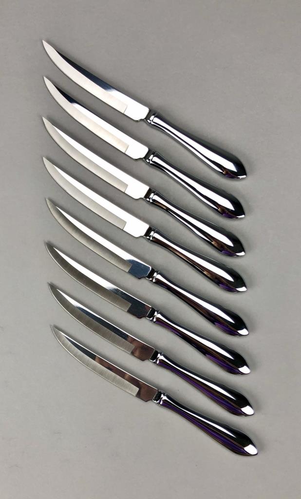 Set of eight stainless steel steak knives, by Towel Silversmiths (USA), in the “Boston Antique” pattern, which was introduced in 1980 and discontinued in 2022, in two original boxes, etched mark on each blade, each knife is approximately 9-1/4″ (L). CONDITION: SHIPPING: In-House Shipping Available. Please read our Shipping Policies and Terms and Conditions