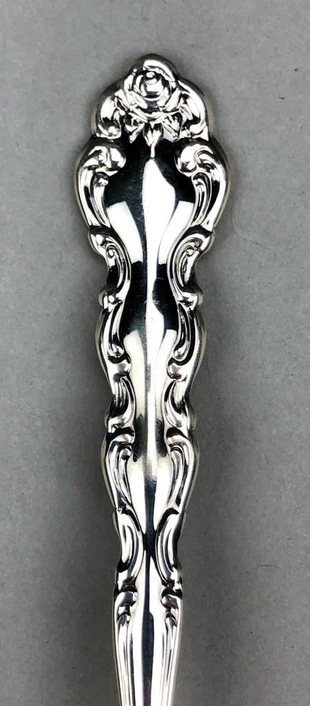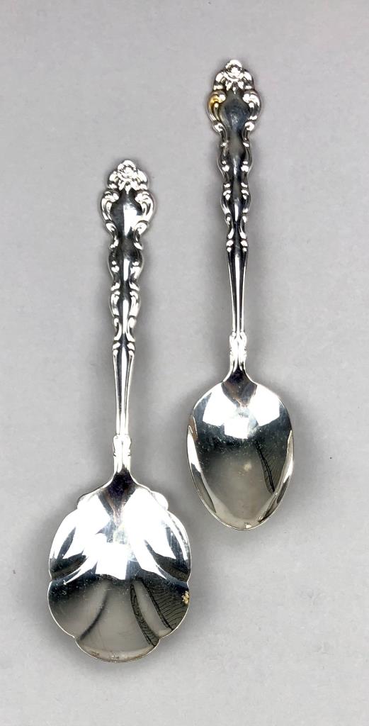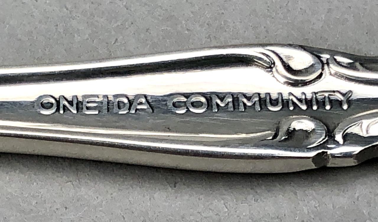 Oneida (American) silverplated flatware set, service for at least six with several extra pieces, in the “Beethoven” pattern, which was introduced in 1971. The set includes: (9) dinner forks; (8) salad/dessert forks; (9) dinner knives with stainless steel blades; (9) teaspoons; (6) place soup spoons; (1) standard serving spoon; and (1) large scalloped serving spoon (total 43 pieces). CONDITION: All pieces are unpolished and some may be tarnished, or have light surface scratches, or small areas of corrosion, commensurate with age and normal use. SHIPPING: In-House Shipping Available. Please read our Shipping Policies and Terms and Conditions