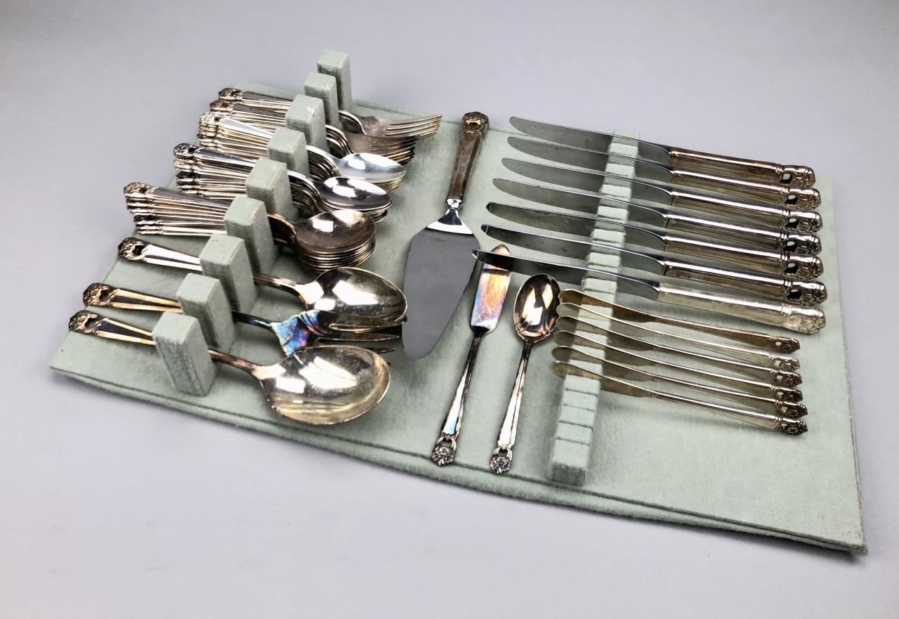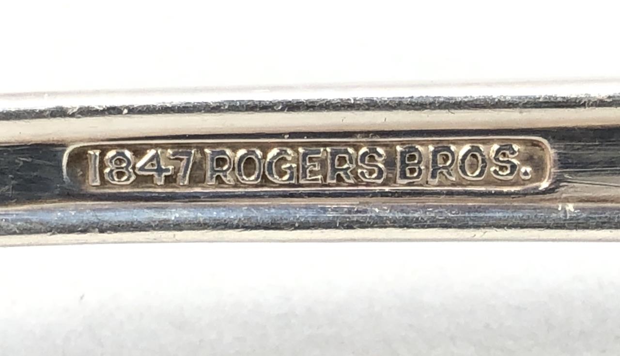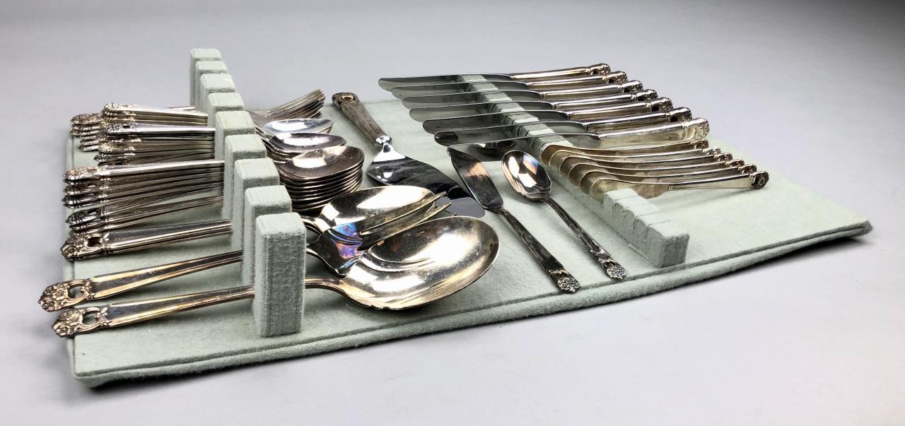 International Silver (American) silver plated flatware partial set, in the “Eternally Yours” pattern, which was introduced in 1941. The set includes: (3) dinner forks; (6) salad/dessert forks; (7) dinner knives; (19) teaspoons; (8) cream soup spoons; (6) butter spreaders; and (7) various serving pieces (total 56 pieces). CONDITION: SHIPPING: In-House Shipping Available. Please read our Shipping Policies and Terms and Conditions