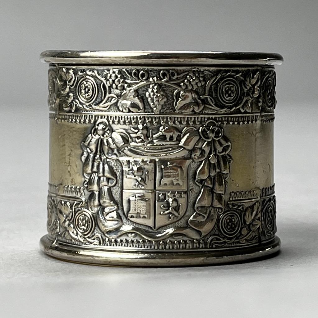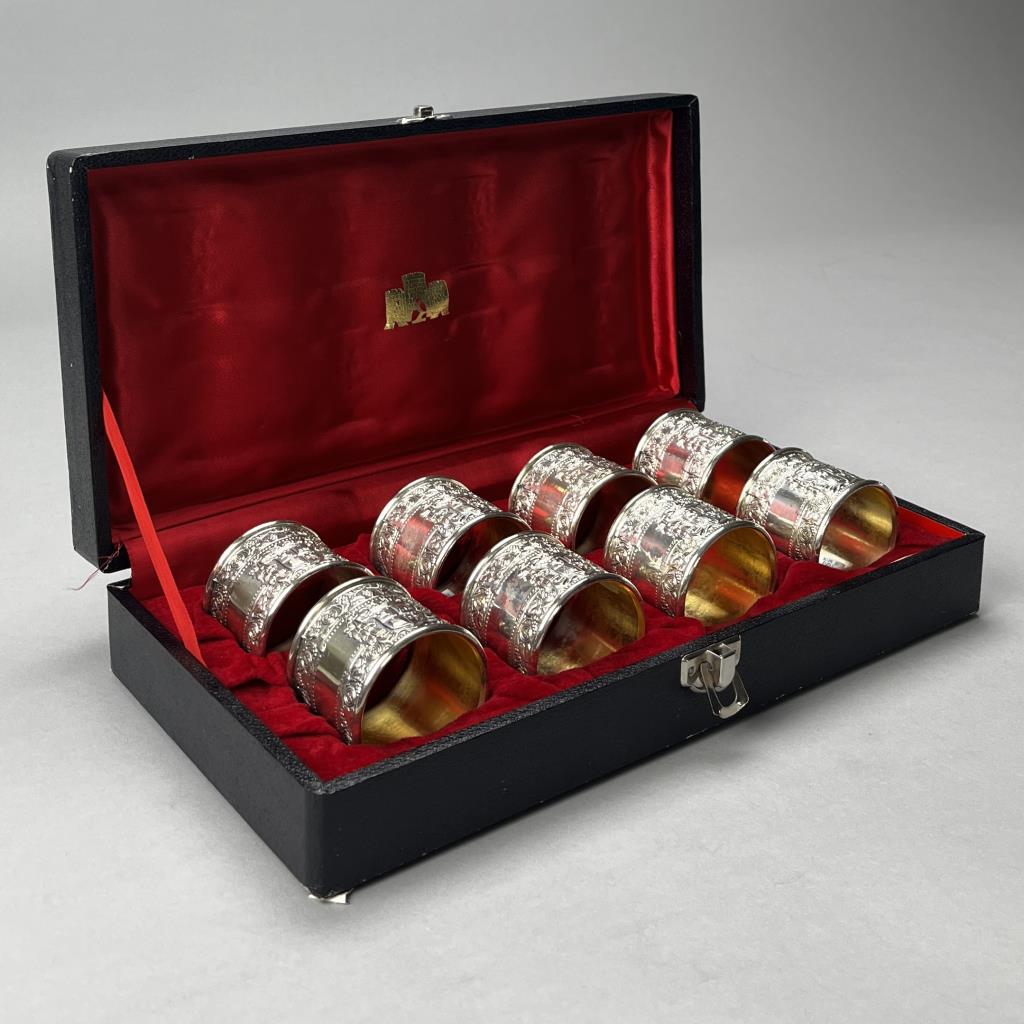 Set of eight napkin rings with matching crests, silverplated with gold vermeil interiors, in fabric lined presentation box, circa mid to late 20th Century. CONDITION: SHIPPING: In-House Shipping Available. Please read our Shipping Policies and Terms and Conditions