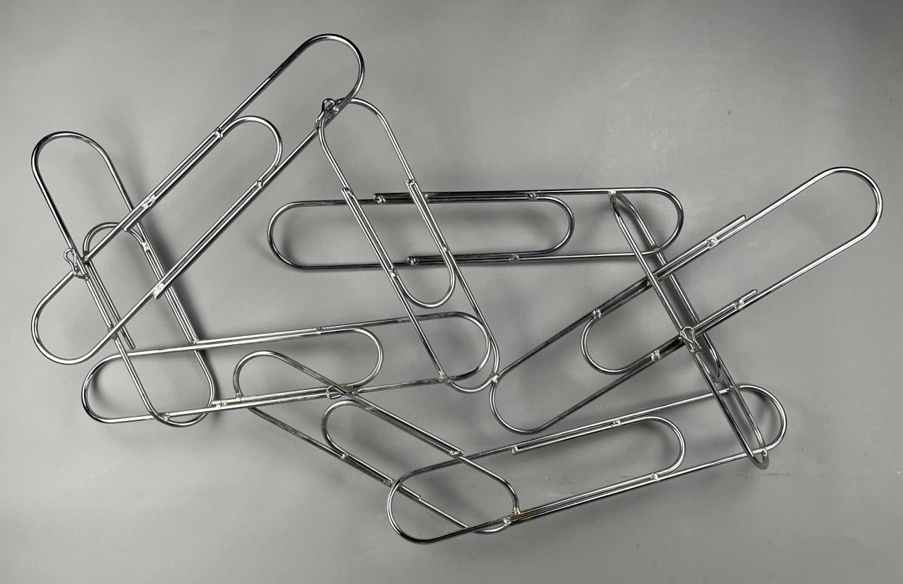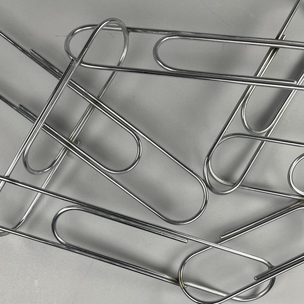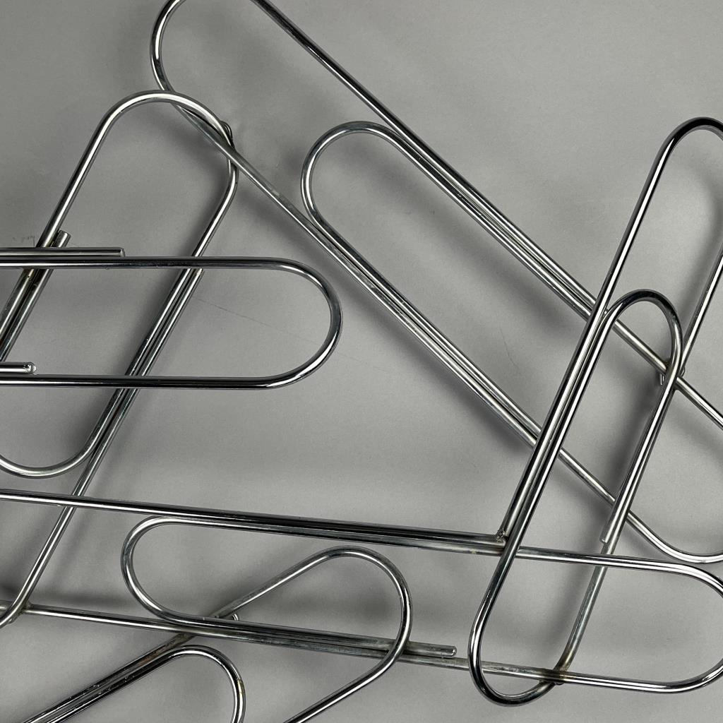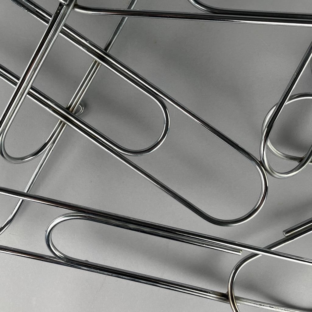 Mid Century Modern, Pop Art wall sculpture, titled “Paper Clip” by Curtis Jere and distributed through Artisan House. Both companies were established in the 1960s in Los Angles by Curtis Freiler (American, 1910 – 2013) and Jerry Fels (American, 1917 – 2008). Welded chrome with four loop hangers on the back, which allows the piece to be hung either horizontally or vertically, approximately 41″ x 23″ x 5″. CONDITION: SHIPPING: Local pick-up or third party shipping only for this lot. Please see the Shipping Policy for information on suggested shippers. We recommend the Pak Mail Store of Battle Creek to assist you. Please contact the shipper of your choice for shipping estimates on this lot. Refer to the Shipping section in our full Terms and Conditions for all information on shipping.