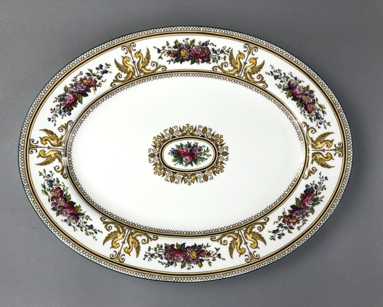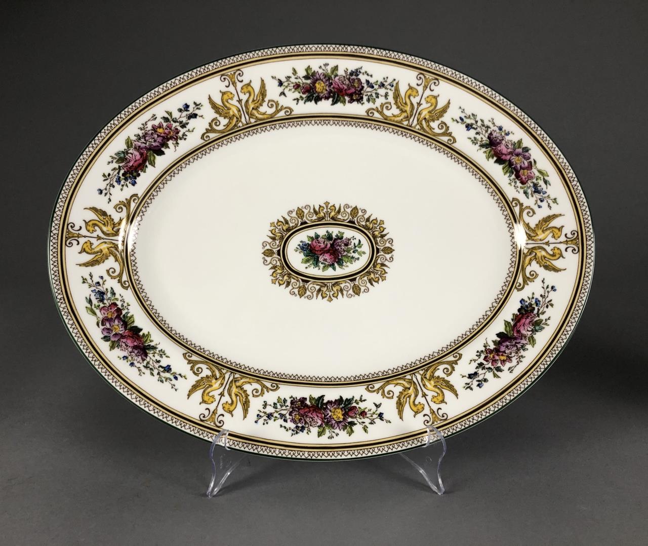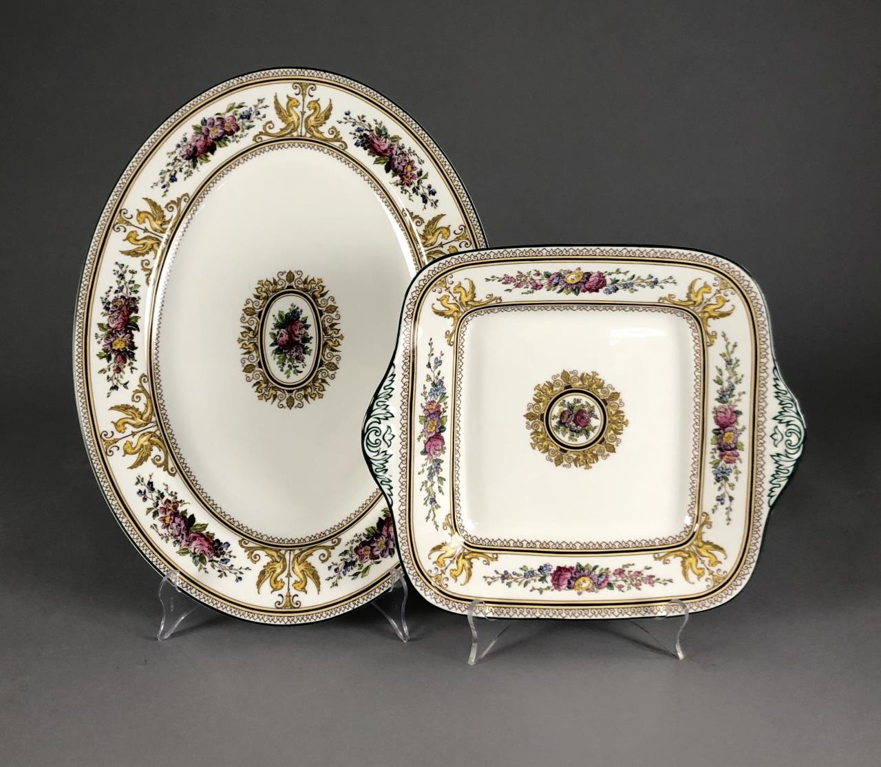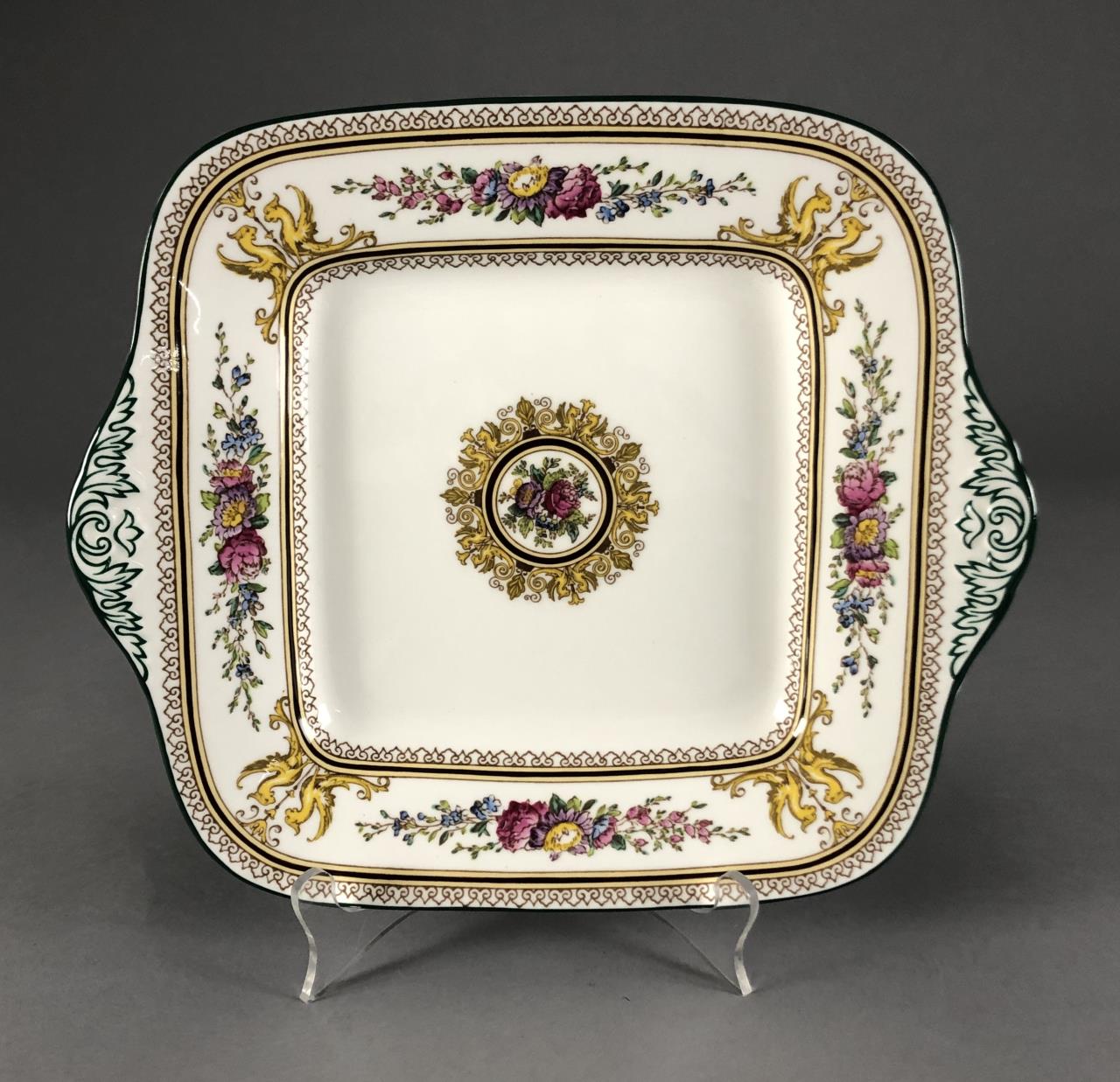 Hand painted Wedgwood oval platter (15-3/8″) and doubled handled square cake plate (11-1/8″), in the “Columbia” pattern, which was introduced in 1924 and discontinued in 1997. CONDITION: SHIPPING: In-House Shipping Available. Please read our Shipping Policies and Terms and Conditions