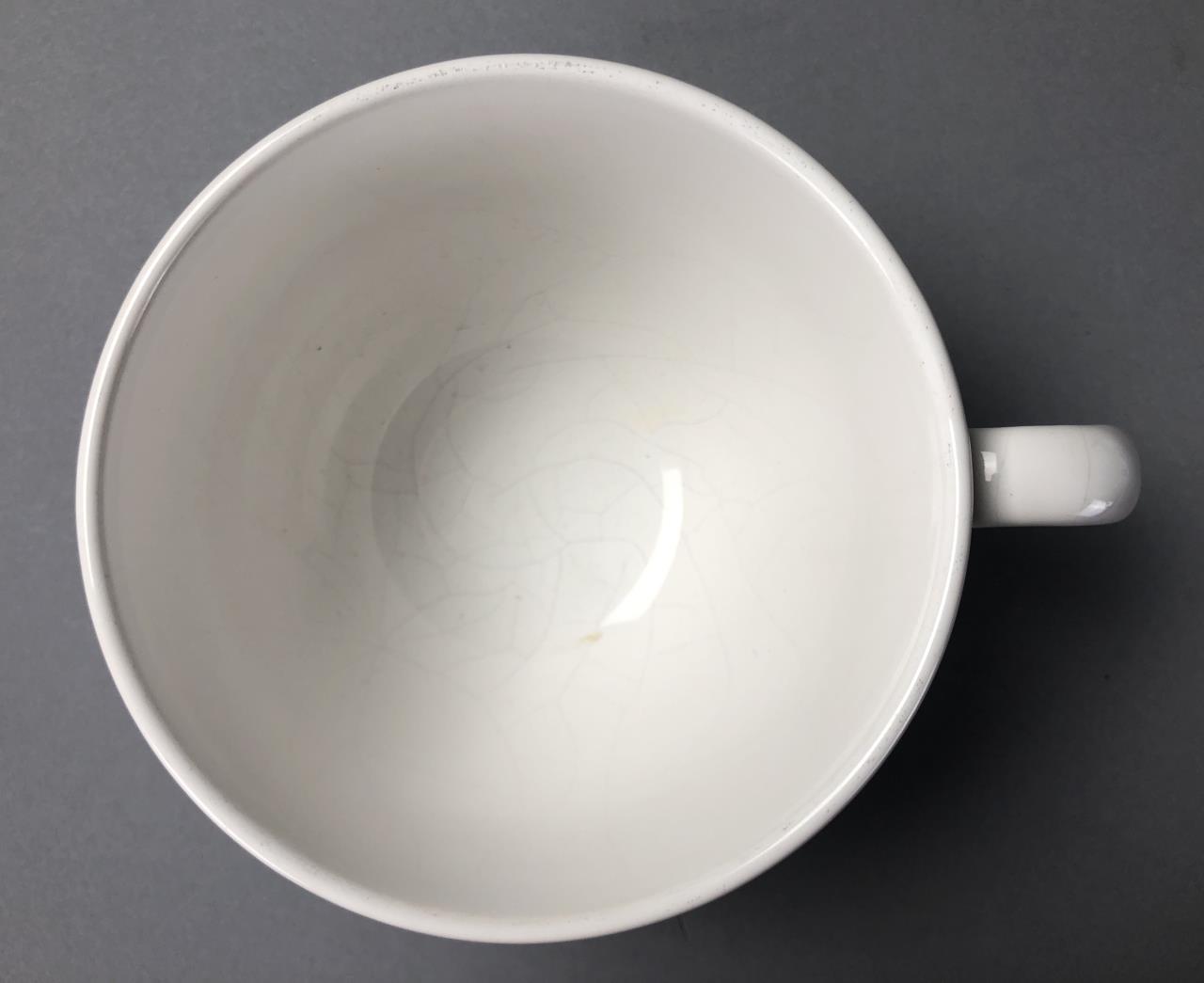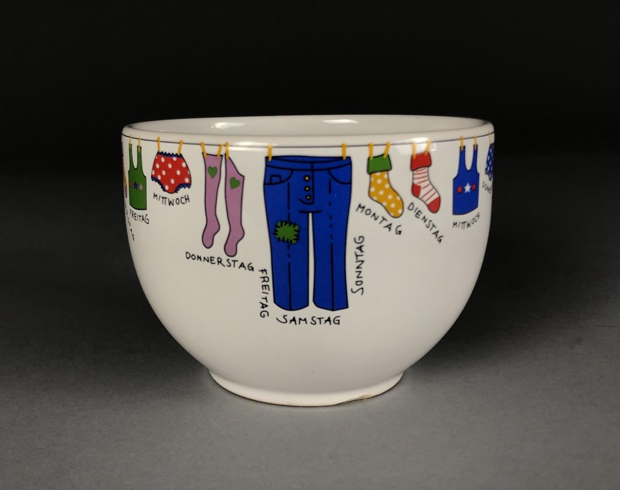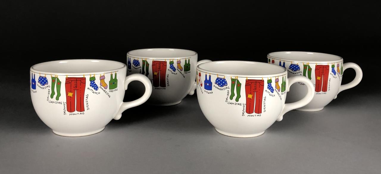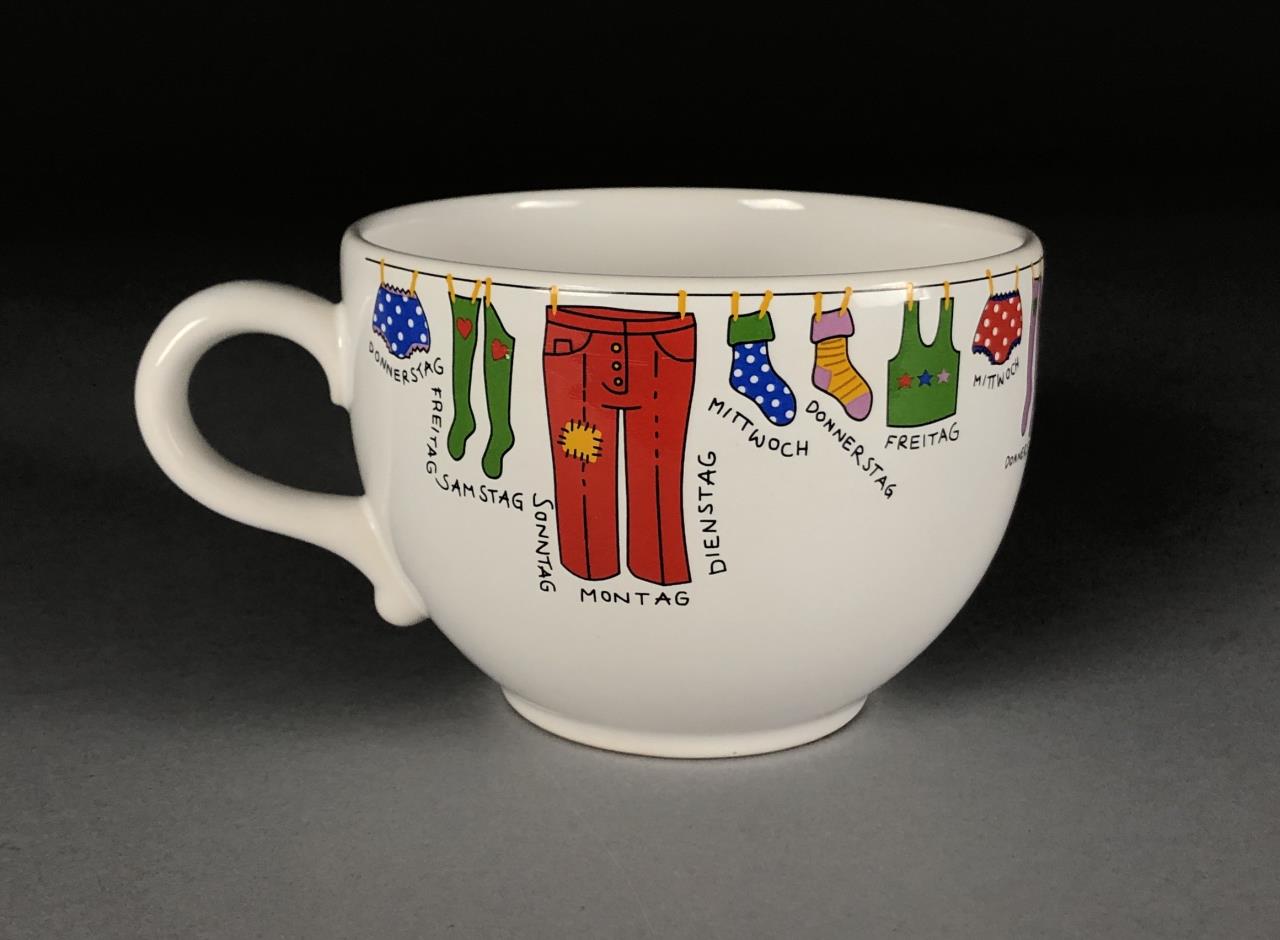 Four Waechtersbacher (Germany) jumbo cappuccino cups or soup mugs (3-1/2″ H x 4-7/8″ W), each featuring a clothesline with various articles of clothing and underneath the days of the week in German, all marked on bottom, purchased in Germany in 2005/2006. CONDITION: All with cracking to the glaze on the interior bottoms. SHIPPING: In-House Shipping Available. Please read our Shipping Policies and Terms and Conditions