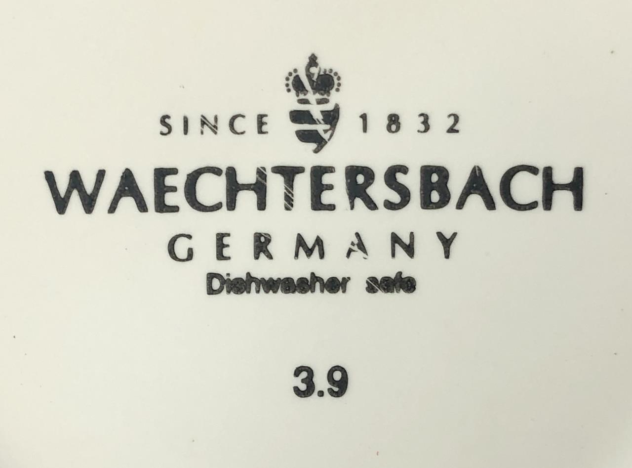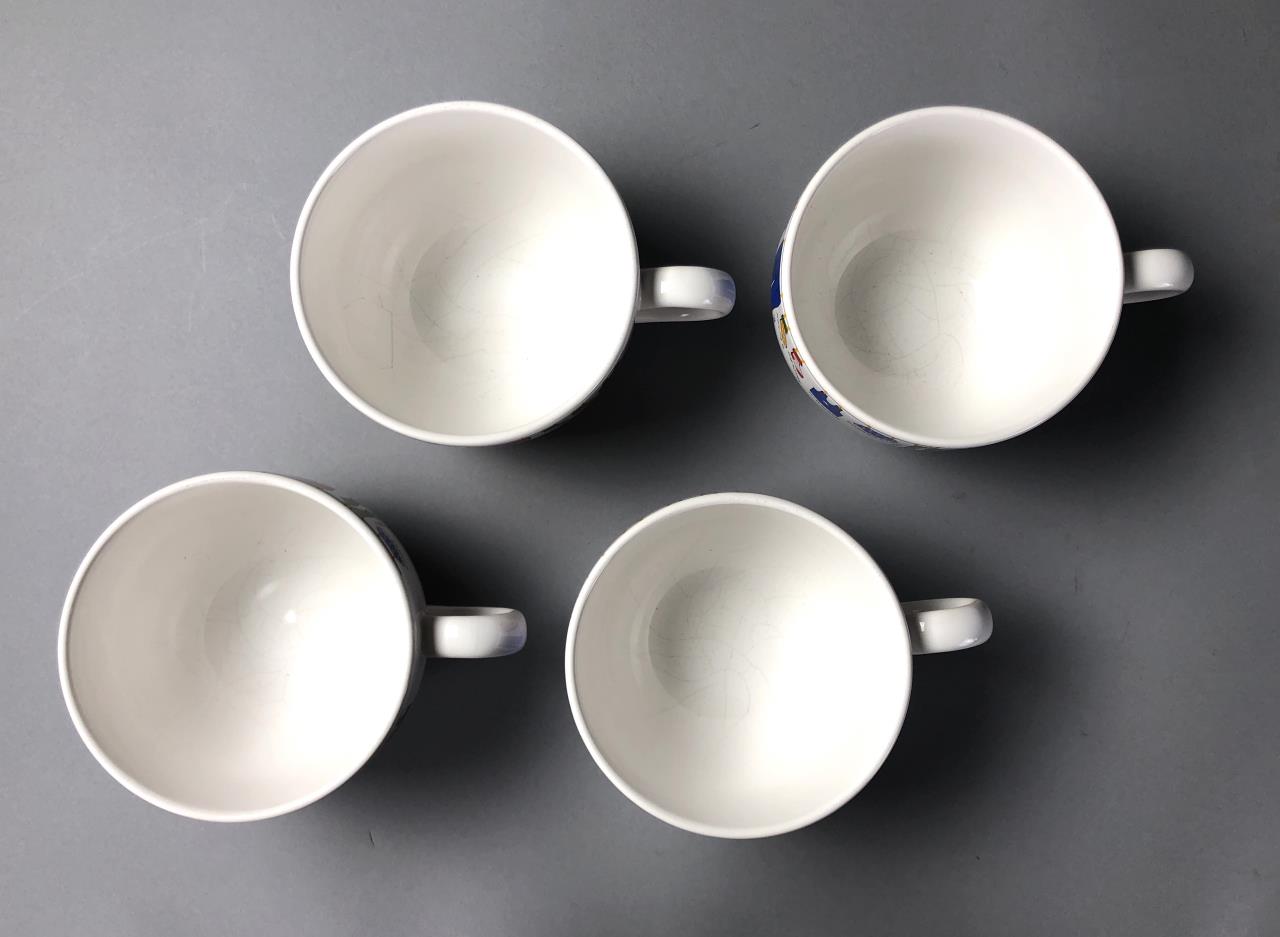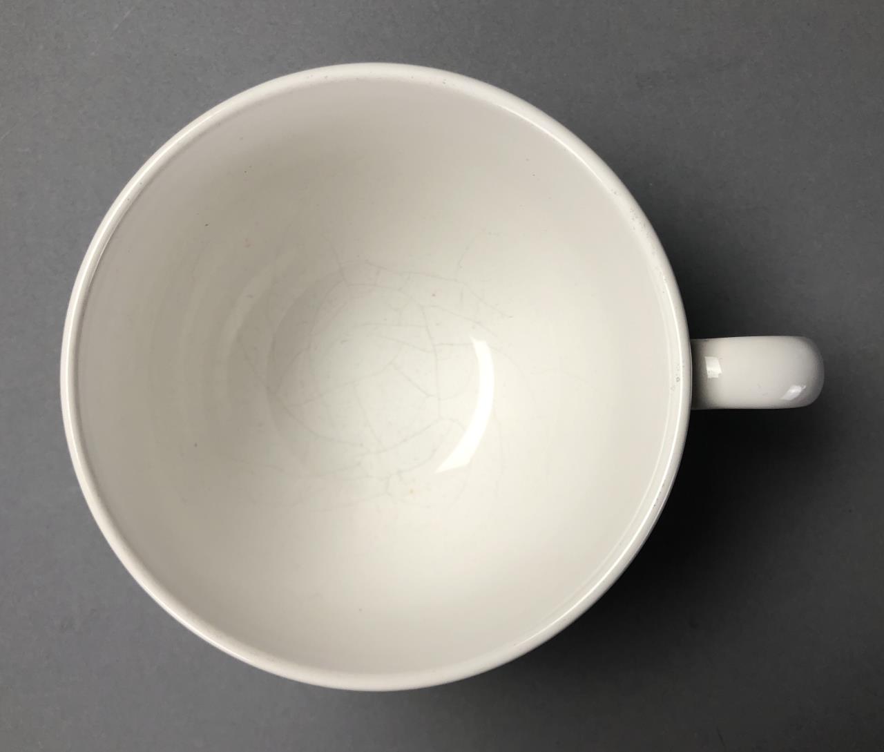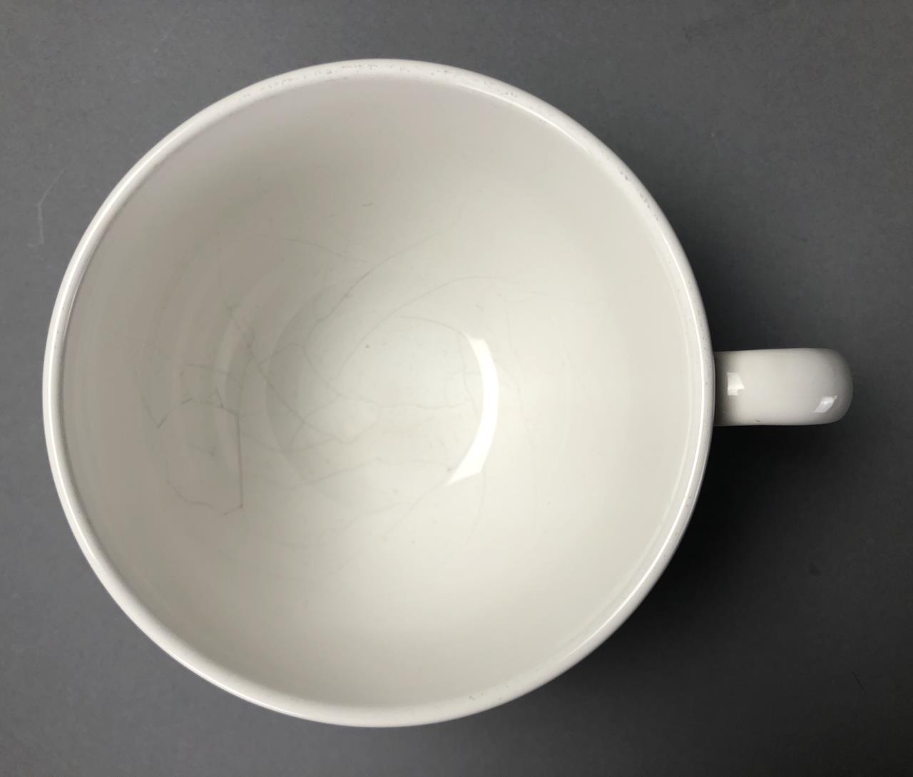Four Waechtersbacher (Germany) jumbo cappuccino cups or soup mugs (3-1/2″ H x 4-7/8″ W), each featuring a clothesline with various articles of clothing and underneath the days of the week in German, all marked on bottom, purchased in Germany in 2005/2006. CONDITION: All with cracking to the glaze on the interior bottoms. SHIPPING: In-House Shipping Available. Please read our Shipping Policies and Terms and Conditions