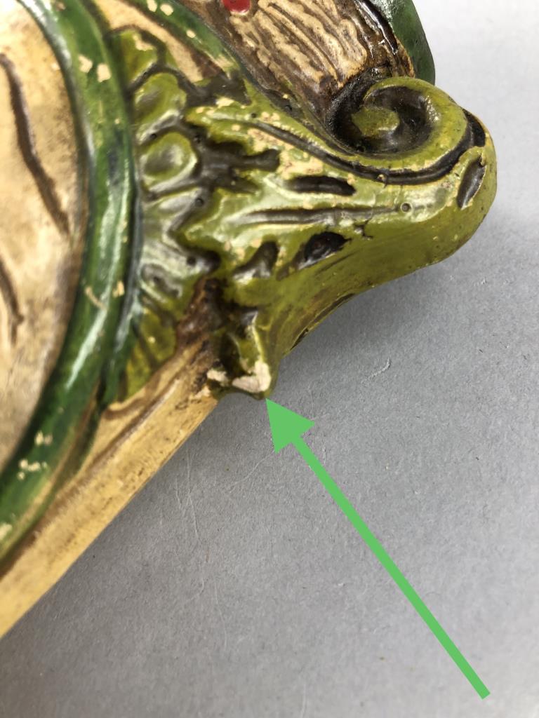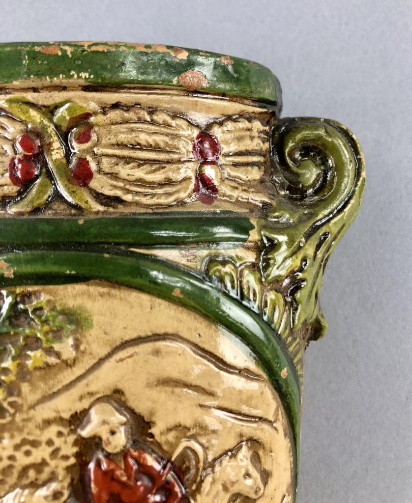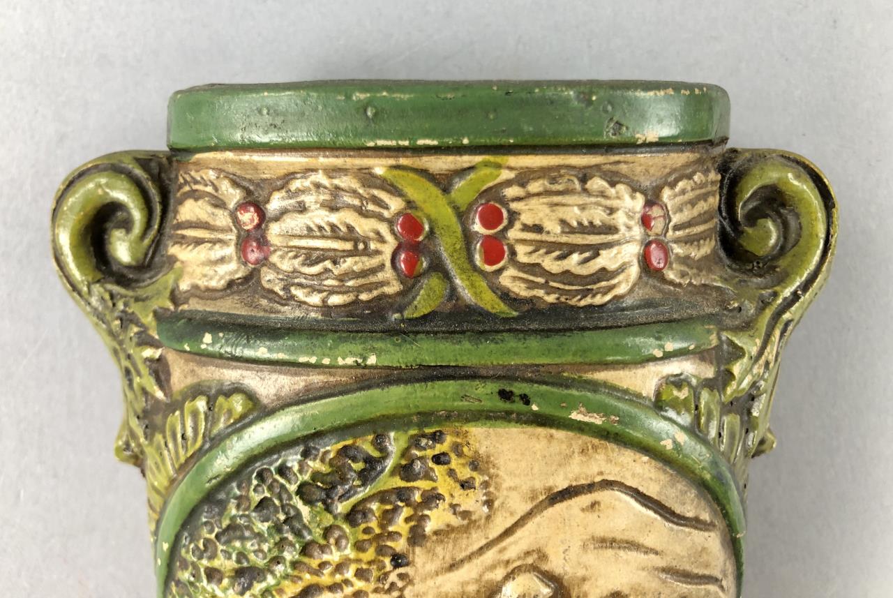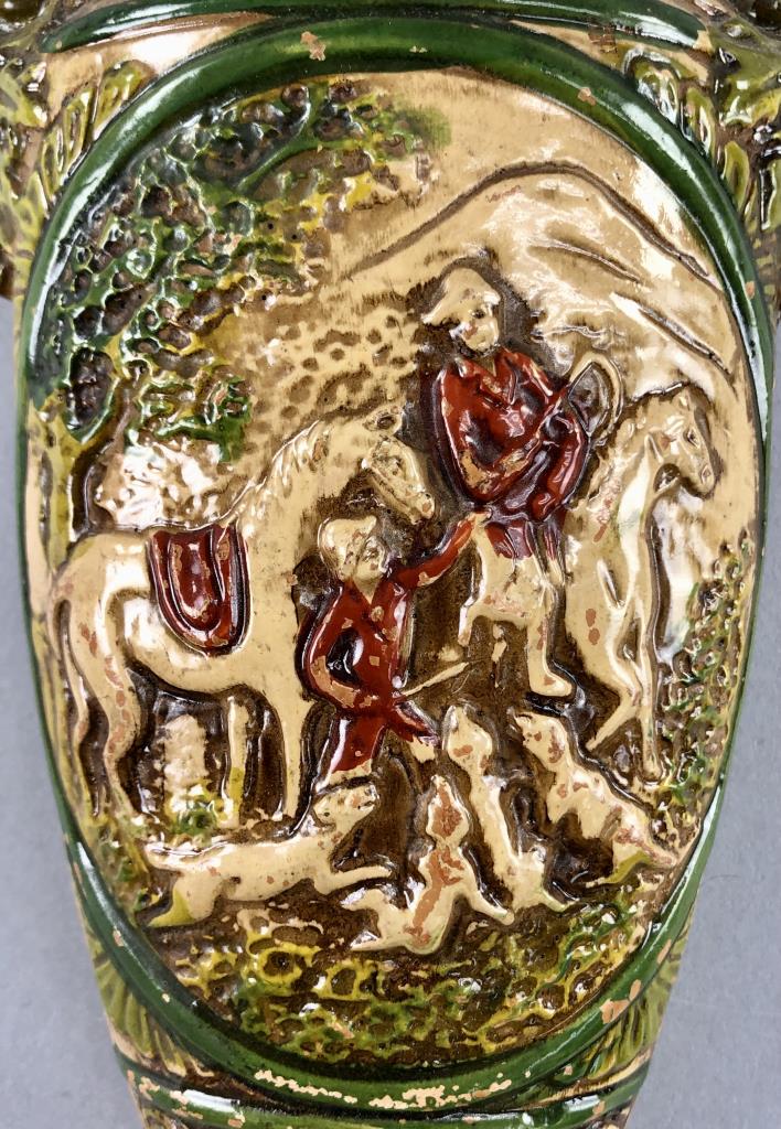 Pair of hand painted Japanese chalk ware wall pocket vases, with English hunt scenes featuring horses and hounds, circa 1930s/1940s, approximately 8-1/8″ (L). CONDITION: Loss to paint on the bottom of one as well as a small chip on the handle, please see the last two photos. SHIPPING: In-House Shipping Available. Please read our Shipping Policies and Terms and Conditions