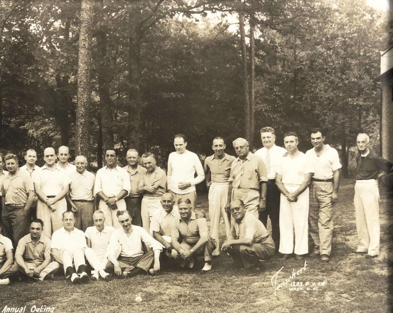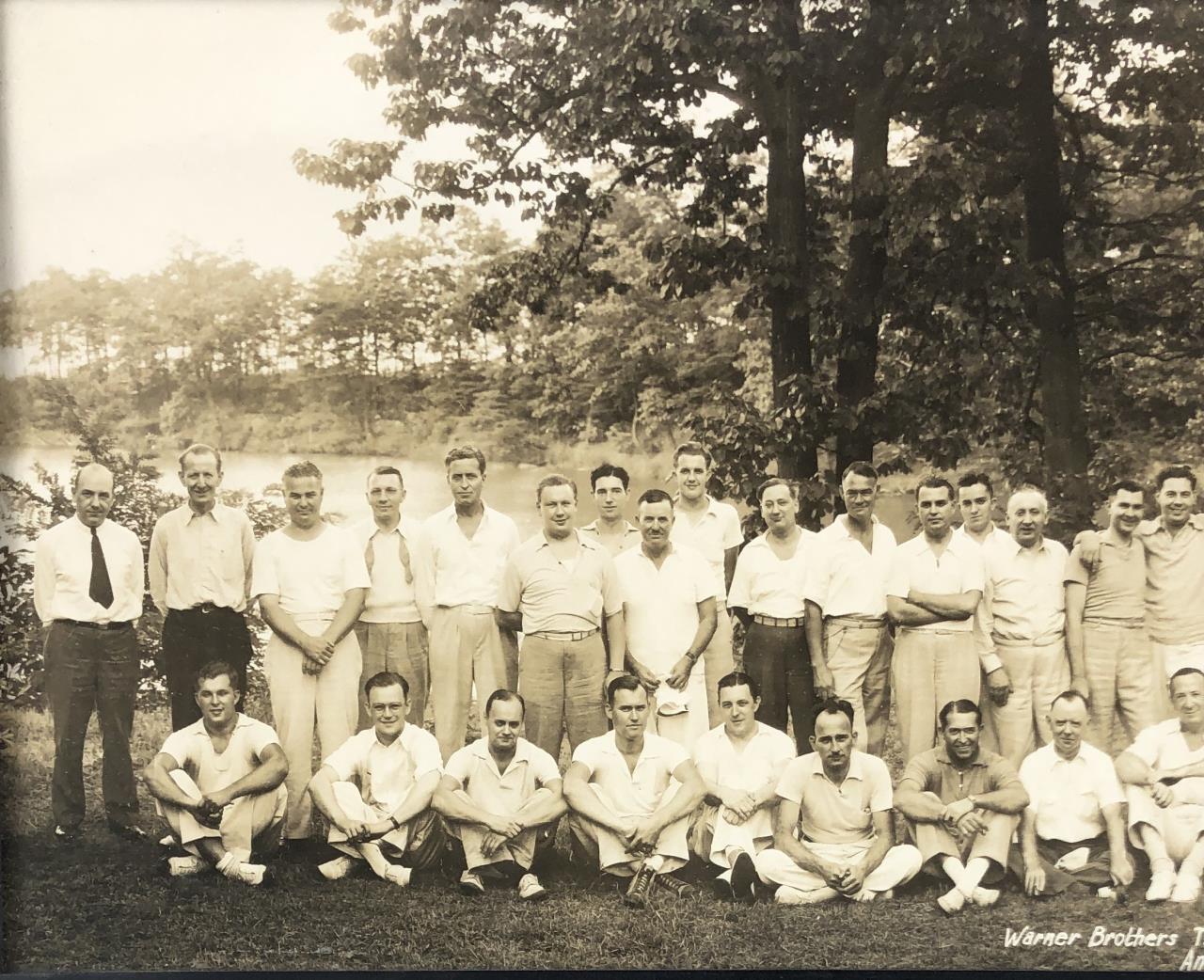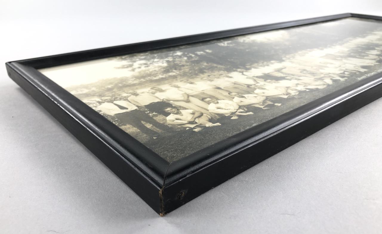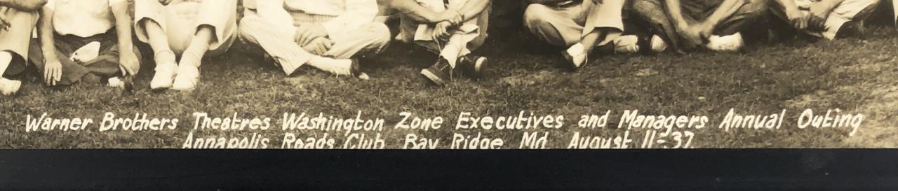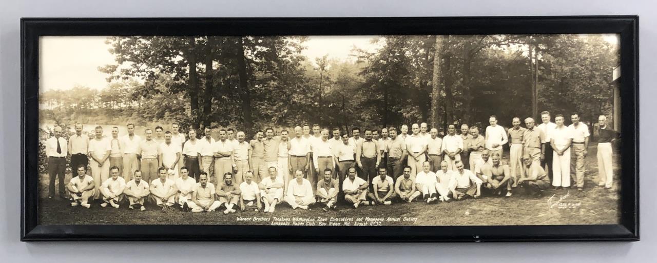 Framed panoramic black and white photograph, by Tenschert, titled the “Warner Brothers Theatres Washington Zone Executives and Managers Annual Outing Annapolis Roads Club, Bay Ridge, Md. August 11-37″, in a wood frame measuring 27-7/8″ x 10-1/8”. CONDITION: Not examined out of frame. SHIPPING: Local pick-up or third party shipping only for this lot. Please see the Shipping Policy for information on suggested shippers. We recommend the Pak Mail Store of Battle Creek to assist you. Please contact the shipper of your choice for shipping estimates on this lot. Refer to the Shipping section in our full Terms and Conditions for all information on shipping.