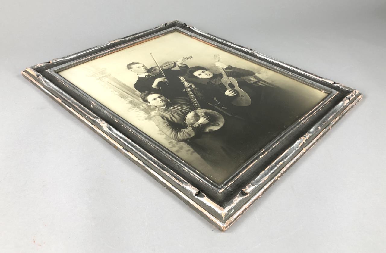 Framed sepia photograph of three musicians playing either a violin or viola, a banjo, and a guitar, circa 1900, in painted gesso and wood frame measuring 24″ x 20″. CONDITION: Not examined out of frame. Scratching and loss to painted finish on frame. SHIPPING: In-House Shipping Available. Please read our Shipping Policies and Terms and Conditions