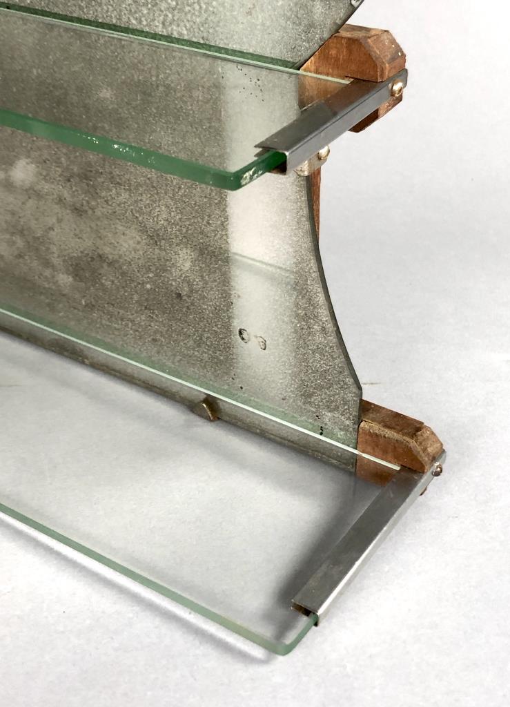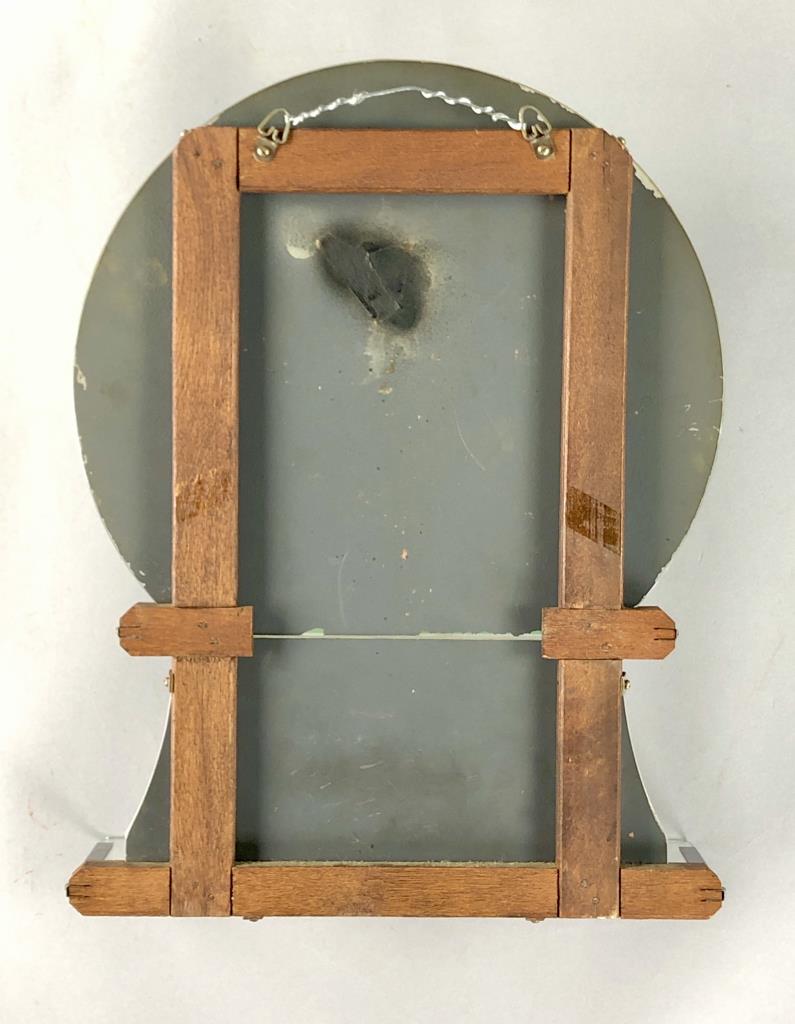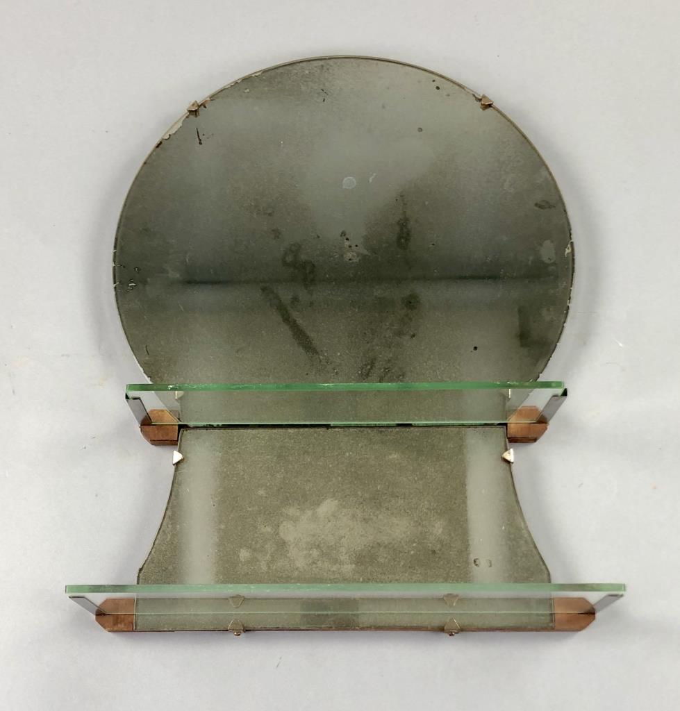 Art Moderne wall hanging shaving mirror, or vanity mirror, with two graduated glass shelves, on a wood frame, circa 1930s / 1940s, 13″ x 17″ x 4-1/8″. CONDITION: Loss to silvering on mirror. SHIPPING: Local pick-up or third party shipping only for this lot. Please see the Shipping Policy for information on suggested shippers. We recommend the Pak Mail Store of Battle Creek to assist you. Please contact the shipper of your choice for shipping estimates on this lot. Refer to the Shipping section in our full Terms and Conditions for all information on shipping.