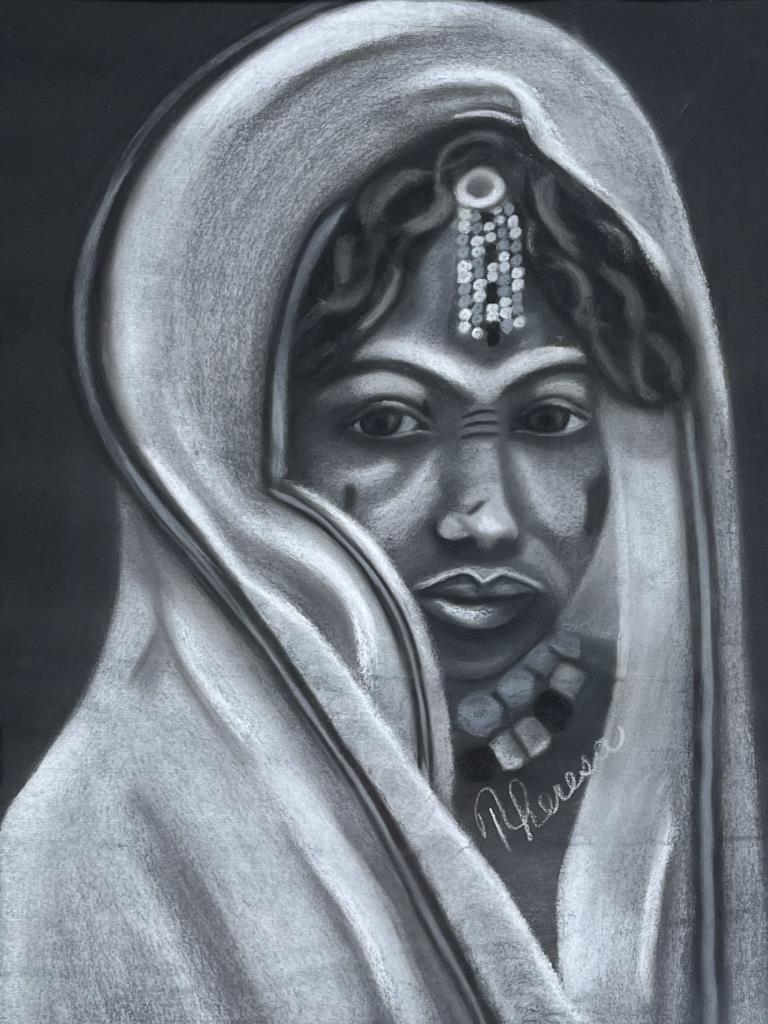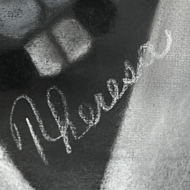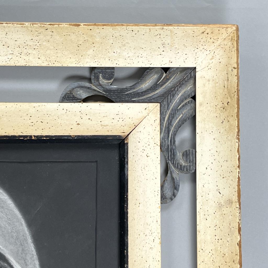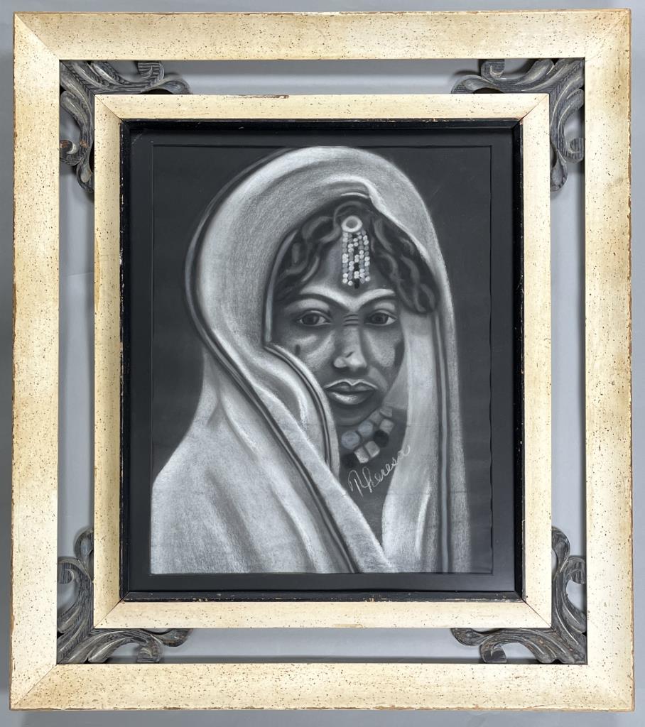 Charcoal drawing of a female figure, possibly Indian, in a 1950s carved and painted wood frame measuring approximately 30-7/8″ x 34-3/4″. CONDITION: Not examined out of frame. Some waviness to the paper in lower right corner, please see last photo. SHIPPING: Local pick-up or third party shipping only for this lot. Please see the Shipping Policy for information on suggested shippers. We recommend the Pak Mail Store of Battle Creek to assist you. Please contact the shipper of your choice for shipping estimates on this lot. Refer to the Shipping section in our full Terms and Conditions for all information on shipping.