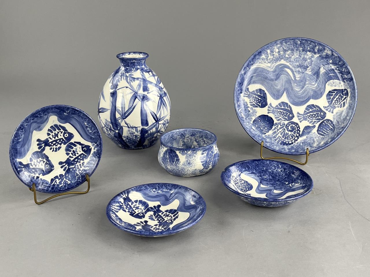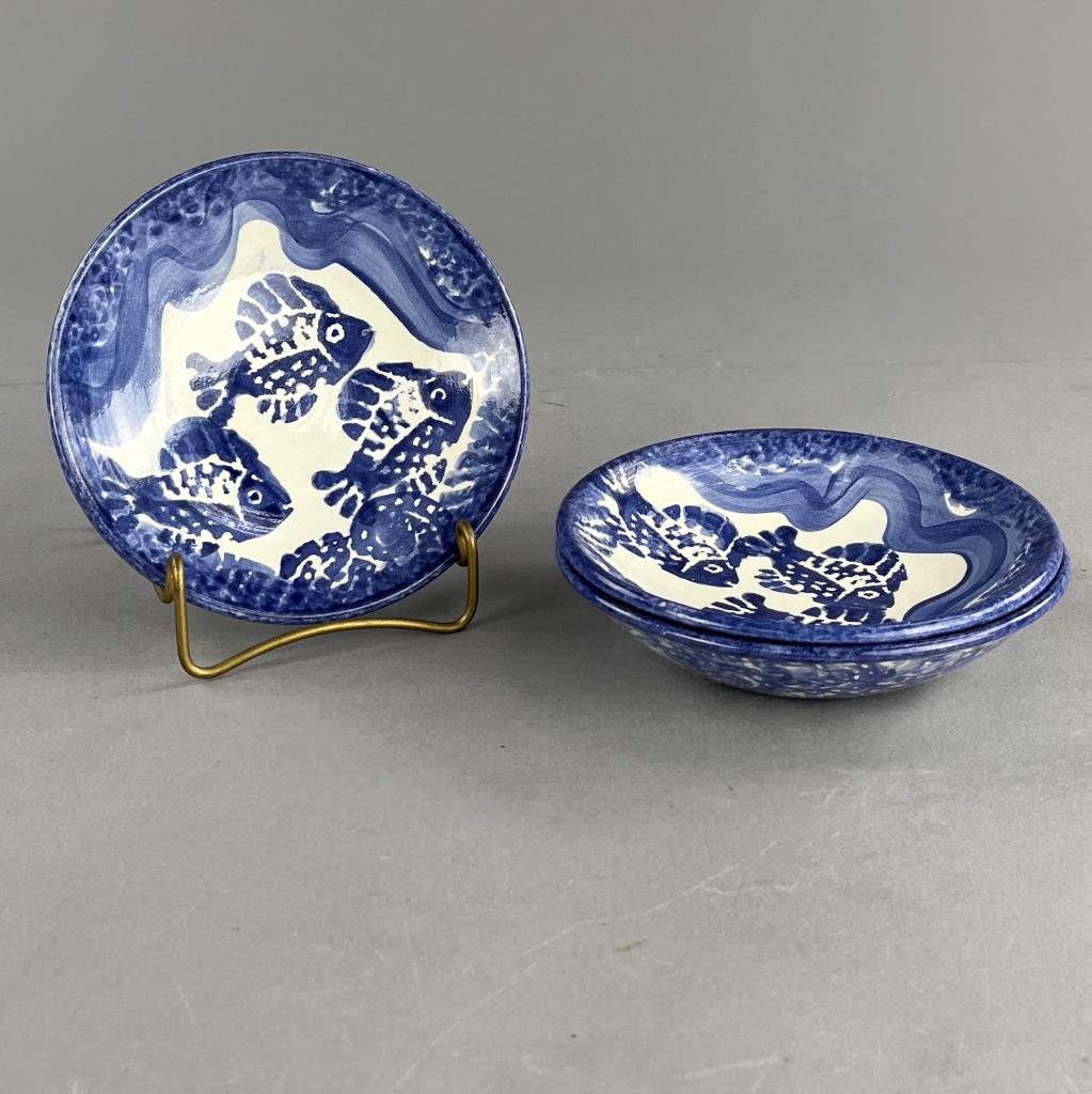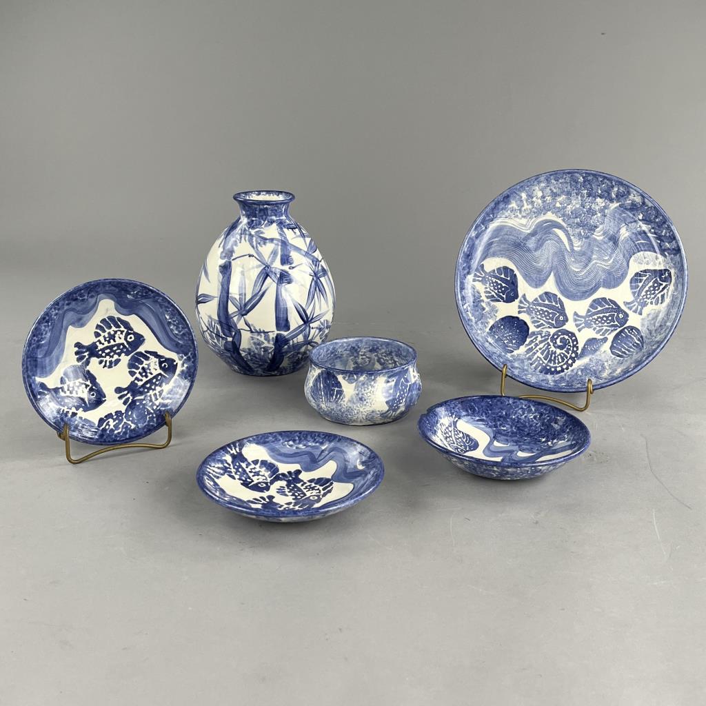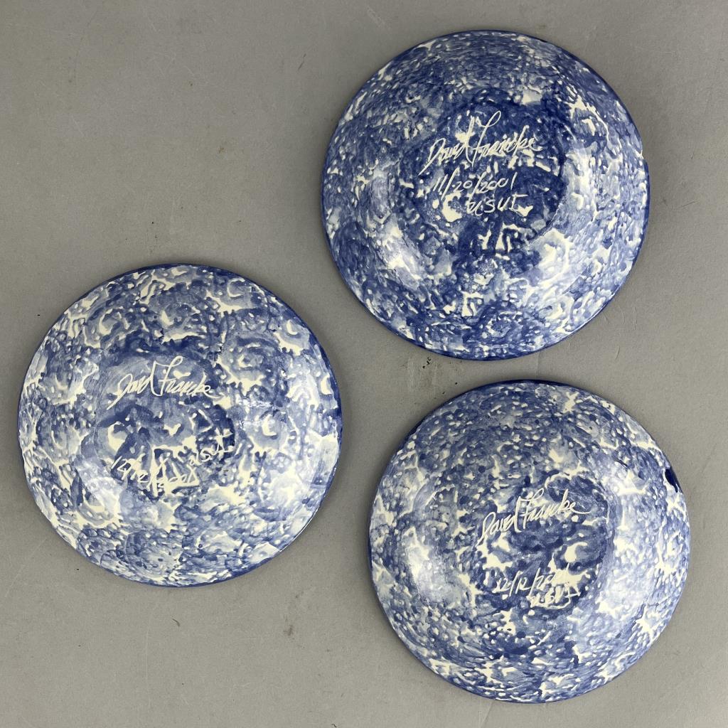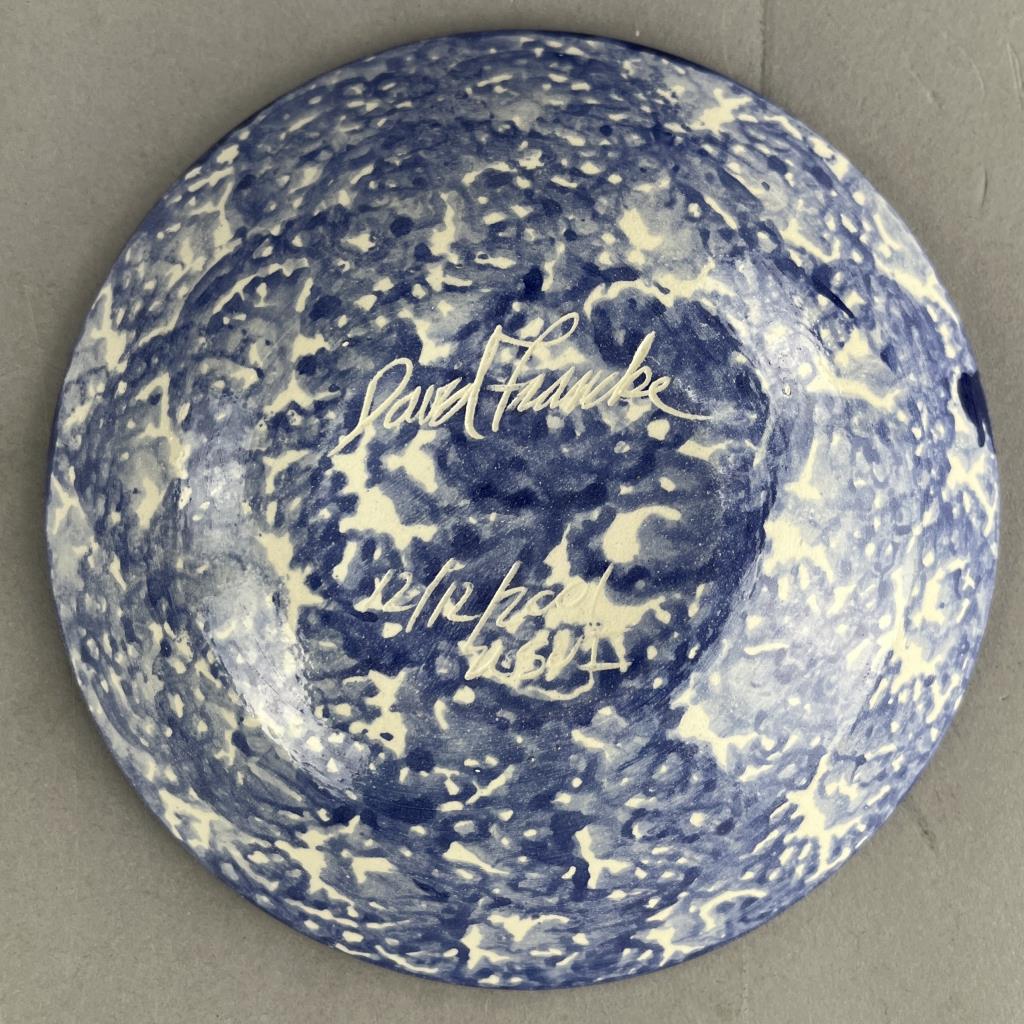 Six pieces of studio art pottery, from the Ann Arbor Michigan born artist, and Corcoran School of Art graduate (1970), David Eugene Francke (1945-2013), the largest piece, the vase, is 8″ (H). CONDITION: There is a chip on the rim of the vase, a chip and a crack to the deep bulbous bowl, and a chip on the rim of one of the smaller shallow bowls, please see photos. SHIPPING: In-House Shipping Available. Please read our Shipping Policies and Terms and Conditions