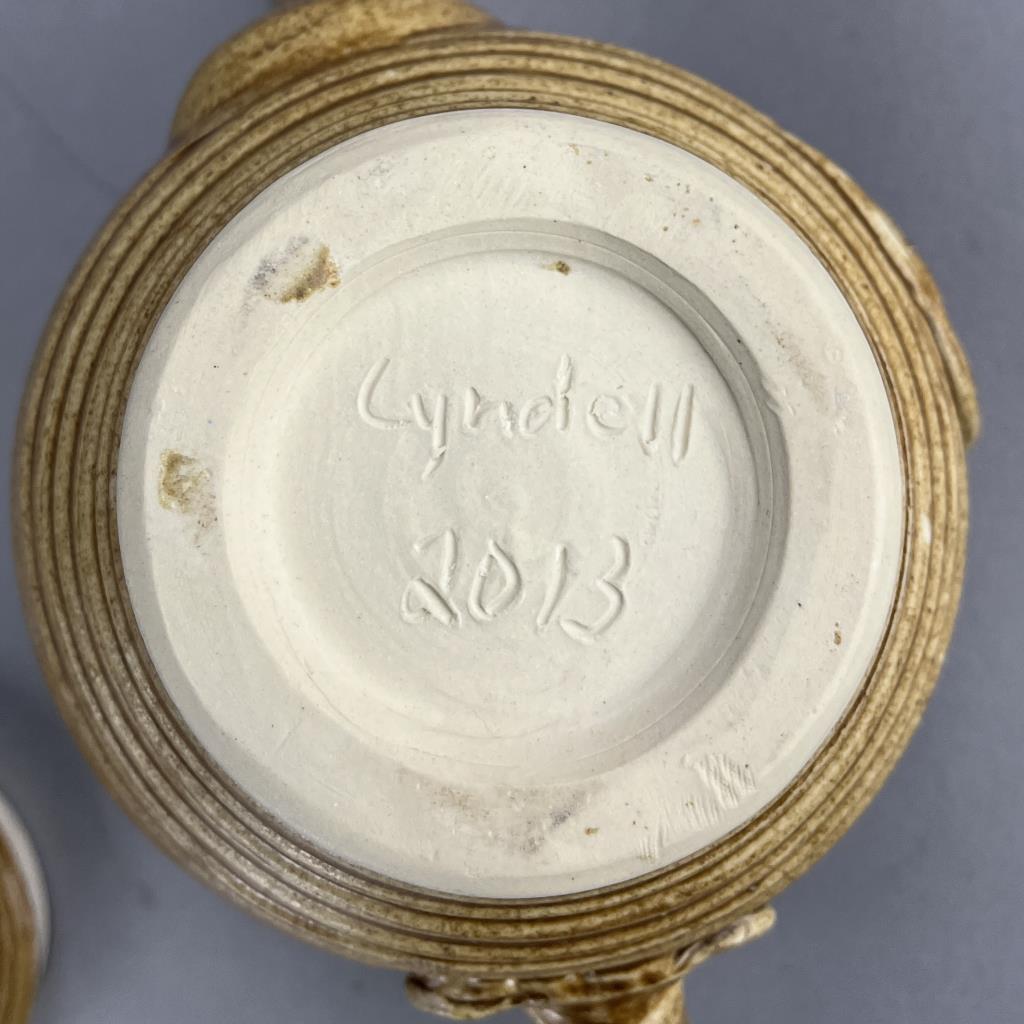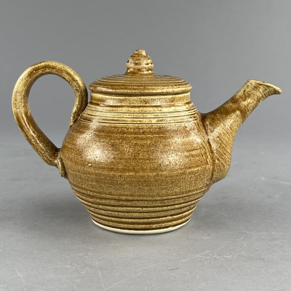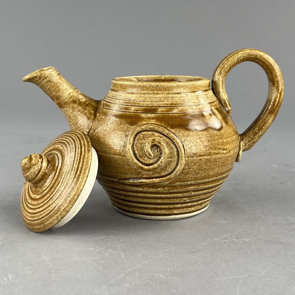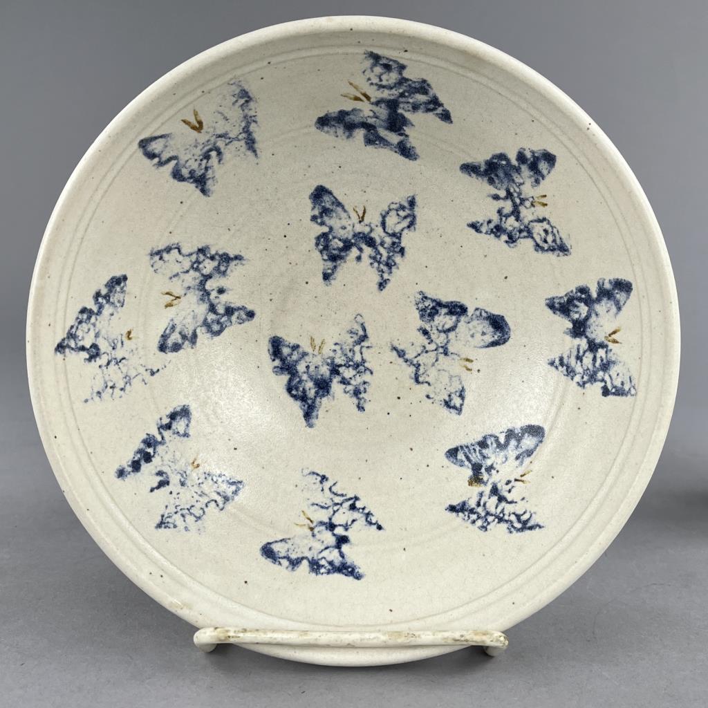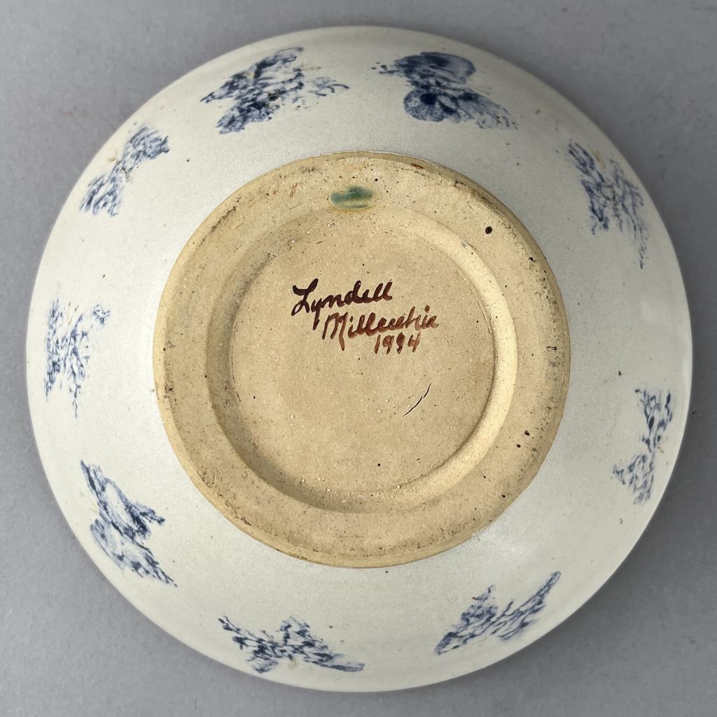 Five studio art pottery pieces, an 11-3/4″ (D) shallow serving bowl signed on the back “Cayton”, a lidded teapot signed on bottom “Cyndell 2013″, a 7-3/8” (D) bowl with sponge decorated butterflies and signed on bottom “Lyndell Milleuhia 1994”, and two caricature mugs each with a similar illegible stamped mark on bottom. CONDITION: SHIPPING: In-House Shipping Available. Please read our Shipping Policies and Terms and Conditions