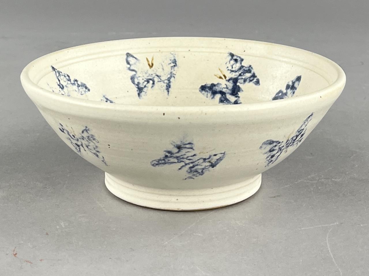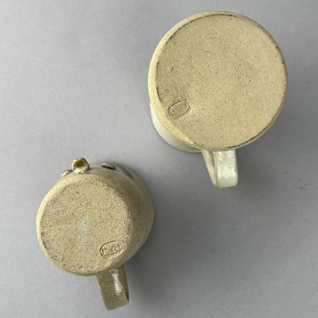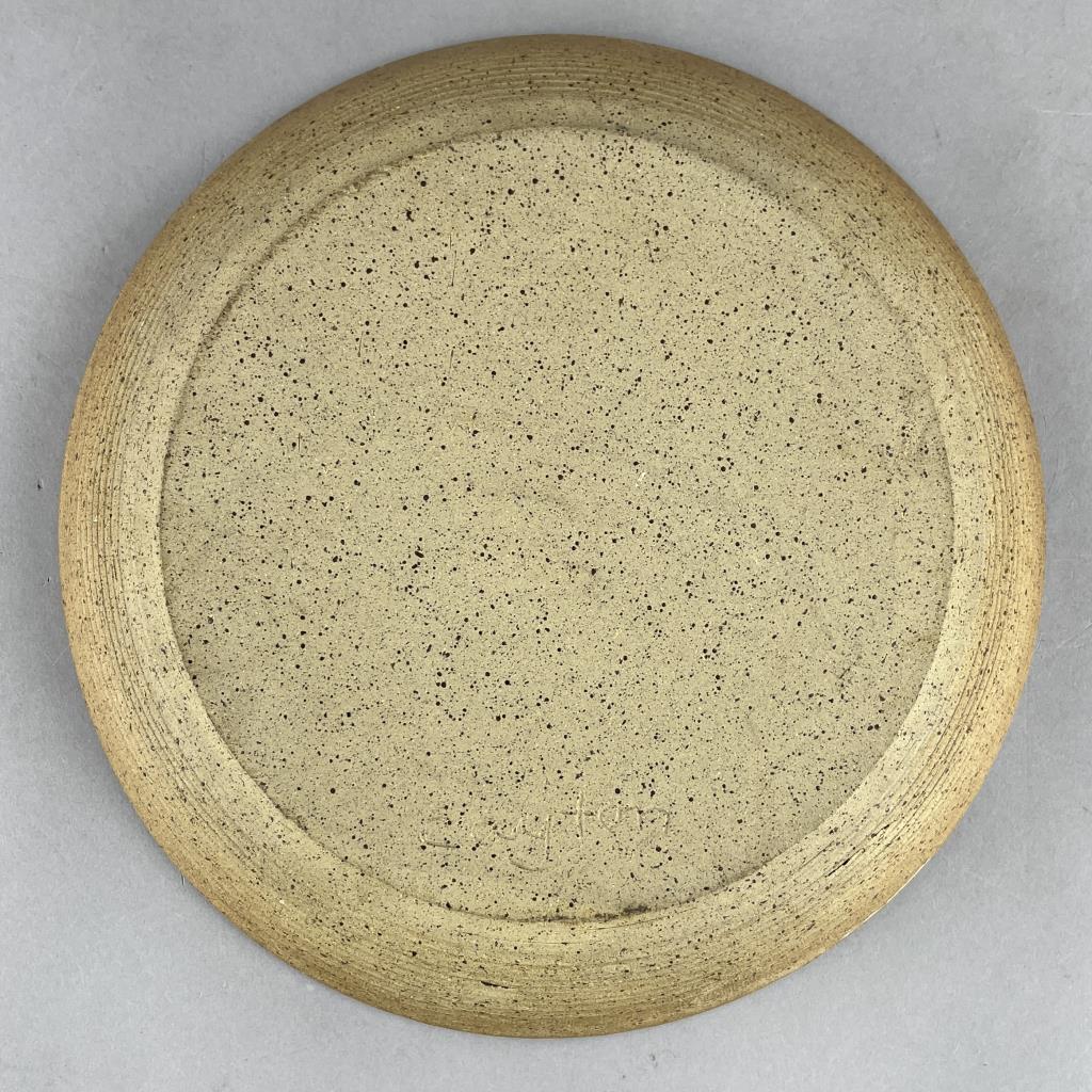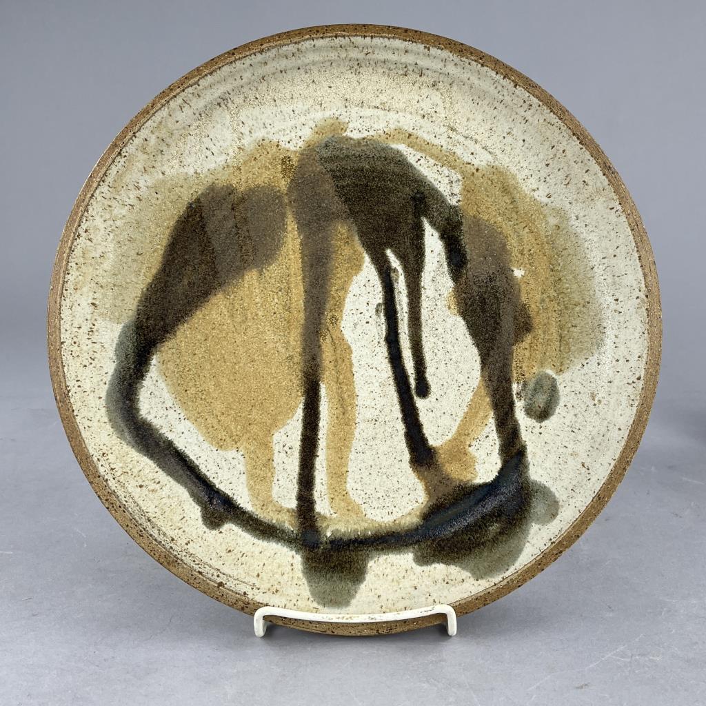Five studio art pottery pieces, an 11-3/4″ (D) shallow serving bowl signed on the back “Cayton”, a lidded teapot signed on bottom “Cyndell 2013″, a 7-3/8” (D) bowl with sponge decorated butterflies and signed on bottom “Lyndell Milleuhia 1994”, and two caricature mugs each with a similar illegible stamped mark on bottom. CONDITION: SHIPPING: In-House Shipping Available. Please read our Shipping Policies and Terms and Conditions
