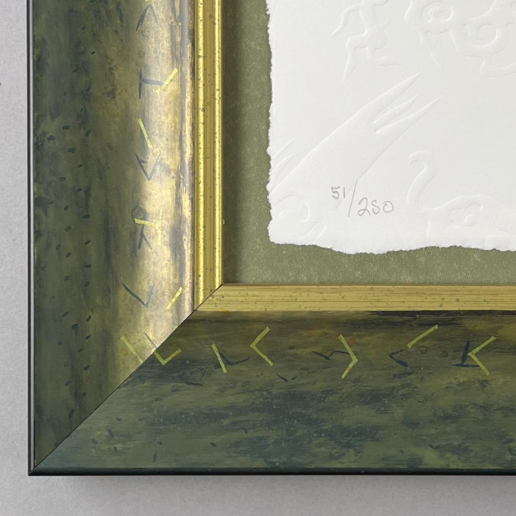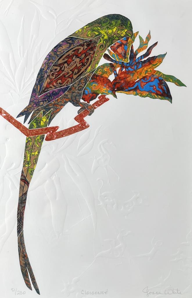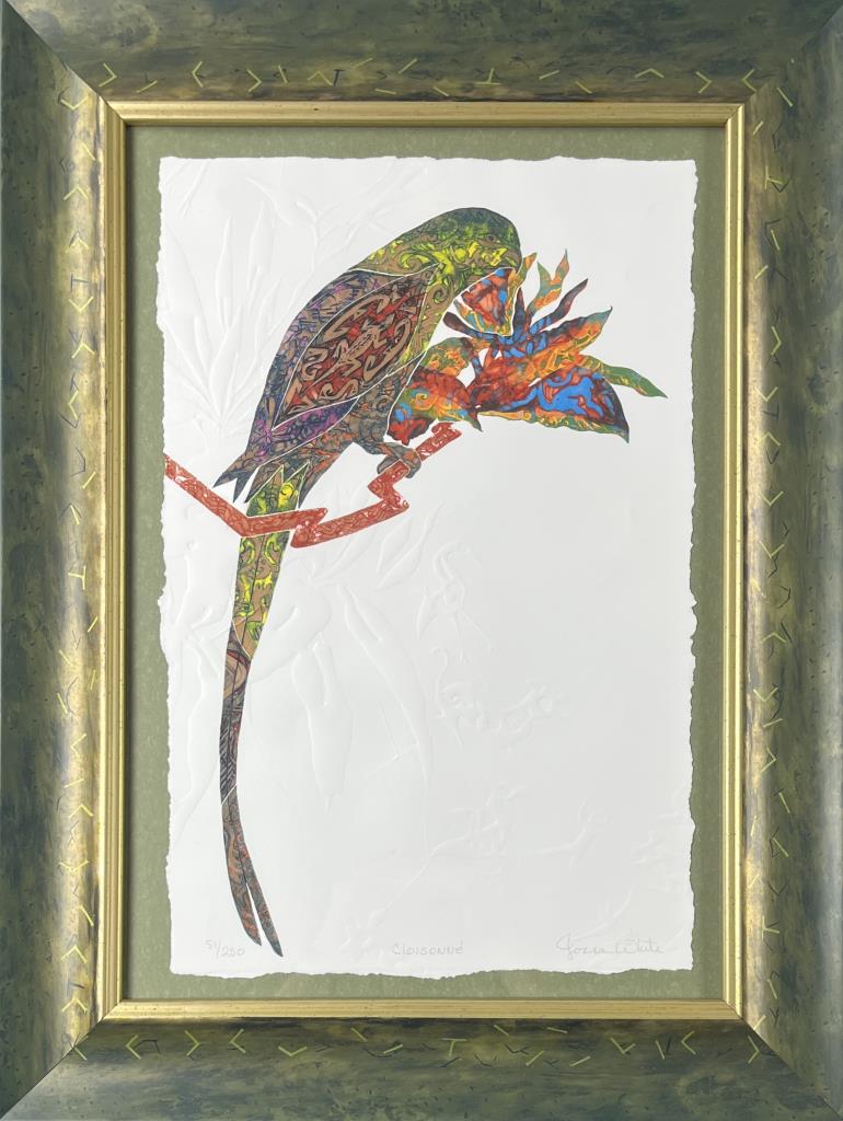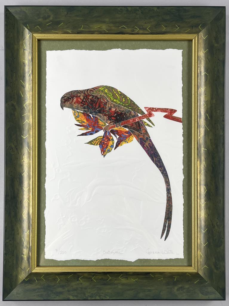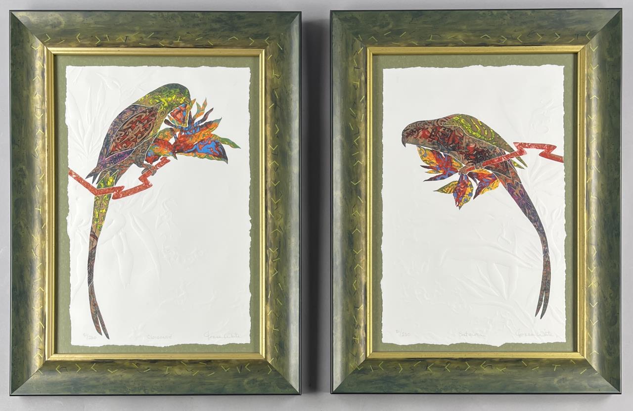 Two Jonna White (American, 1947-2024), limited edition, signed, numbered, and titled in pencil (lower edge), embossed and color prints featuring tropical parrots, one titled “Satsuma” (51/250) and the other “Cloisonne” (51/250), in matching painted and gilt wood frames each measuring 26-1/4″ x 19-15/26″. CONDITION: Not examined out of frames. SHIPPING: Local pick-up or third party shipping only for this lot. Please see the Shipping Policy for information on suggested shippers. We recommend the Pak Mail Store of Battle Creek to assist you. Please contact the shipper of your choice for shipping estimates on this lot. Refer to the Shipping section in our full Terms and Conditions for all information on shipping.