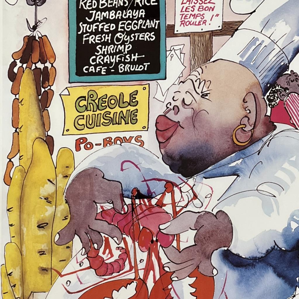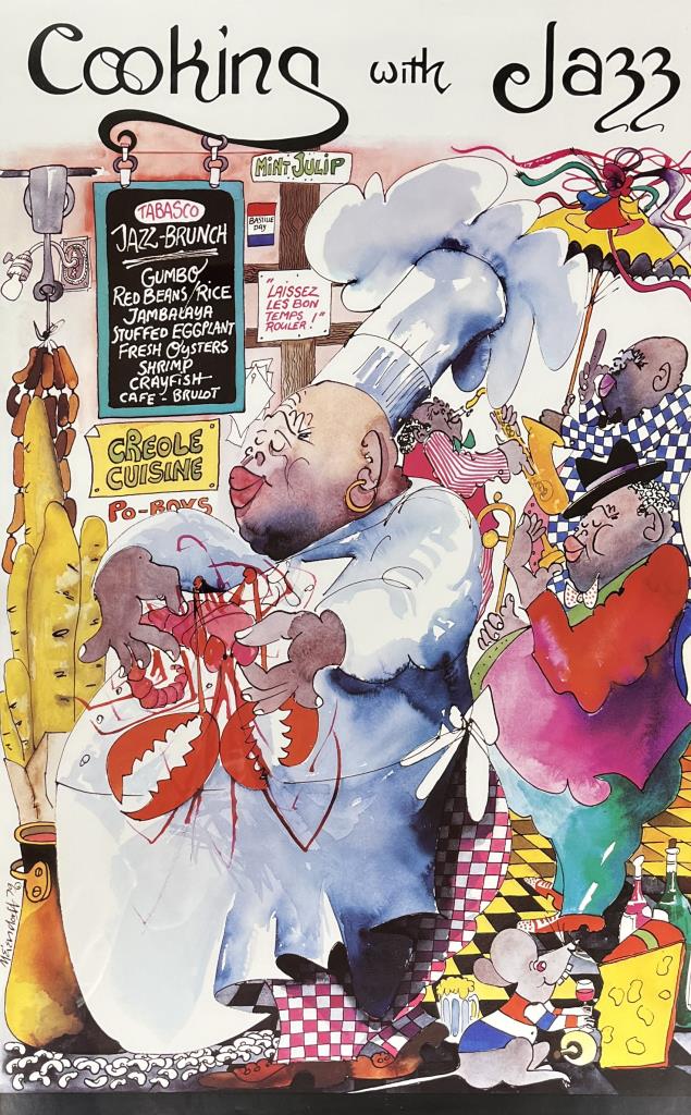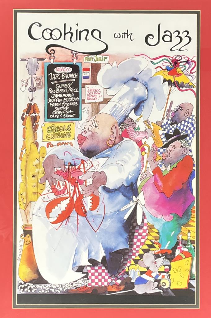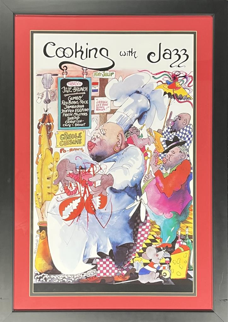 Leo Meiersdorff (German/America, 1934 – 1994), “Cooking With Jazz” poster, offset printed, in a black painted wood frame measuring 38-11/16″ x 27-1/8″. CONDITION: Not examined out of frame.Some minor scratching and chipping to frame. SHIPPING: Local pick-up or third party shipping only for this lot. Please see the Shipping Policy for information on suggested shippers. We recommend the Pak Mail Store of Battle Creek to assist you. Please contact the shipper of your choice for shipping estimates on this lot. Refer to the Shipping section in our full Terms and Conditions for all information on shipping.