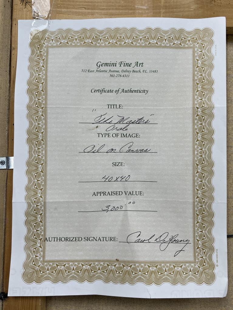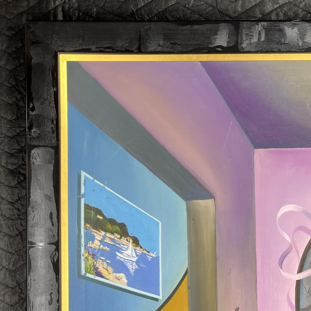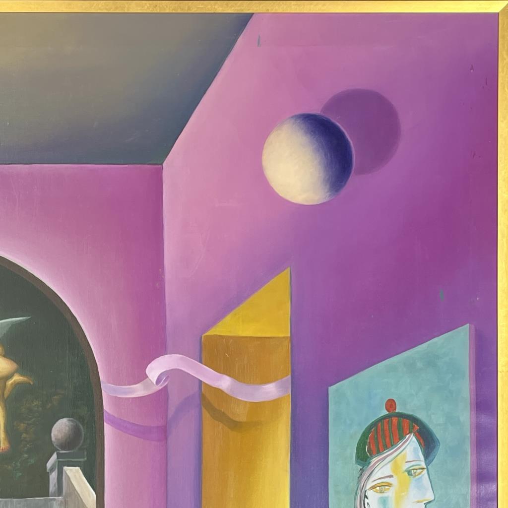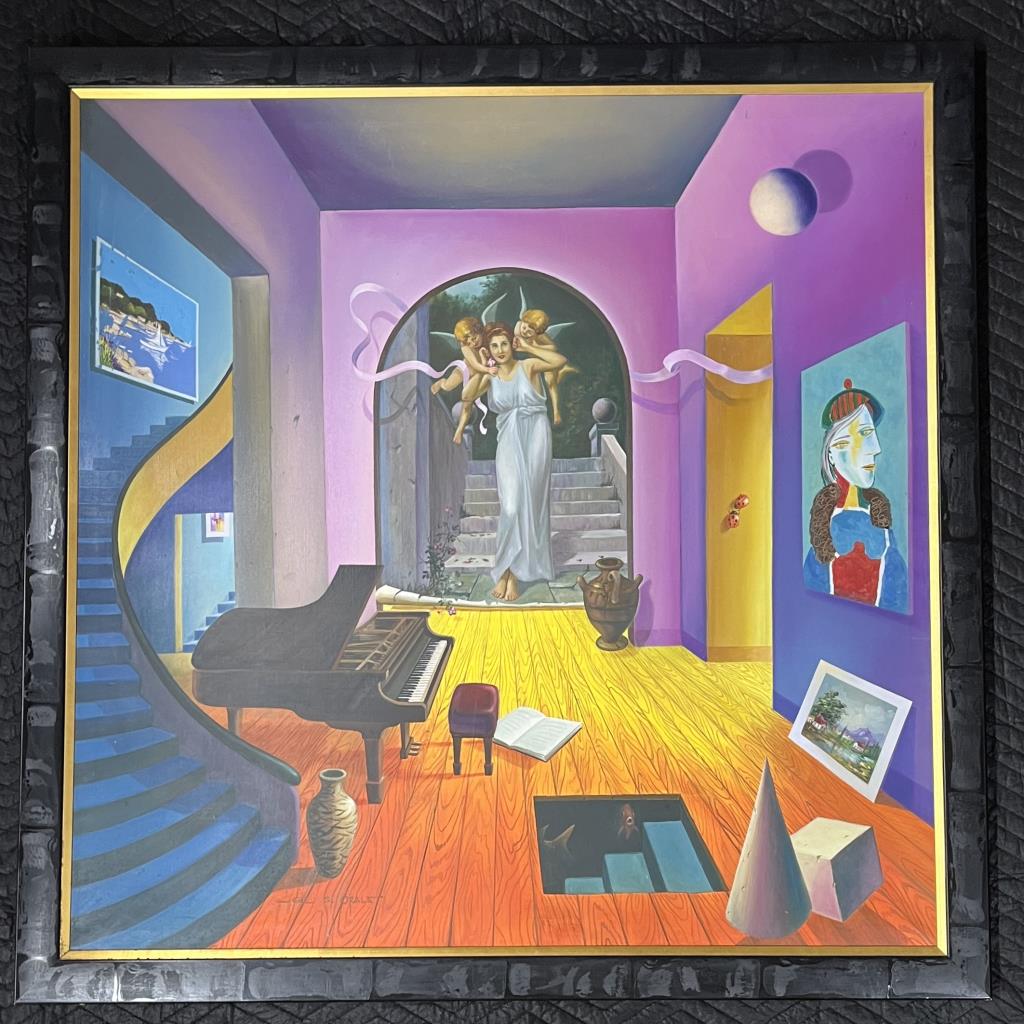 Copy of “Picasso & Angels,” the surrealist work by Alexander Astahov (Russian, b. 1955), oil on stretched canvas, signed lower left “Gil S. Orale,” in a black painted wood frame measuring 43-7/16″ square. Includes an undated appraisal. CONDITION: Scratching and flaking to artwork in upper left corner. Scratching and chipping to frame. Please see last photos. SHIPPING: Local pick-up or third party shipping only for this lot. Please see the Shipping Policy for information on suggested shippers. We recommend the Pak Mail Store of Battle Creek to assist you. Please contact the shipper of your choice for shipping estimates on this lot. Refer to the Shipping section in our full Terms and Conditions for all information on shipping.