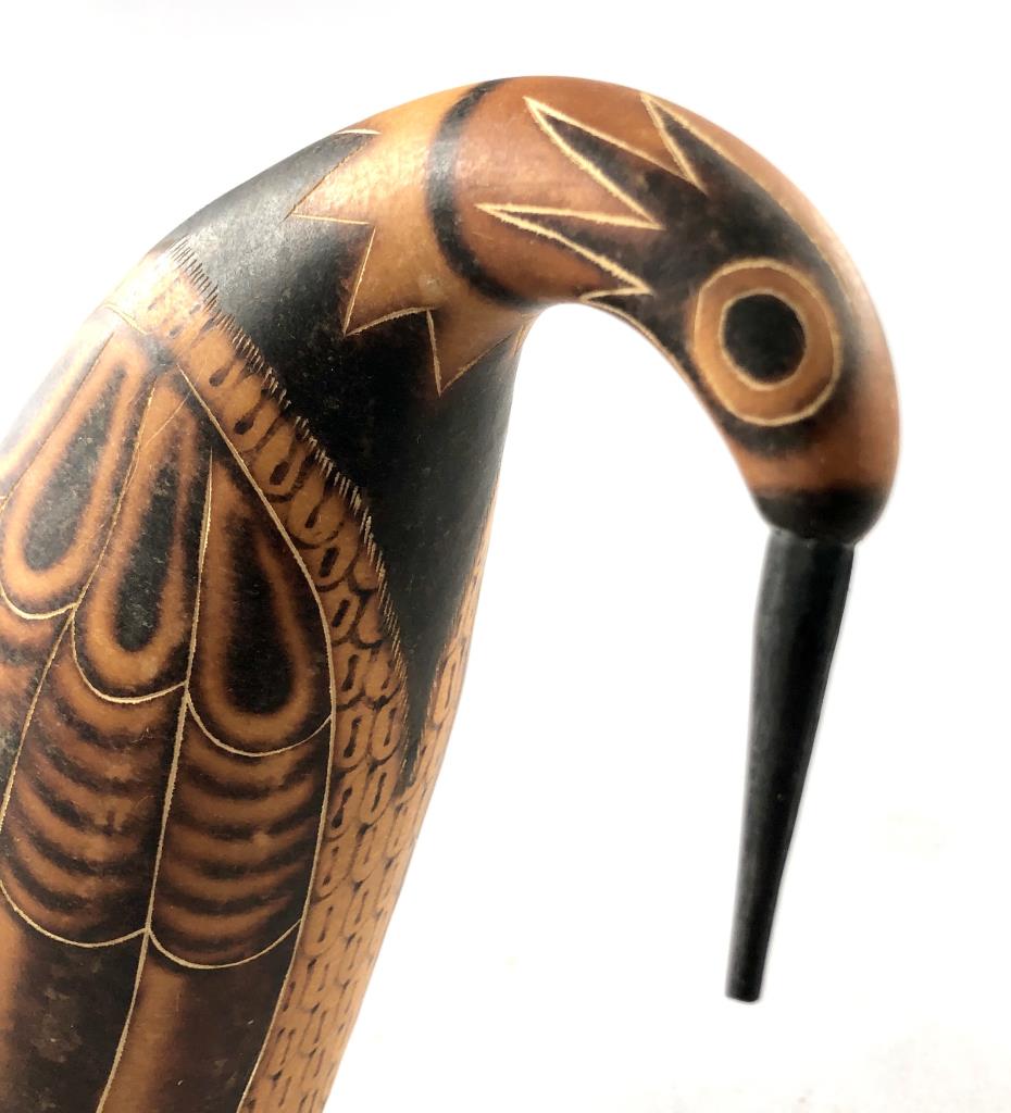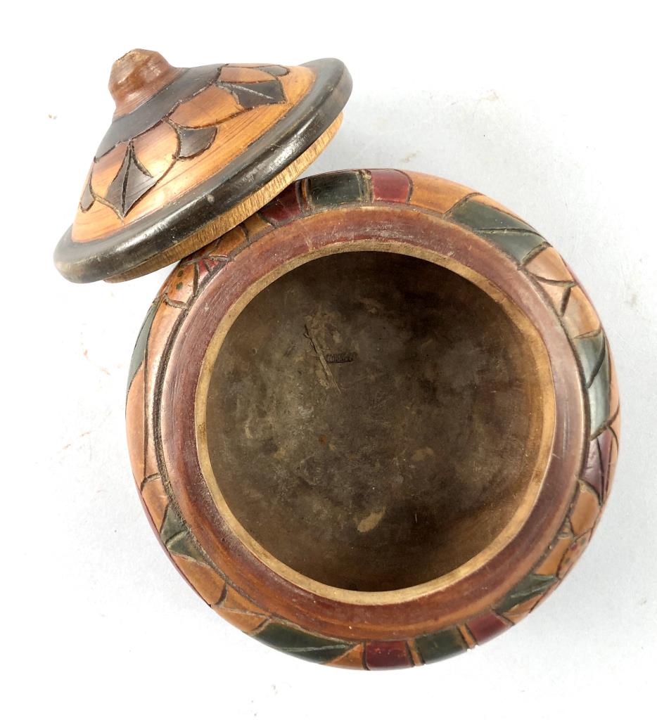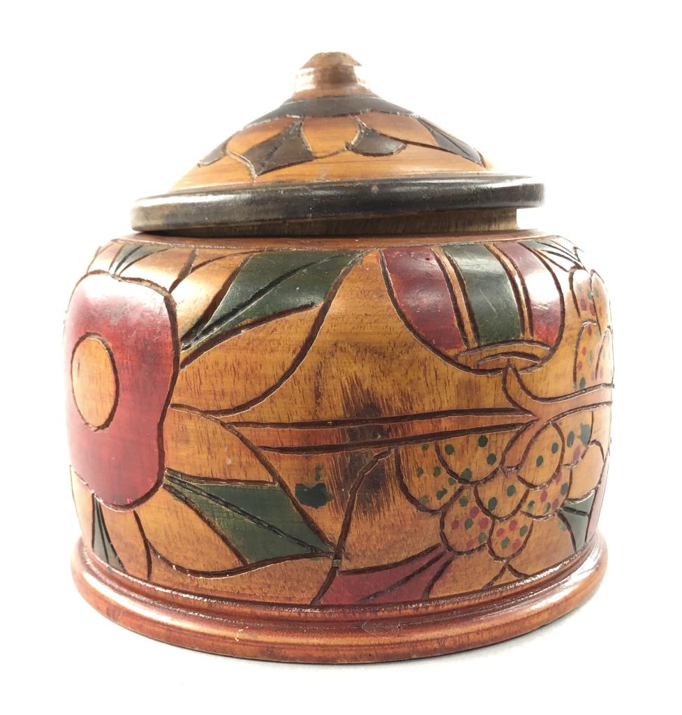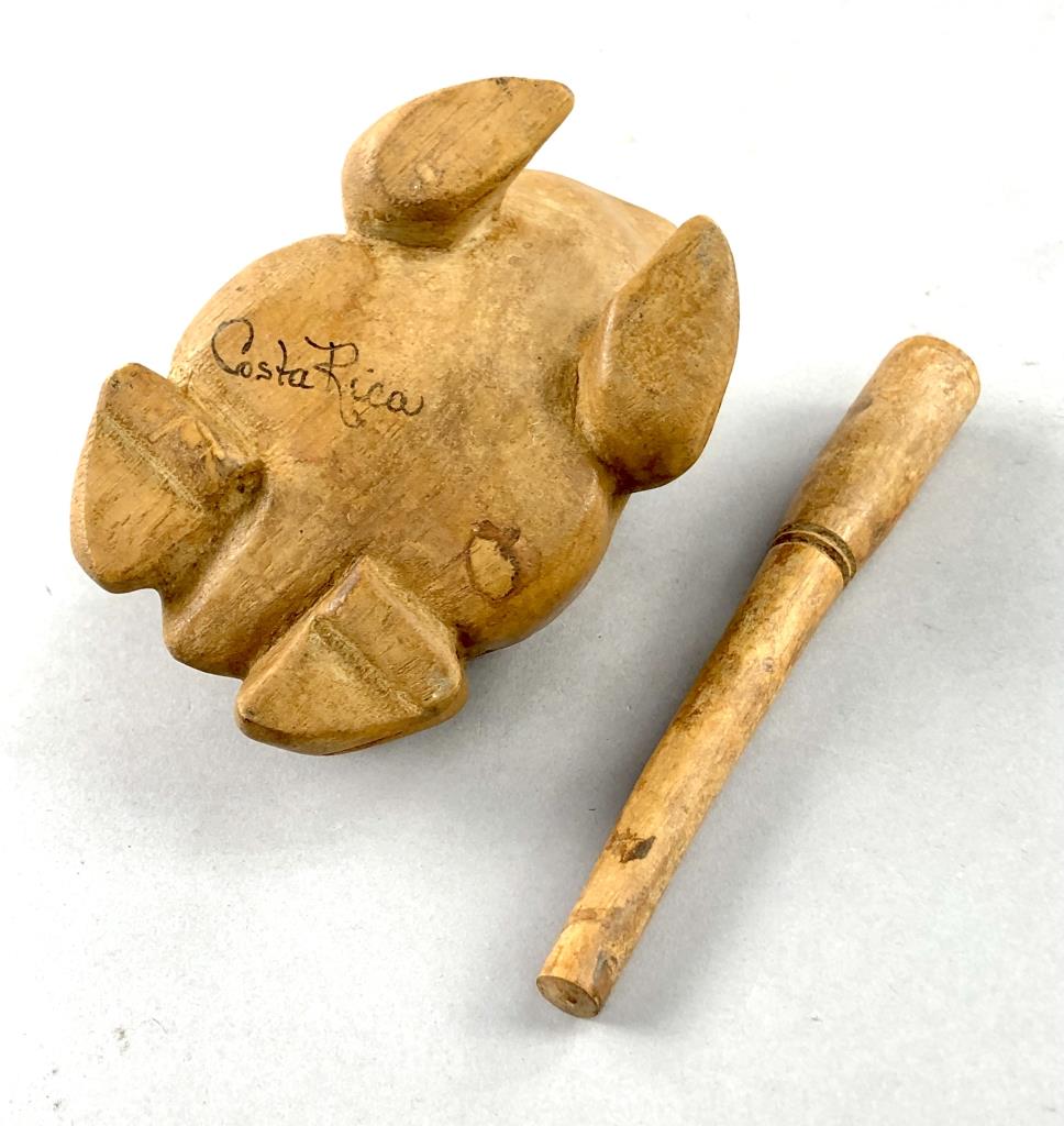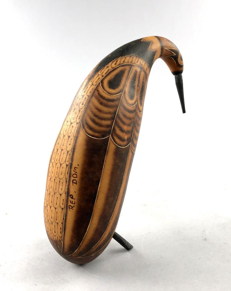 Three pieces of Caribbean folk art: 6-1/4″ (D) hand carved and hand painted turned round lidded bowl from St. Maarten; hand carved wood frog guiro from Costa Rica; and an 8-1/4″ (H) hand decorated gourd, in the form of a bird, from the Dominican Republic. CONDITION: SHIPPING: In-House Shipping Available. Please read our Shipping Policies and Terms and Conditions
