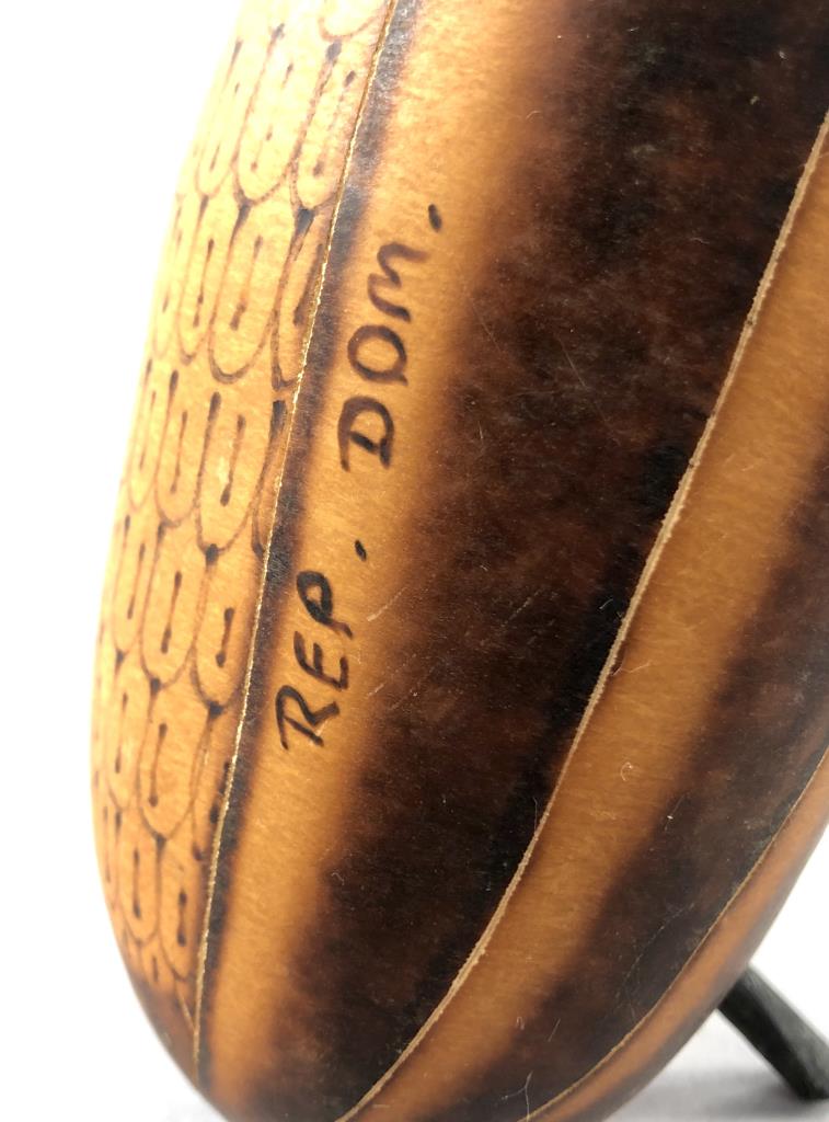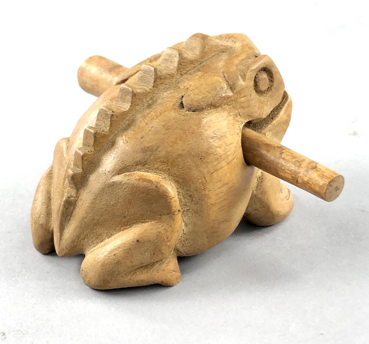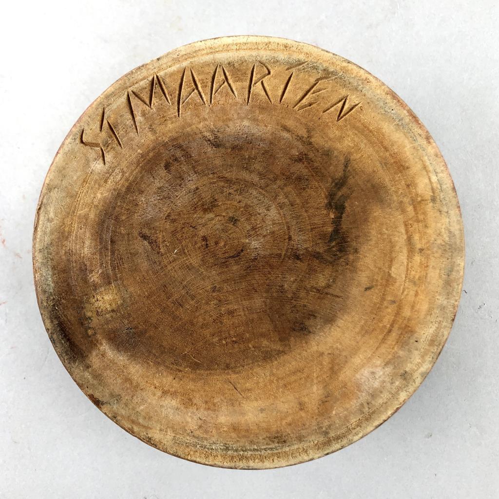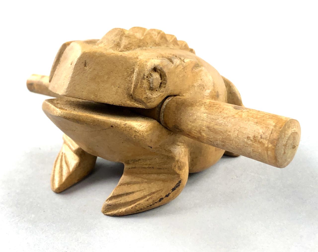 Three pieces of Caribbean folk art: 6-1/4″ (D) hand carved and hand painted turned round lidded bowl from St. Maarten; hand carved wood frog guiro from Costa Rica; and an 8-1/4″ (H) hand decorated gourd, in the form of a bird, from the Dominican Republic. CONDITION: SHIPPING: In-House Shipping Available. Please read our Shipping Policies and Terms and Conditions