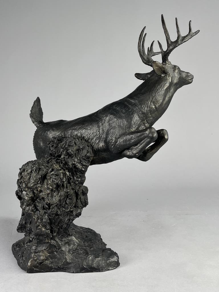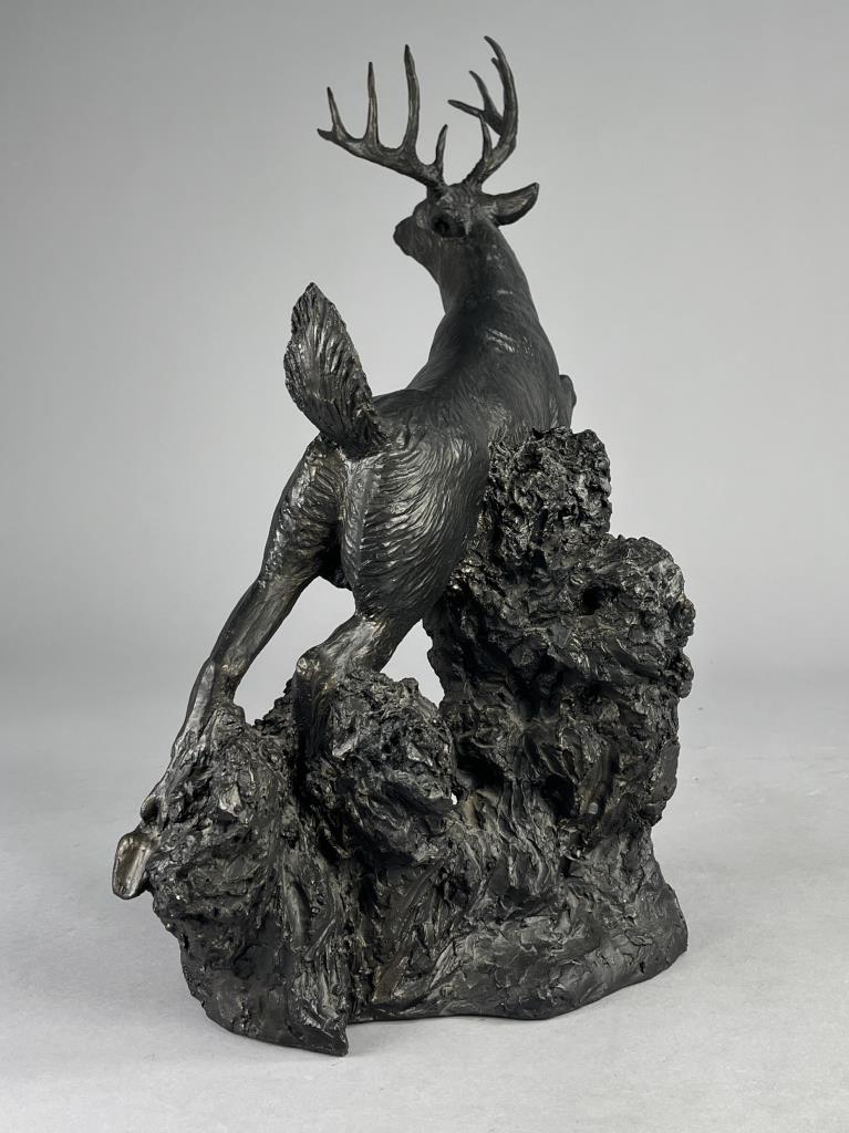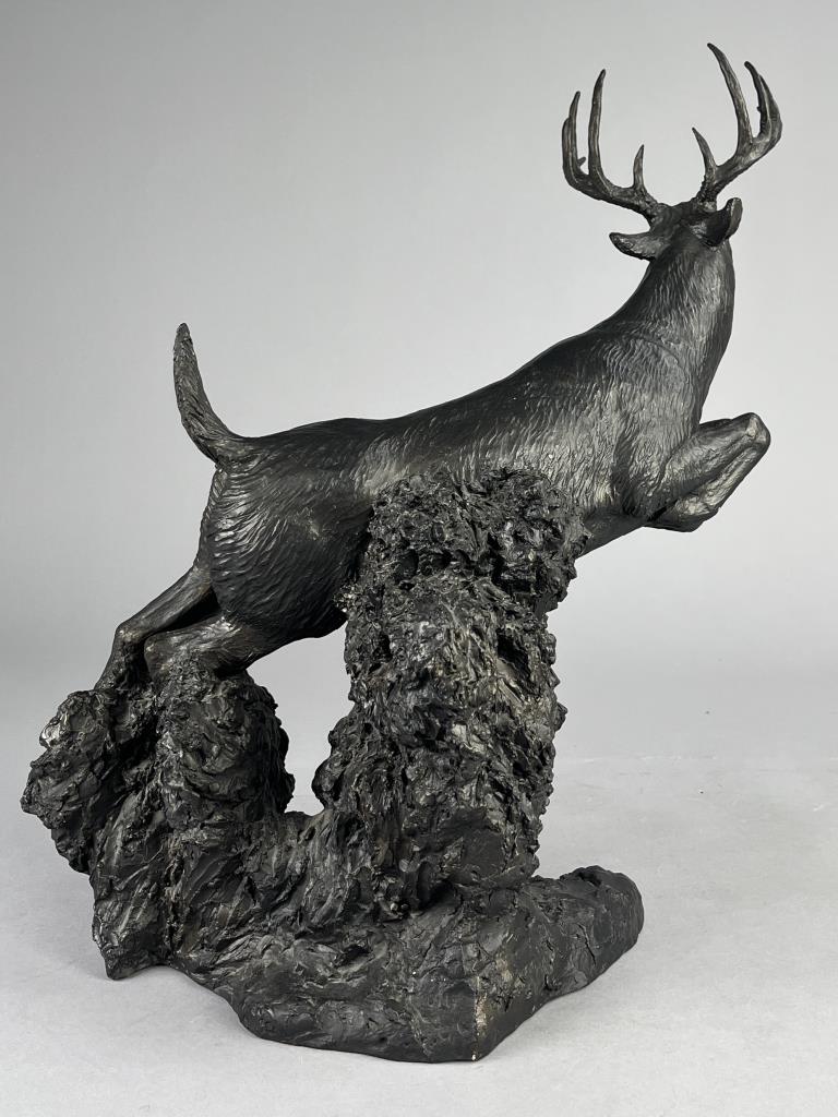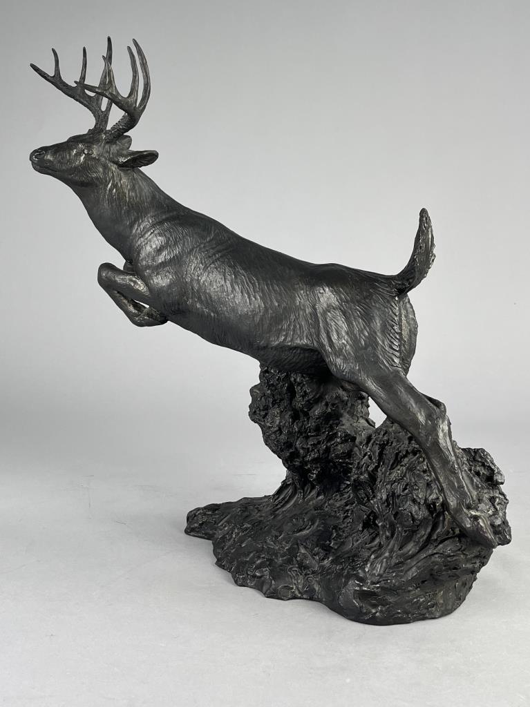 Rusty Phelps (American, b. 1936), figure of a leaping White Tailed deer, circa mid to late 20th Century, signed at base “Rusty Phelps ©”, cold cast “bronzed” resin, approximately 11-1/4″ (D) x 16-3/4″ (W) x 18-3/4″ (H). CONDITION: Some minor very chipping. SHIPPING: Local pick-up or third party shipping only for this lot. Please see the Shipping Policy for information on suggested shippers. We recommend the Pak Mail Store of Battle Creek to assist you. Please contact the shipper of your choice for shipping estimates on this lot. Refer to the Shipping section in our full Terms and Conditions for all information on shipping.