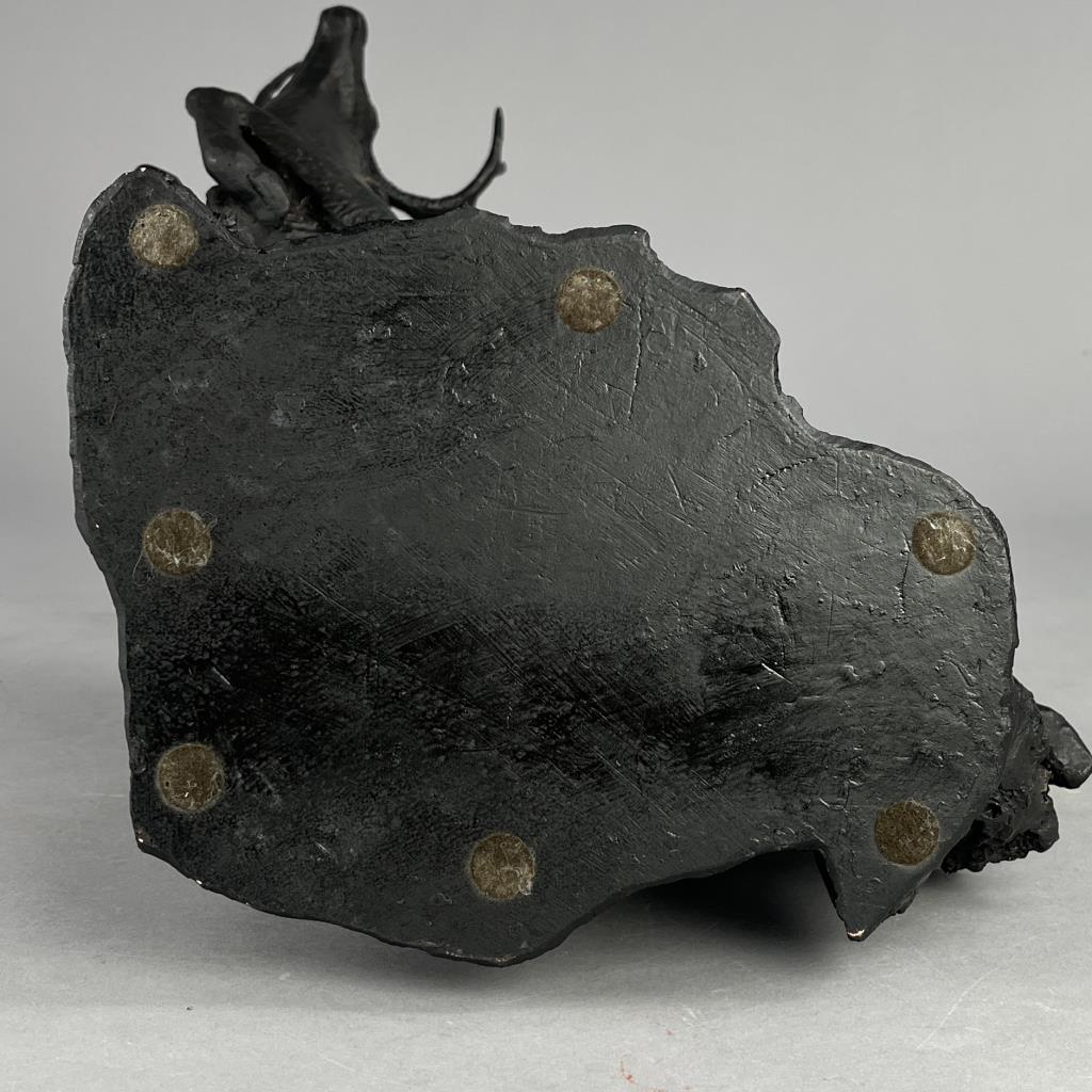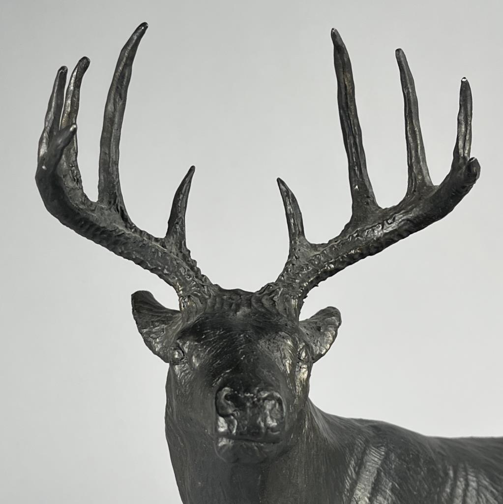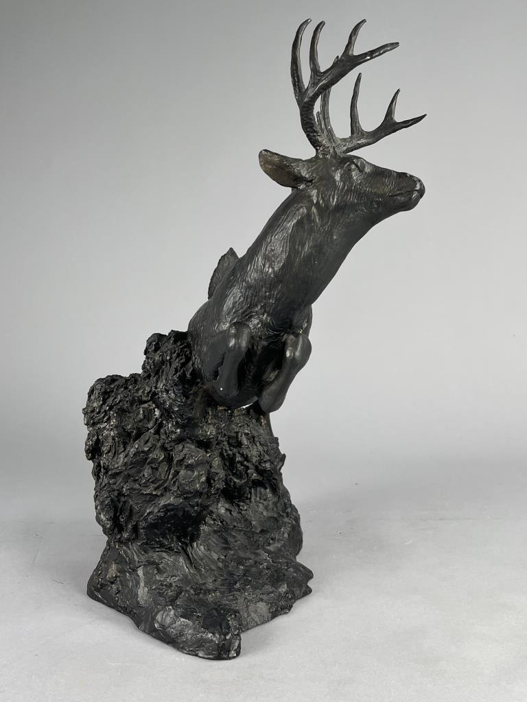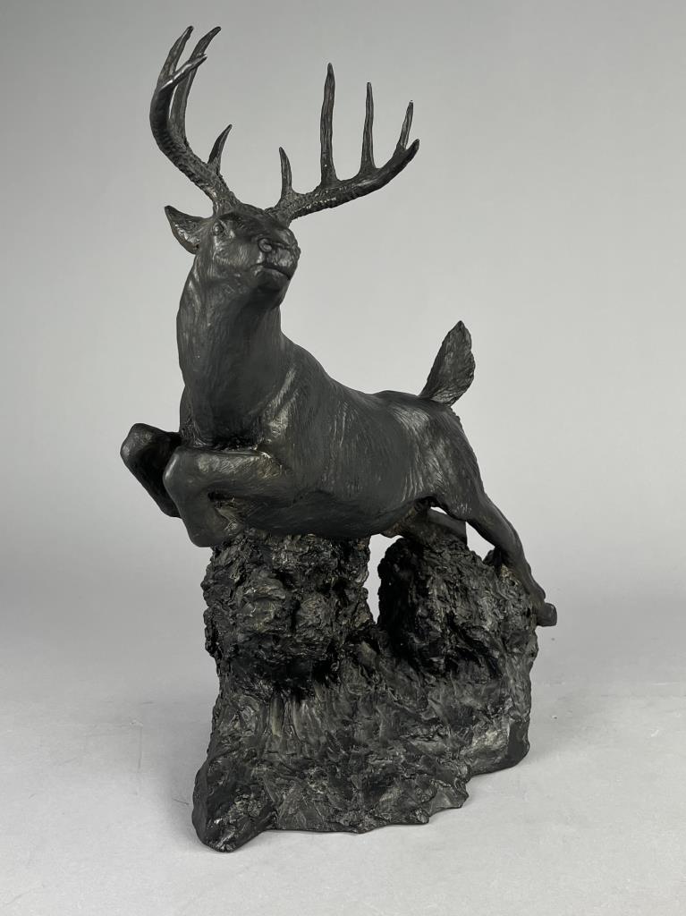 Rusty Phelps (American, b. 1936), figure of a leaping White Tailed deer, circa mid to late 20th Century, signed at base “Rusty Phelps ©”, cold cast “bronzed” resin, approximately 11-1/4″ (D) x 16-3/4″ (W) x 18-3/4″ (H). CONDITION: Some minor very chipping. SHIPPING: Local pick-up or third party shipping only for this lot. Please see the Shipping Policy for information on suggested shippers. We recommend the Pak Mail Store of Battle Creek to assist you. Please contact the shipper of your choice for shipping estimates on this lot. Refer to the Shipping section in our full Terms and Conditions for all information on shipping.
