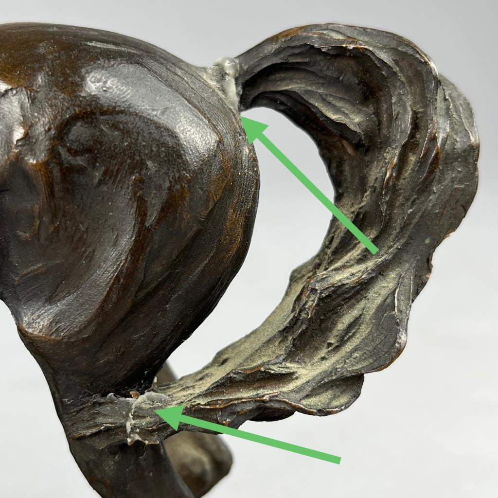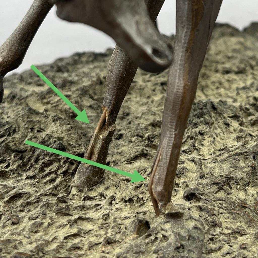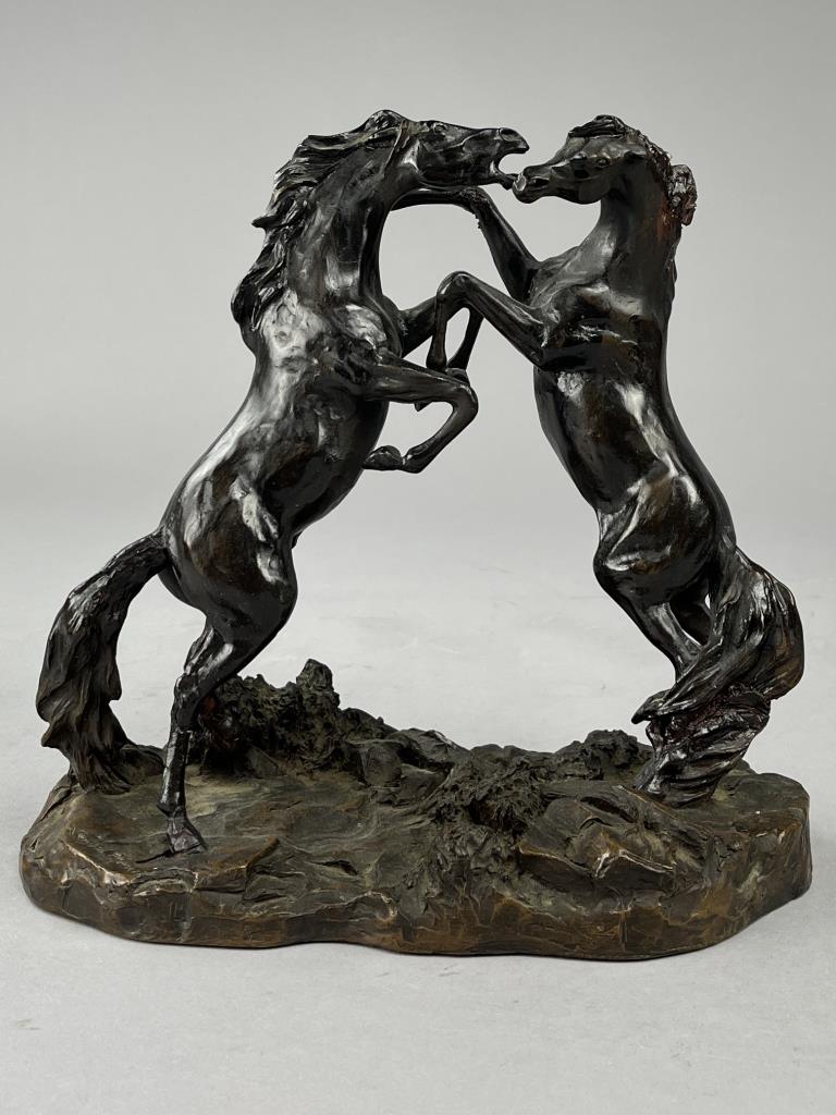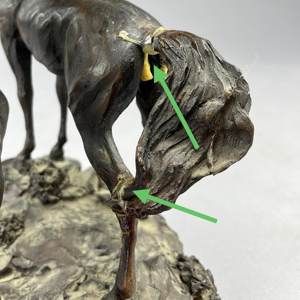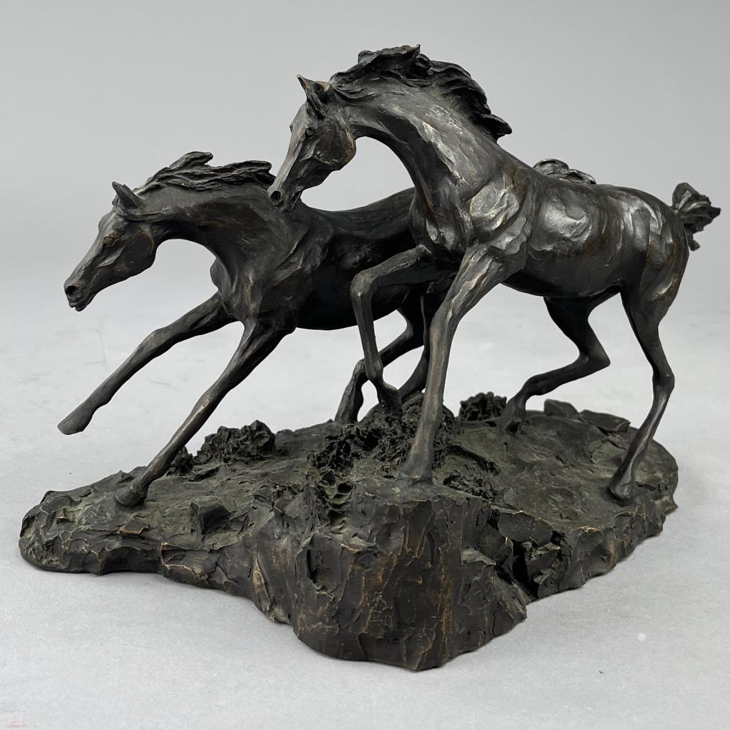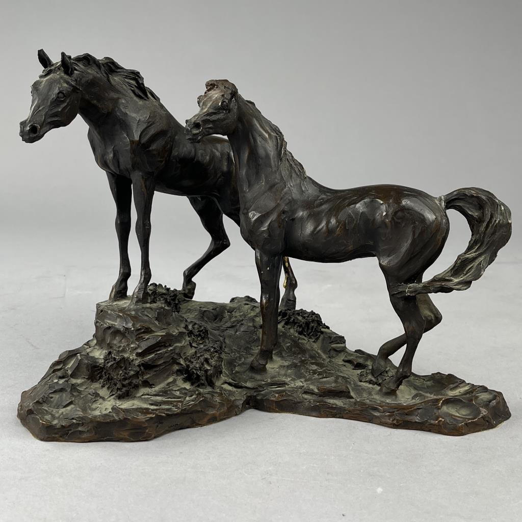 Four Langford Monroe (American, 1950-2000) horse sculptures: “Challenging Stallions” (1983); “Intruder” (1984); “Morning on the Montana Plains” (1984); and “Foaling Time” (1984). Signed on bases, labeled on bottoms, cast composite, the largest is approximately 10″ (H). CONDITION: Each statue has damage, in some cases there have been repairs and restorations, please see photos. SHIPPING: Local pick-up or third party shipping only for this lot. Please see the Shipping Policy for information on suggested shippers. We recommend the Pak Mail Store of Battle Creek to assist you. Please contact the shipper of your choice for shipping estimates on this lot. Refer to the Shipping section in our full Terms and Conditions for all information on shipping.