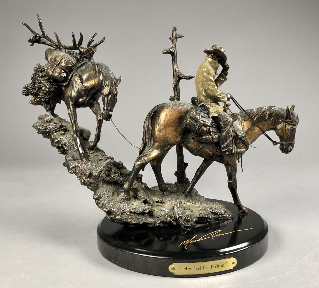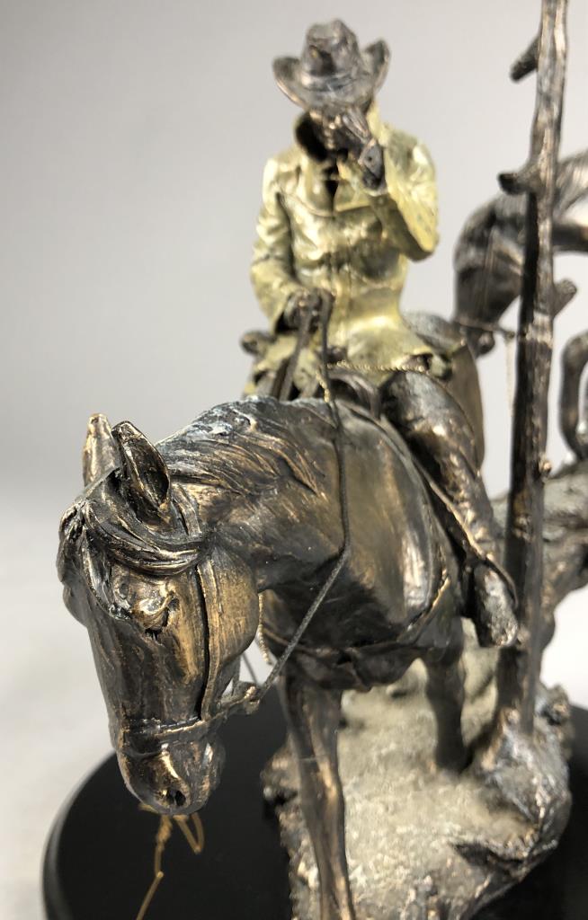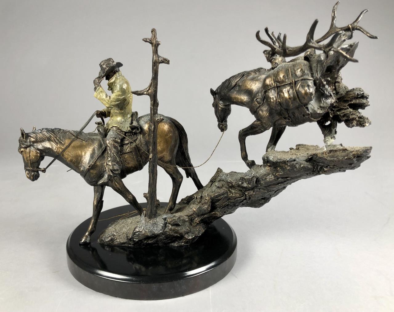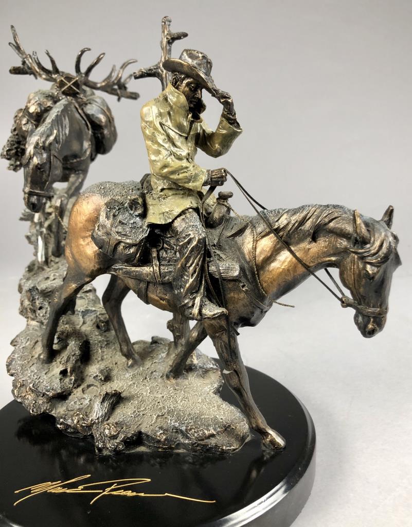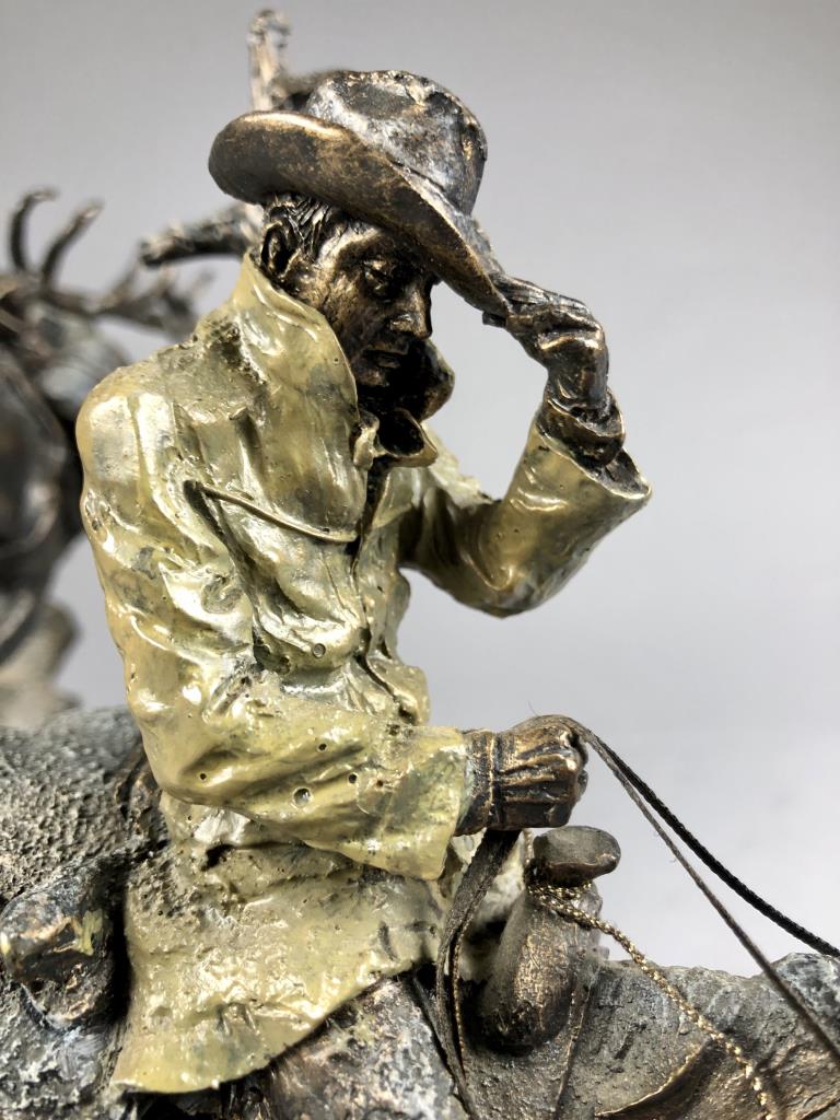 Marc Pierce (American, b. 1961), figure of a Western cowboy on horseback, for Big Sky Carvers, dated 2006, signed at base “Marc Pierce” and labeled on bottom, cold cast “bronzed” resin, approximately 11-3/4″ (D) x 16″ (W) x 12″ (H). CONDITION: Significant damage, please see photos. SHIPPING: Local pick-up or third party shipping only for this lot. Please see the Shipping Policy for information on suggested shippers. We recommend the Pak Mail Store of Battle Creek to assist you. Please contact the shipper of your choice for shipping estimates on this lot. Refer to the Shipping section in our full Terms and Conditions for all information on shipping.