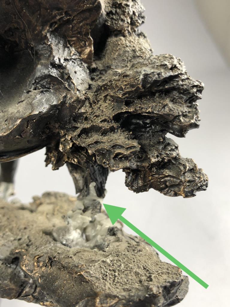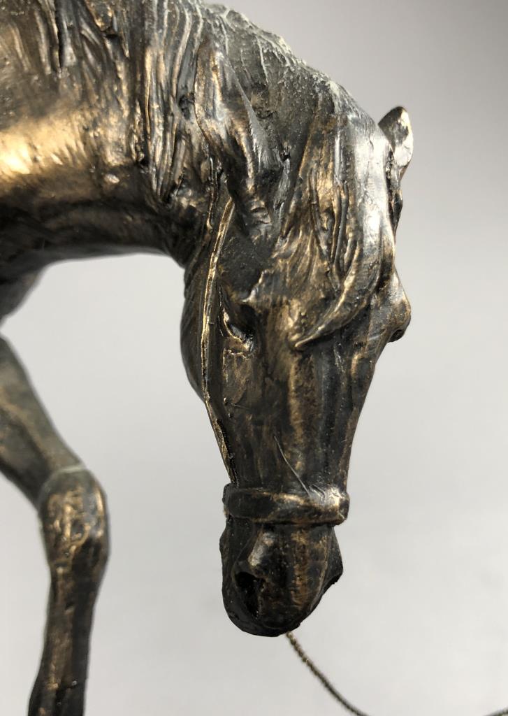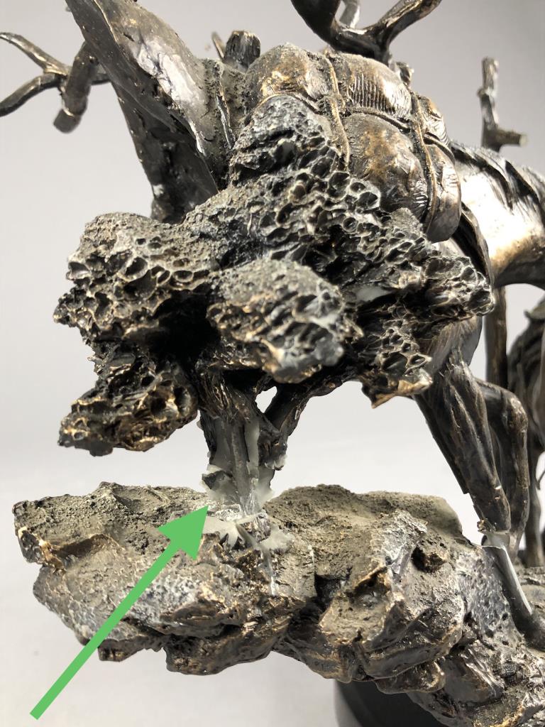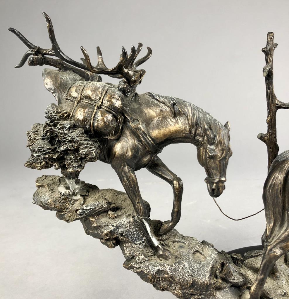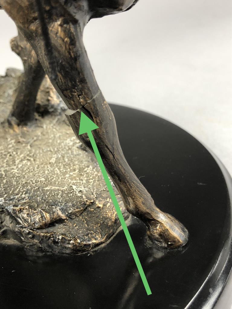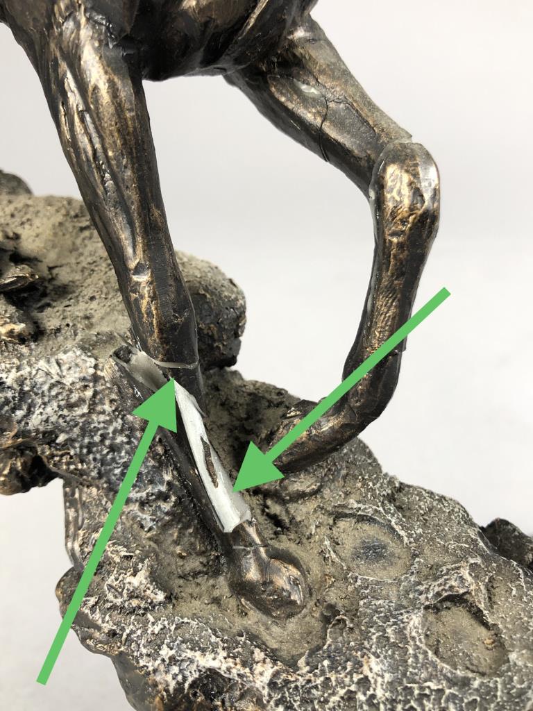 Marc Pierce (American, b. 1961), figure of a Western cowboy on horseback, for Big Sky Carvers, dated 2006, signed at base “Marc Pierce” and labeled on bottom, cold cast “bronzed” resin, approximately 11-3/4″ (D) x 16″ (W) x 12″ (H). CONDITION: Significant damage, please see photos. SHIPPING: Local pick-up or third party shipping only for this lot. Please see the Shipping Policy for information on suggested shippers. We recommend the Pak Mail Store of Battle Creek to assist you. Please contact the shipper of your choice for shipping estimates on this lot. Refer to the Shipping section in our full Terms and Conditions for all information on shipping.