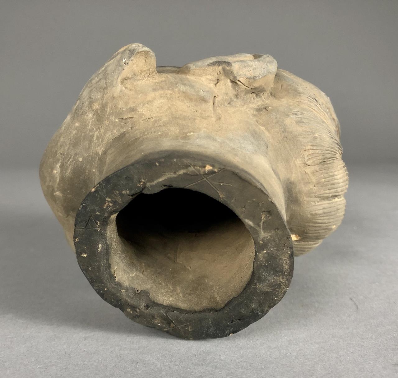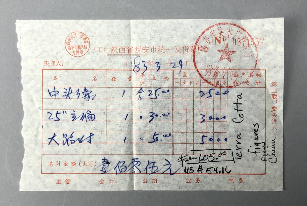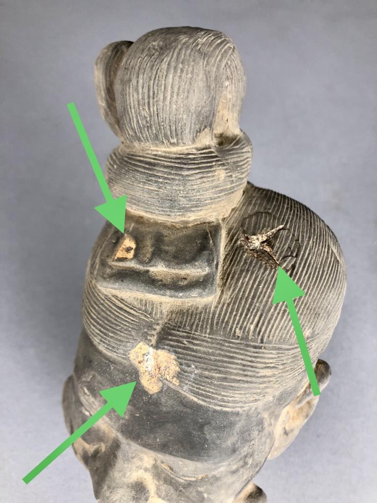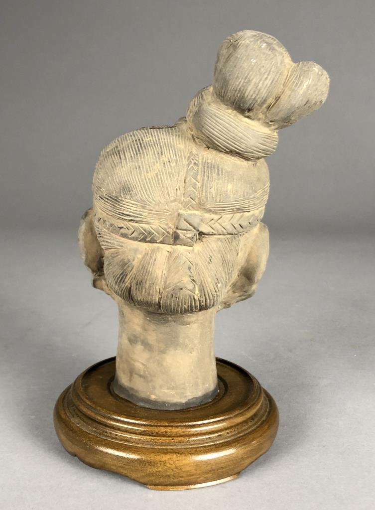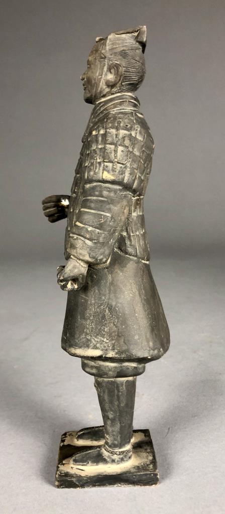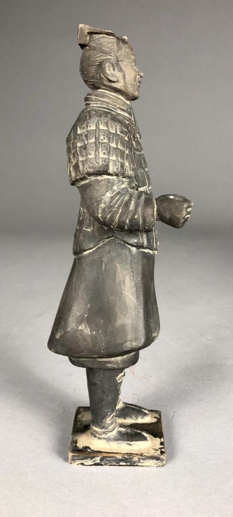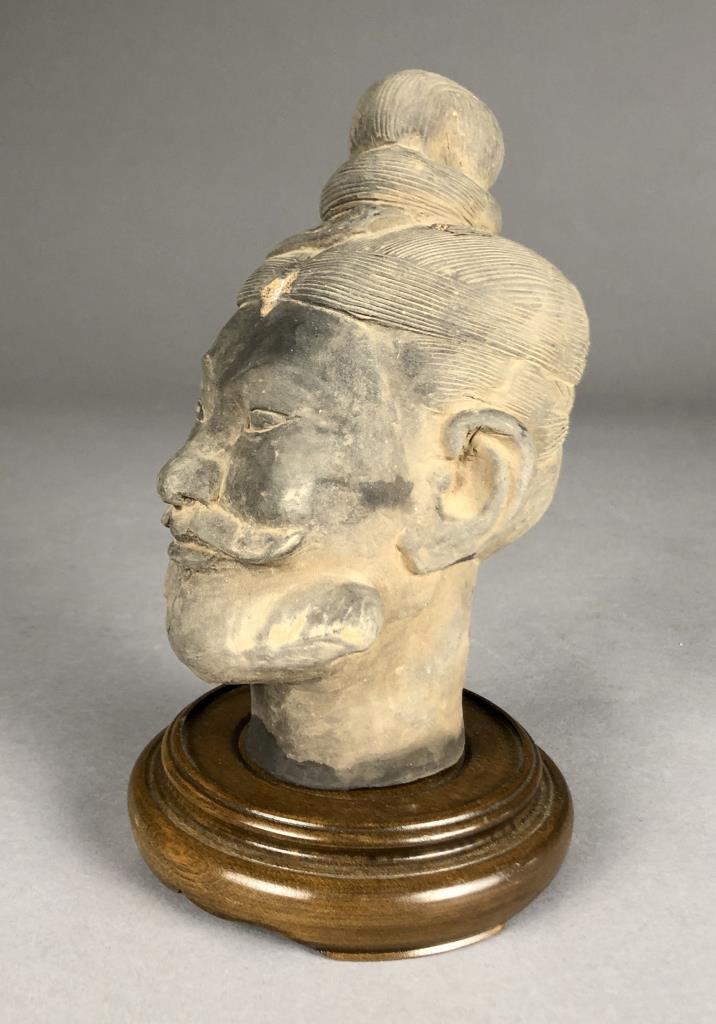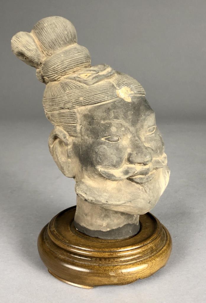 Chinese terracotta warrior replica figure (9-1/8″ H) and bust (6-7/8″ H) on wood base, possibly purchased in China. CONDITION: Damage to one finger on left hand of figure. Damage to forehead and top of bust. SHIPPING: In-House Shipping Available. Please read our Shipping Policies and Terms and Conditions