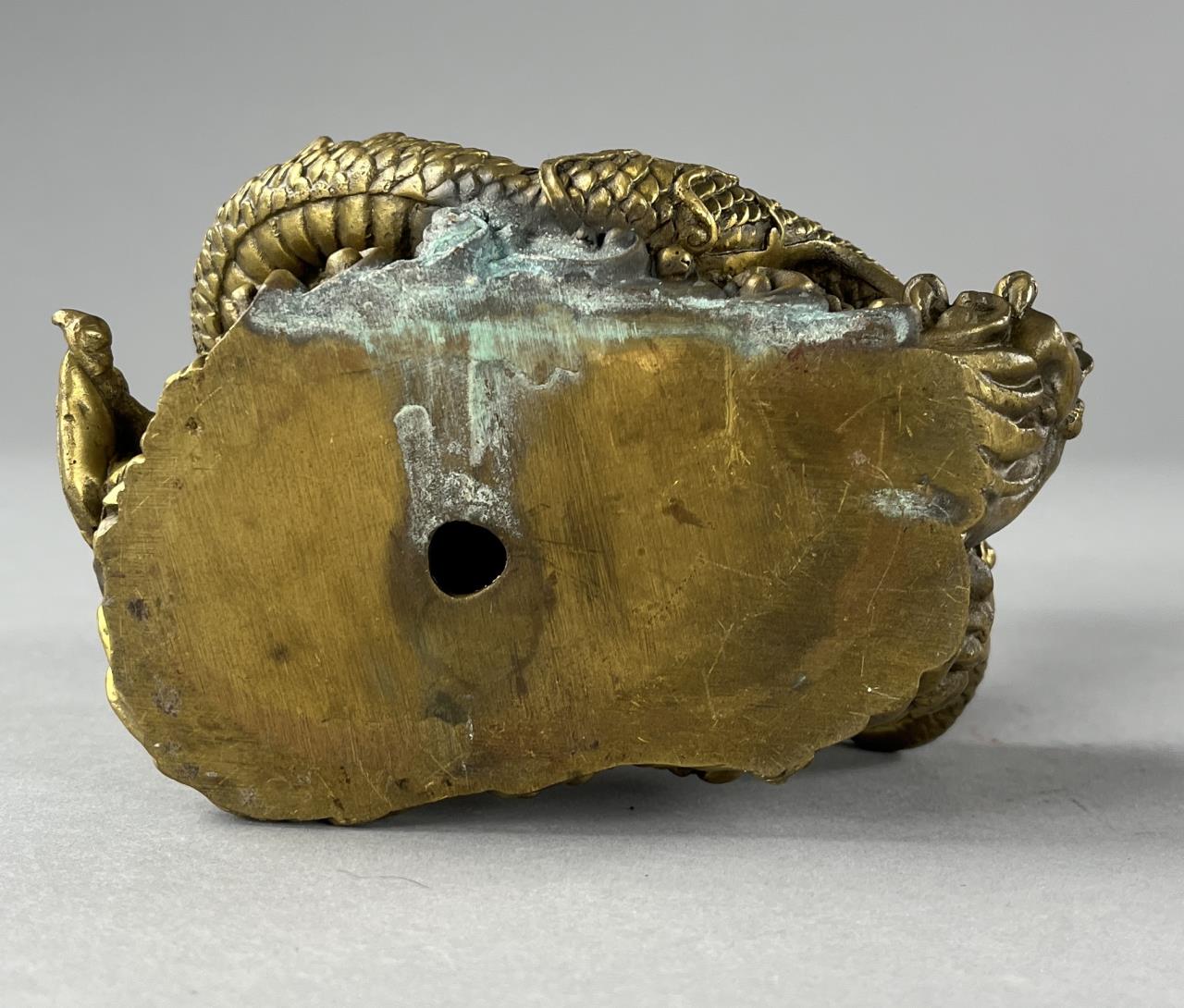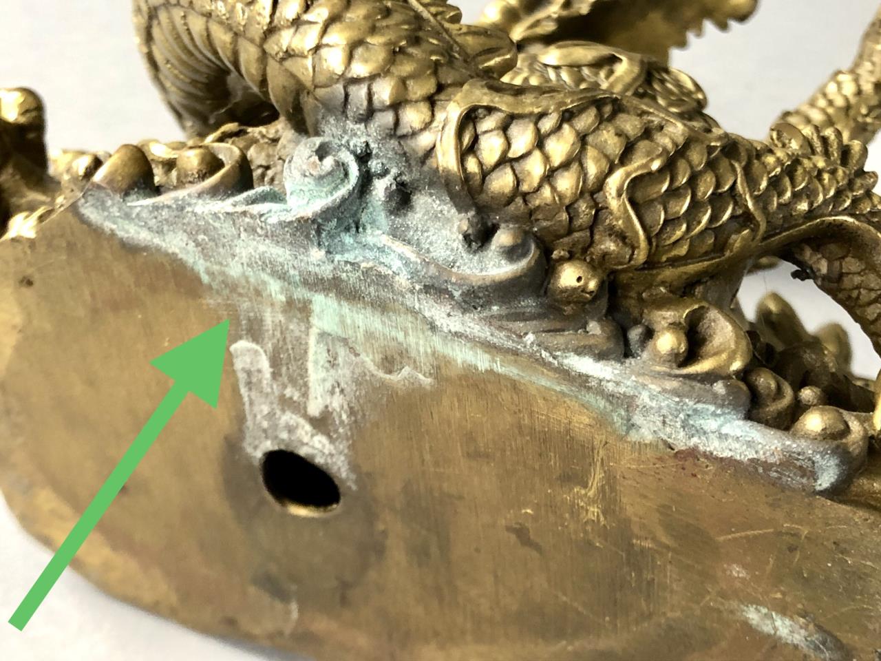 Solid brass five claw dragon, with antique bronze finish, sitting atop scrolling clouds, grasping the pearl of wisdom, purchased from Gump’s in 2002, approximately 7-1/4″ H. CONDITION: Some corrosion to brass at base. SHIPPING: In-House Shipping Available. Please read our Shipping Policies and Terms and Conditions