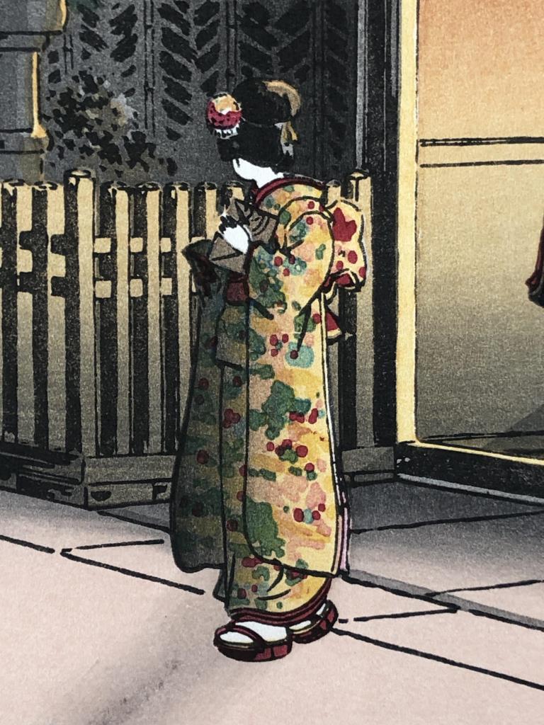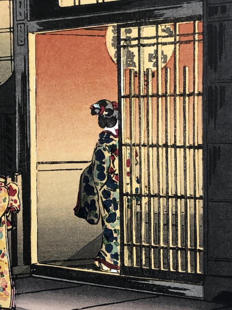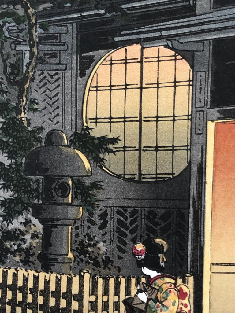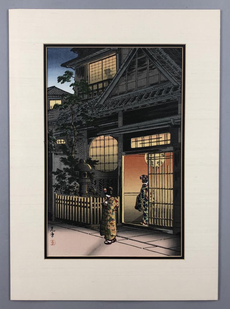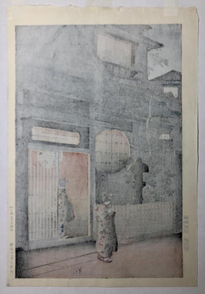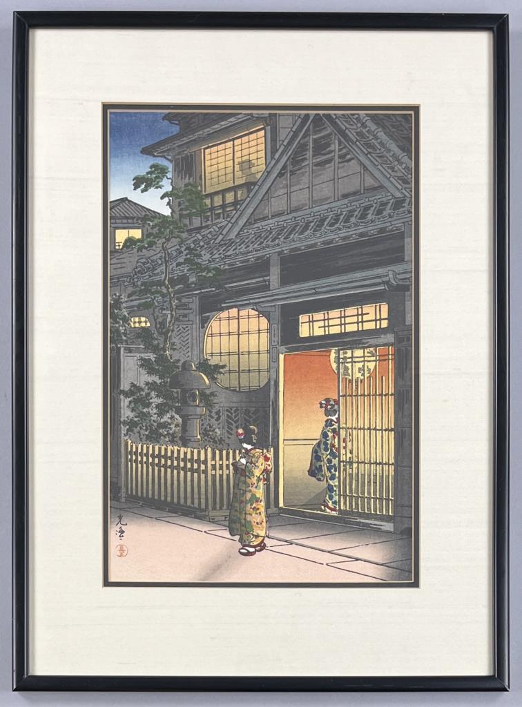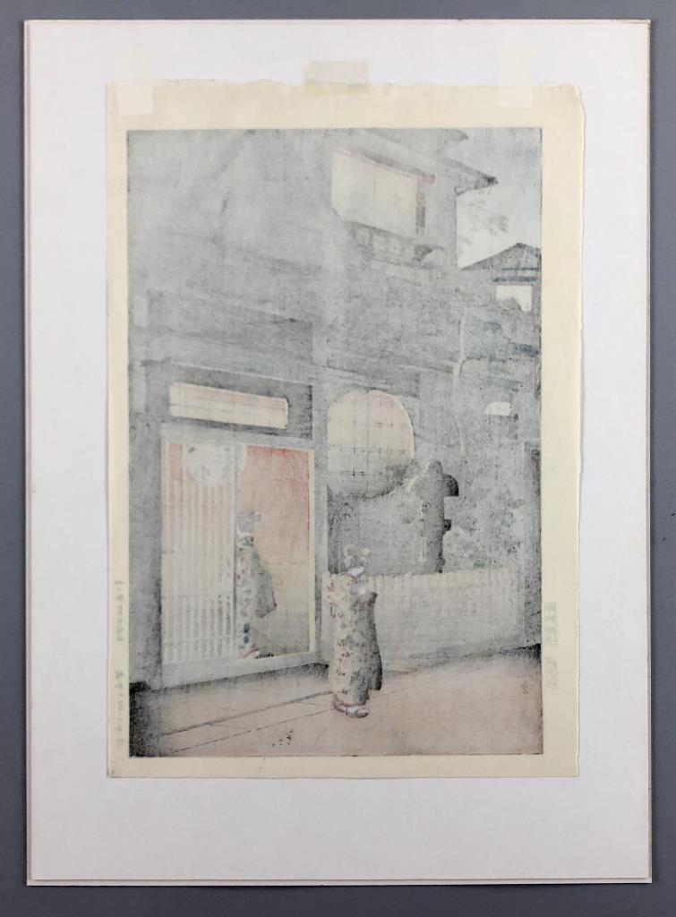 Tsuchiya Koitsu (Japanese, 1870 – 1949), color Shin-hanga woodblock print, titled “Yotsuya Araki Yokocho,” from the “Tokyo Views” series, first published in 1935, in a black painted wood and gesso frame measuring 20-1/2″ x 15″. CONDITION: SHIPPING: In-House Shipping Available. Please read our Shipping Policies and Terms and Conditions