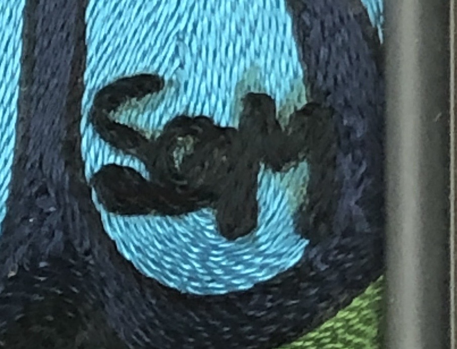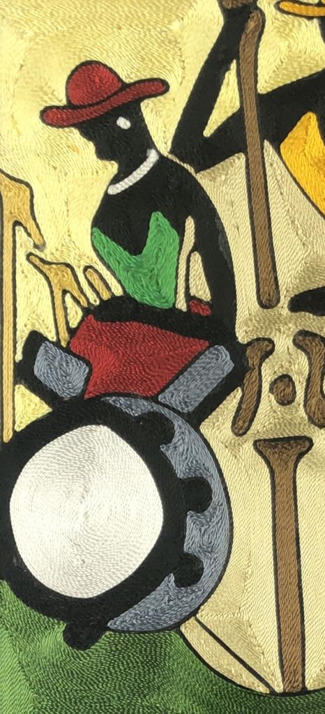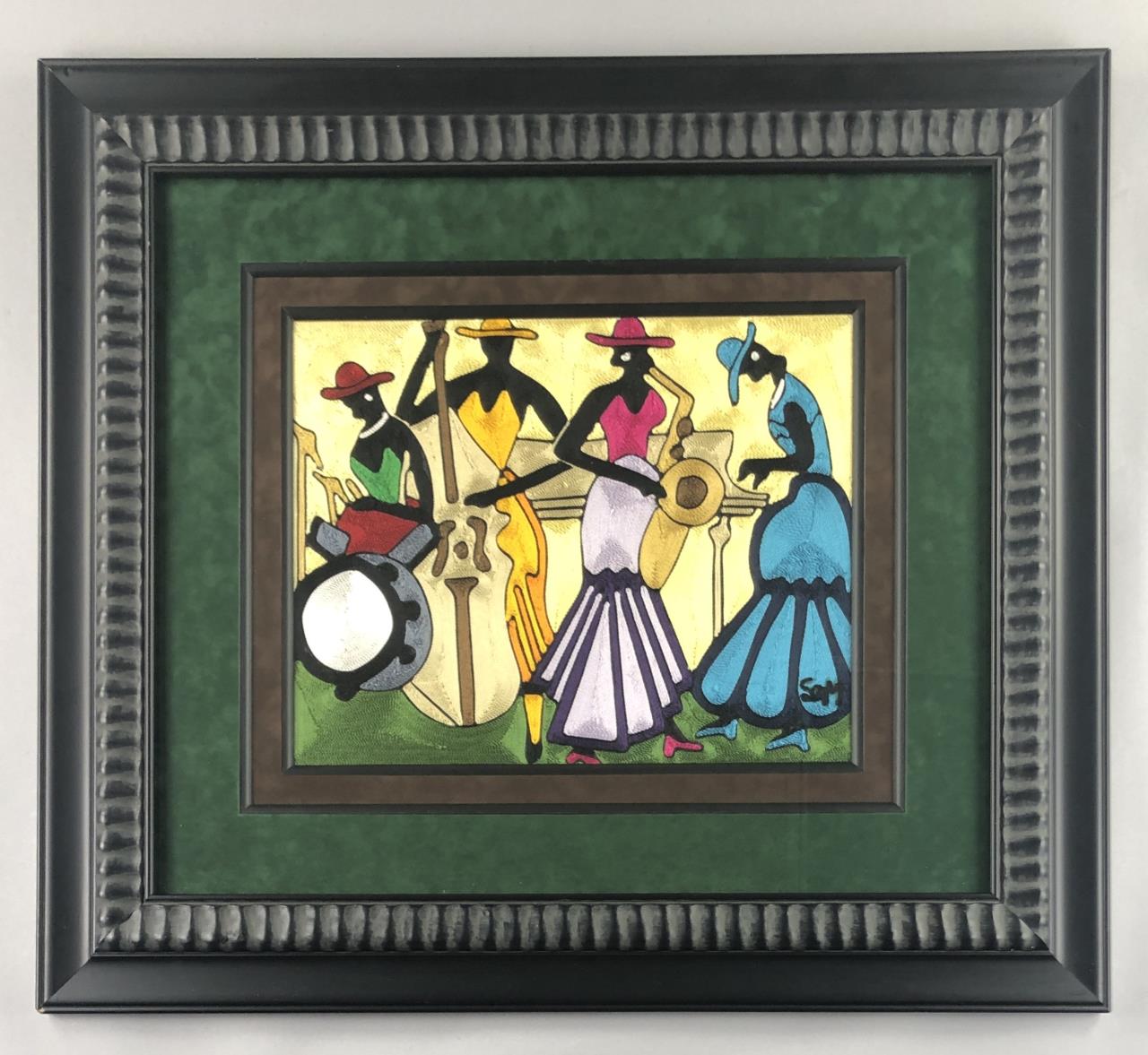 African silk thread art, possibly Ghanaian, depicting four female jazz musicians, signed with initials lower right, possibly “SOM,” in a black painted wood and gesso frame measuring 32-11/16″ x 29-1/8″. CONDITION: Not examined out of frame. Chipping to one corner of the frame, please see last photo. SHIPPING: Local pick-up or third party shipping only for this lot. Please see the Shipping Policy for information on suggested shippers. We recommend the Pak Mail Store of Battle Creek to assist you. Please contact the shipper of your choice for shipping estimates on this lot. Refer to the Shipping section in our full Terms and Conditions for all information on shipping.