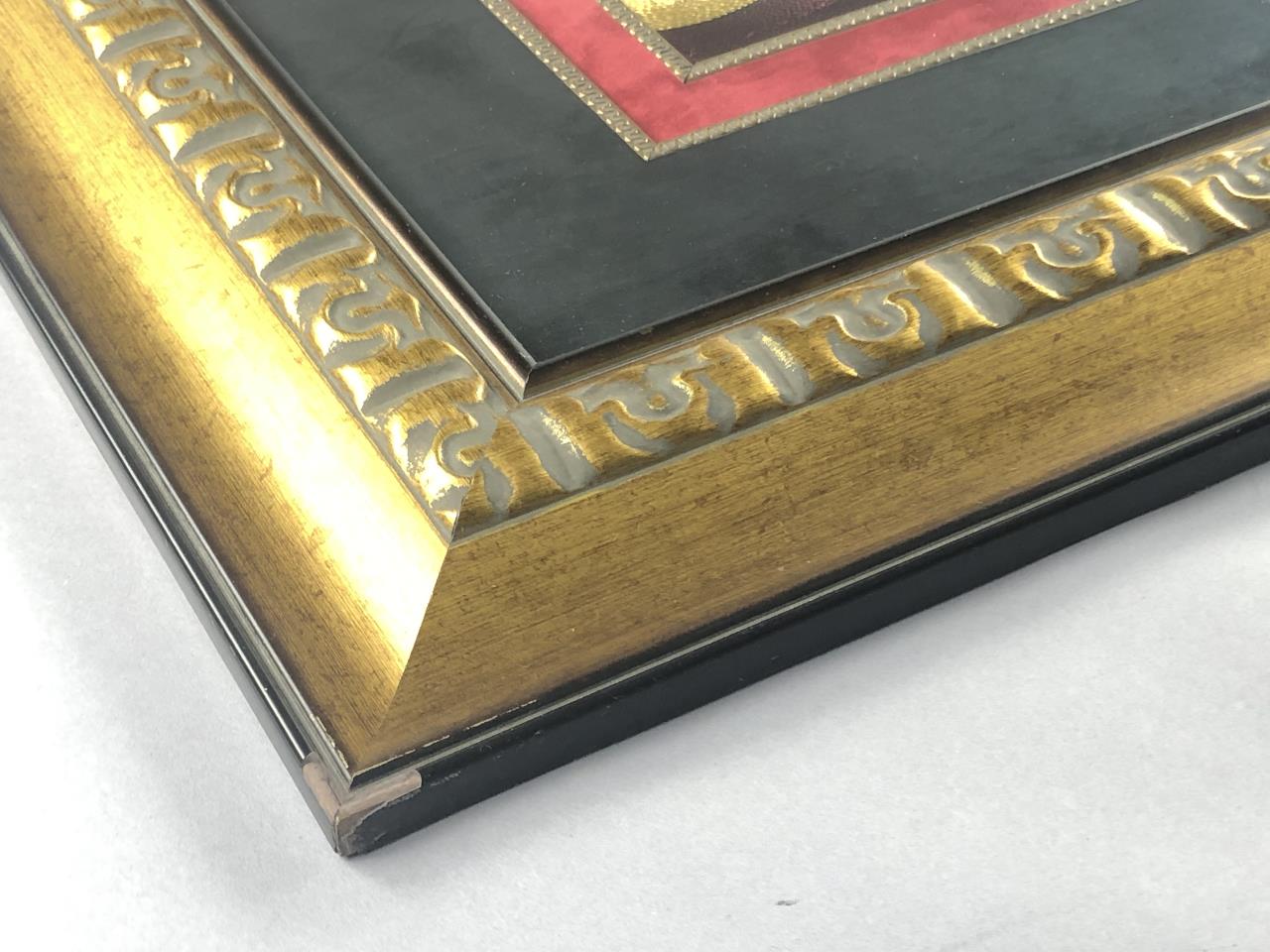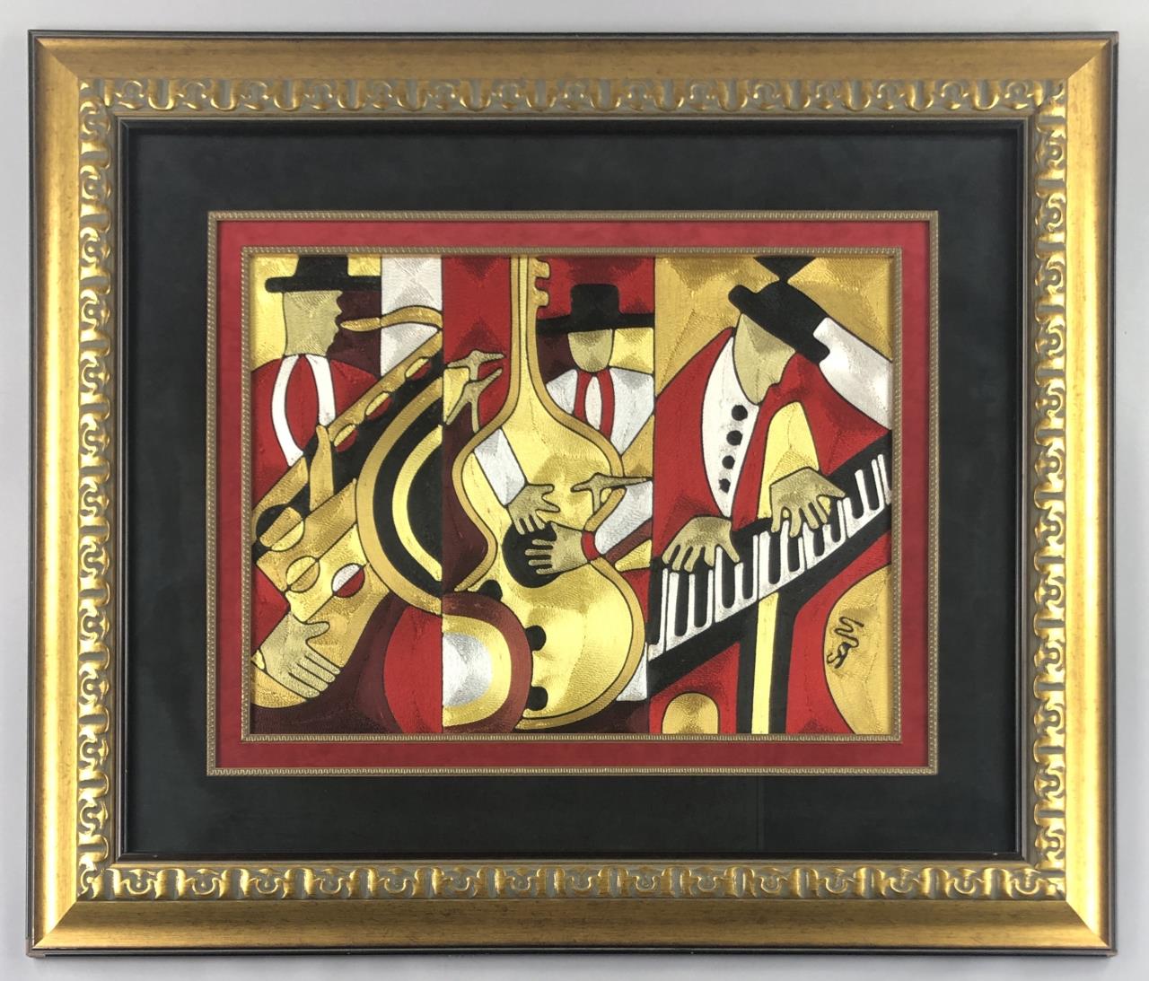 African silk thread art, possibly Ghanaian, depicting three male jazz musicians, signed with initials lower right, possibly “SOM,” in a gilt painted wood and gesso frame measuring 39-1/2″ x 33-9/16″. CONDITION: Not examined out of frame. Chipping to three corners of the frame, please see last three photos. SHIPPING: Local pick-up or third party shipping only for this lot. Please see the Shipping Policy for information on suggested shippers. We recommend the Pak Mail Store of Battle Creek to assist you. Please contact the shipper of your choice for shipping estimates on this lot. Refer to the Shipping section in our full Terms and Conditions for all information on shipping.