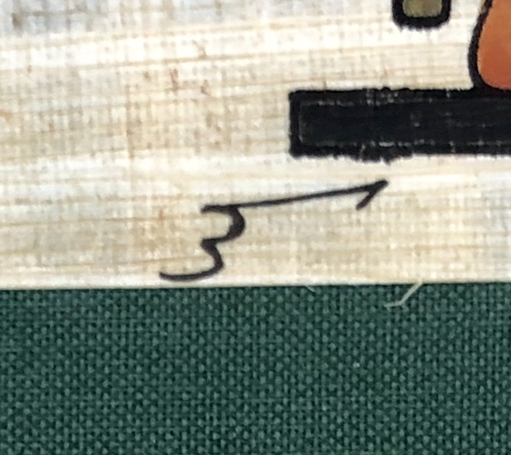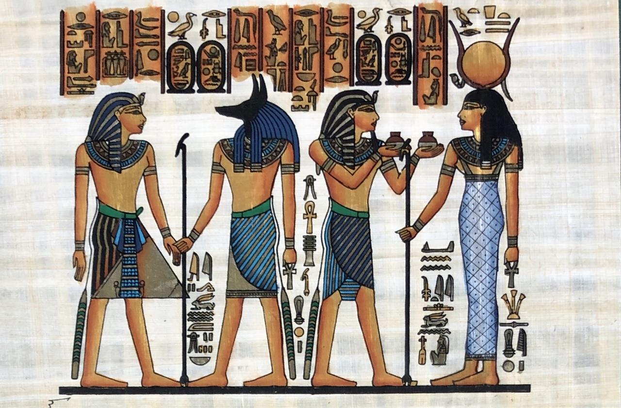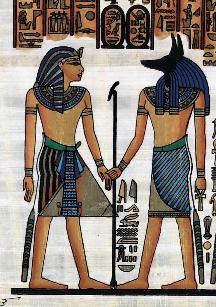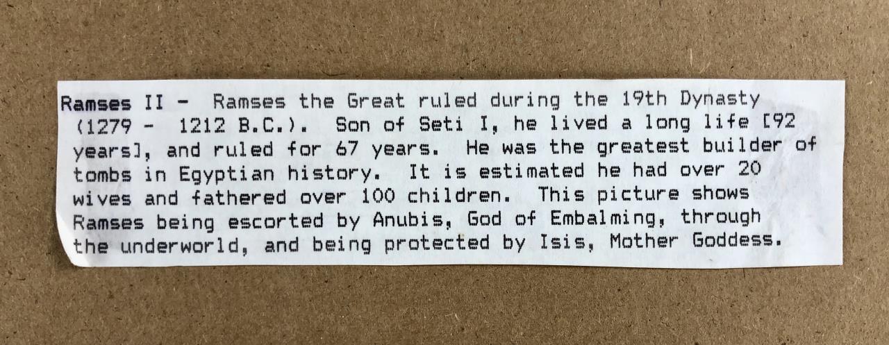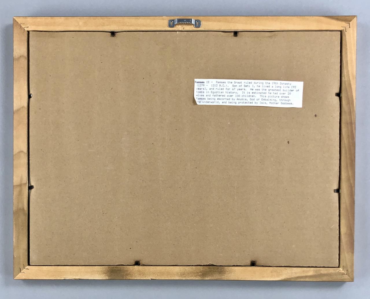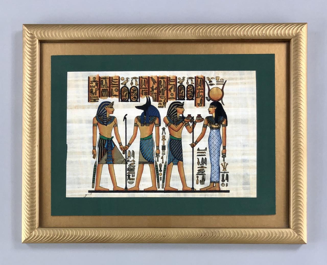 Original artist signed Egyptian painting on papyrus paper, depicting Ramses II being escorted by Anubis through the Underworld and being protected by Isis, signed lower left, circa late 20th Century, in a gold painted wood frame measuring 17-1/2″ x 13-1/2″. CONDITION: Not inspected out of frame. SHIPPING: In-House Shipping Available. Please read our Shipping Policies and Terms and Conditions