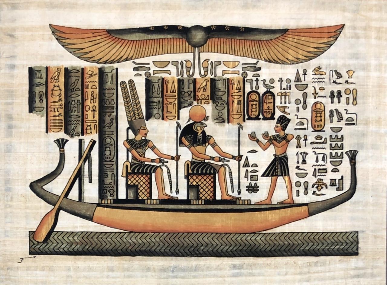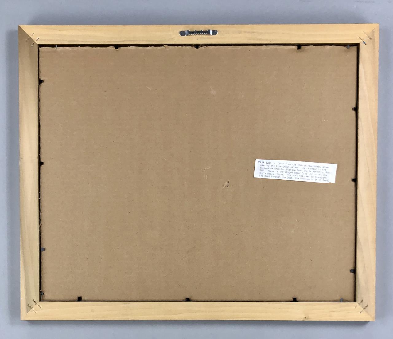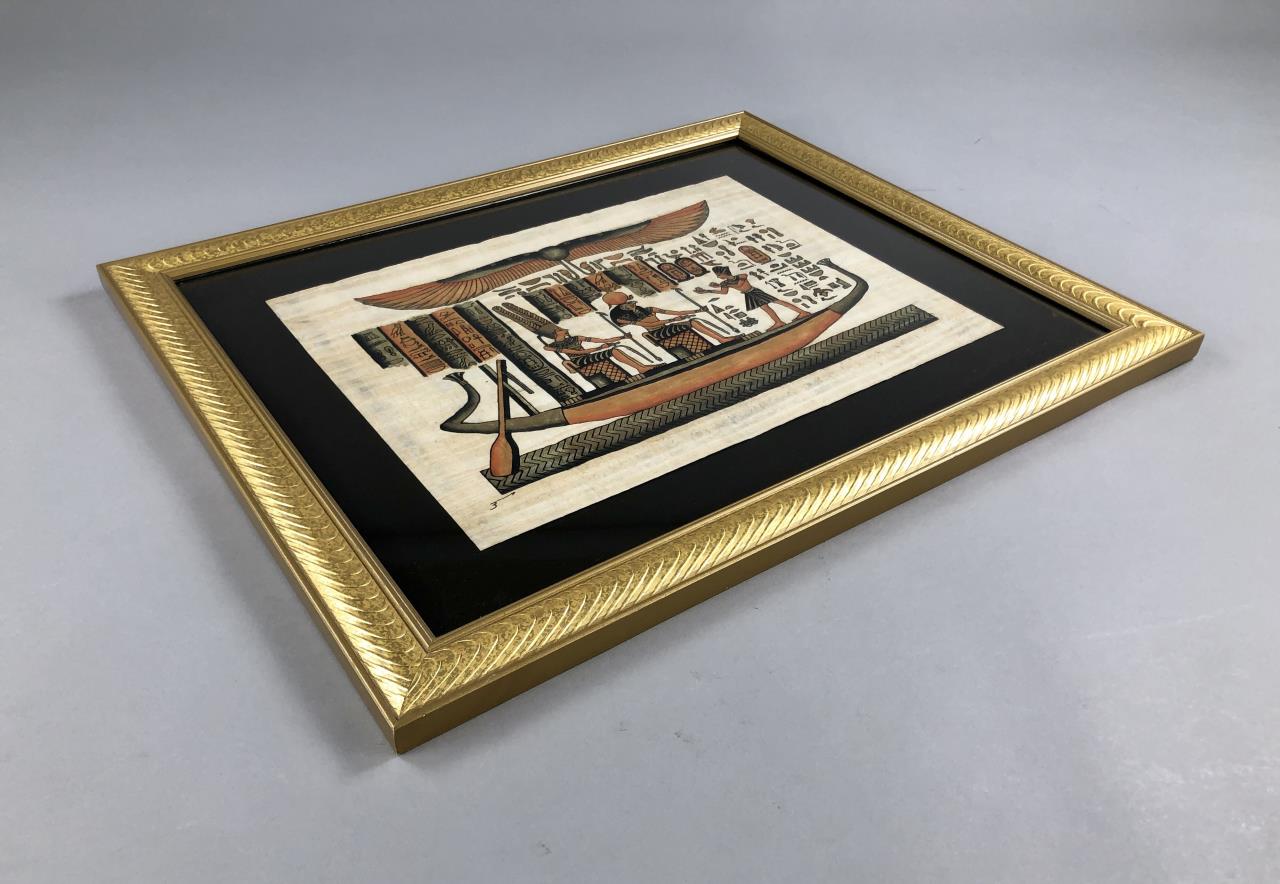 Original artist signed Egyptian painting on papyrus paper, depicting the Solar Boat, taken from the Tomb of Amenhotep in the company of Amun Ra, signed lower left, in a gold painted wood frame measuring 22-1/2″ x 18-1/2″. CONDITION: Not inspected out of frame. SHIPPING: In-House Shipping Available. Please read our Shipping Policies and Terms and Conditions