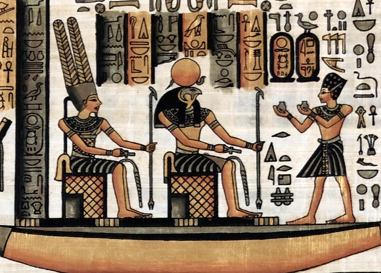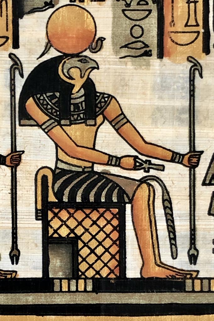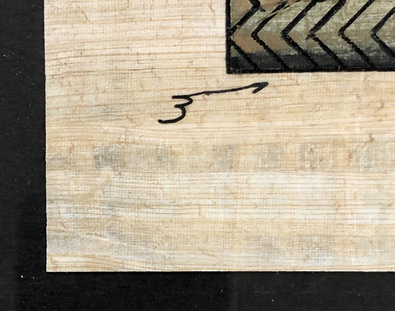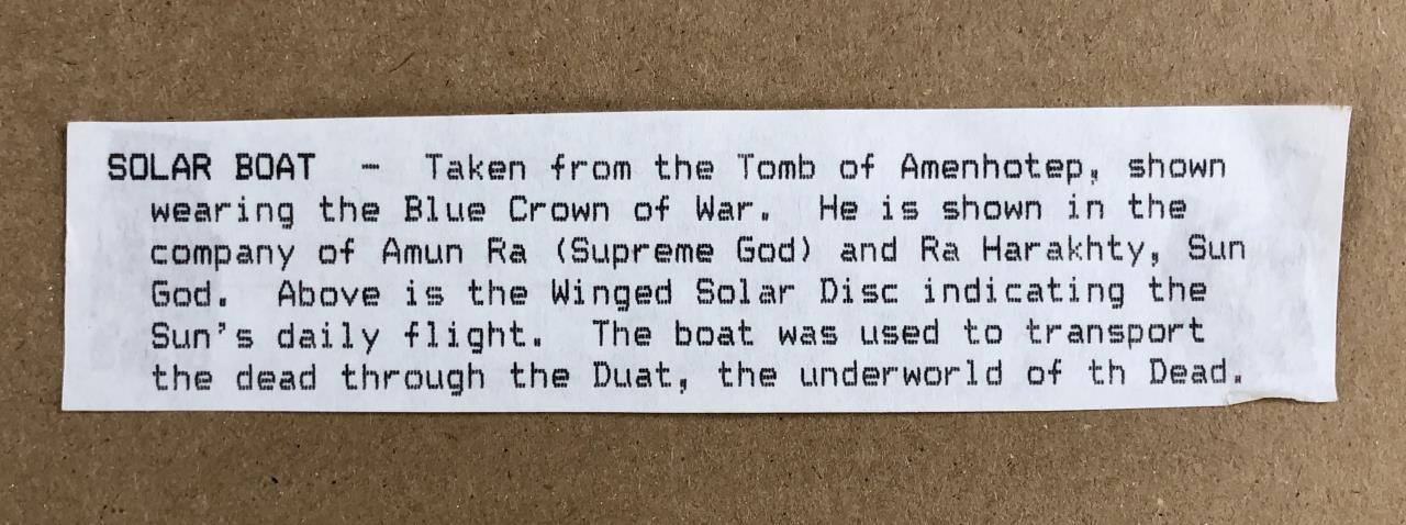 Original artist signed Egyptian painting on papyrus paper, depicting the Solar Boat, taken from the Tomb of Amenhotep in the company of Amun Ra, signed lower left, in a gold painted wood frame measuring 22-1/2″ x 18-1/2″. CONDITION: Not inspected out of frame. SHIPPING: In-House Shipping Available. Please read our Shipping Policies and Terms and Conditions