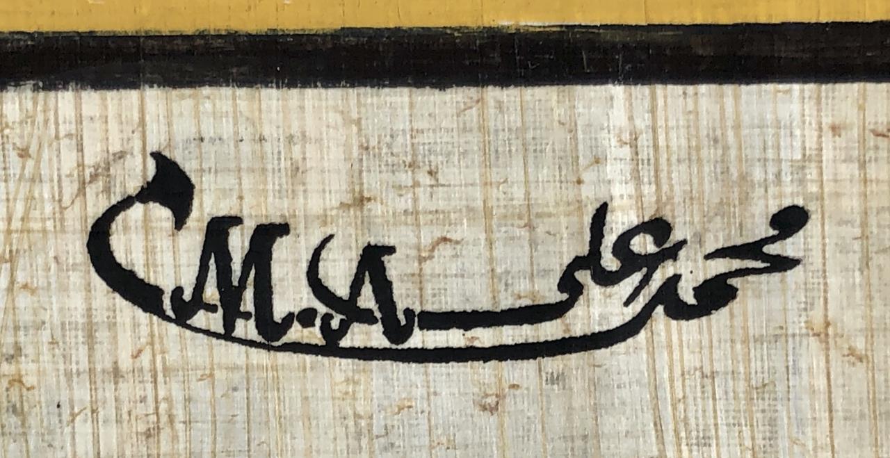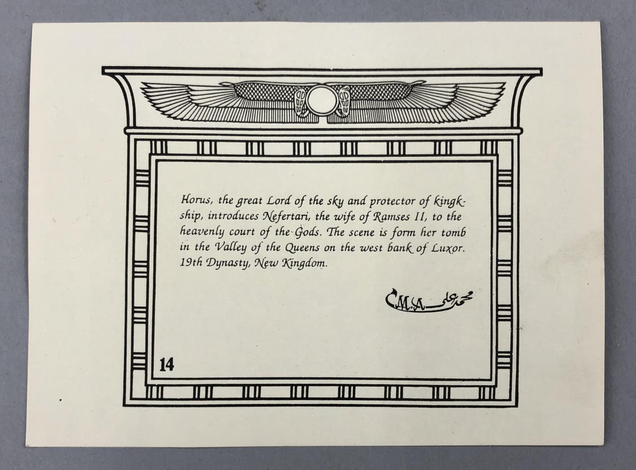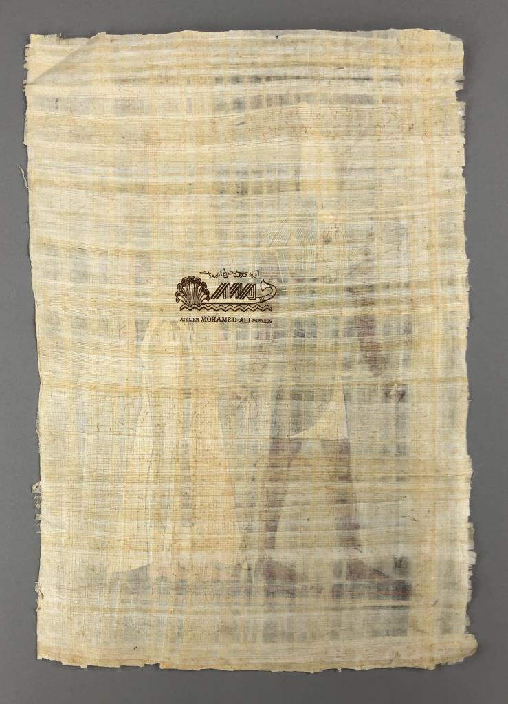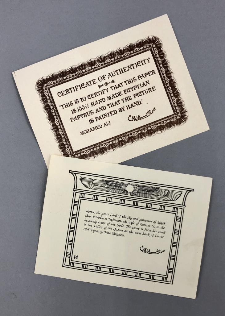 Original artist signed Egyptian painting on papyrus paper, depicting Horus introducing Queen Nefertari (also known as Nefertari Meritmut) to the heavenly Court of the Gods, signed lower right, from the Studio of Mohamed Ali, with certificate of authenticity and printed description, measures approximately 18″ x 12-1/4″. CONDITION: Some creasing along the top and upper right corner. SHIPPING: In-House Shipping Available. Please read our Shipping Policies and Terms and Conditions