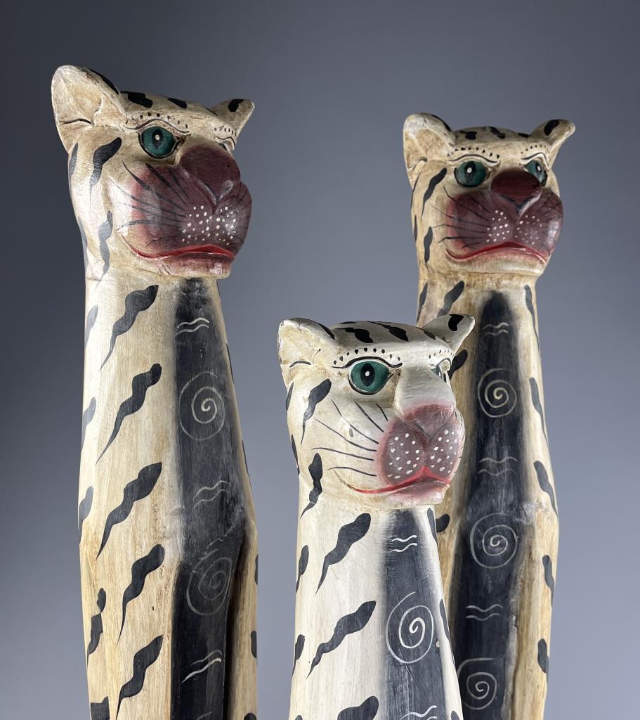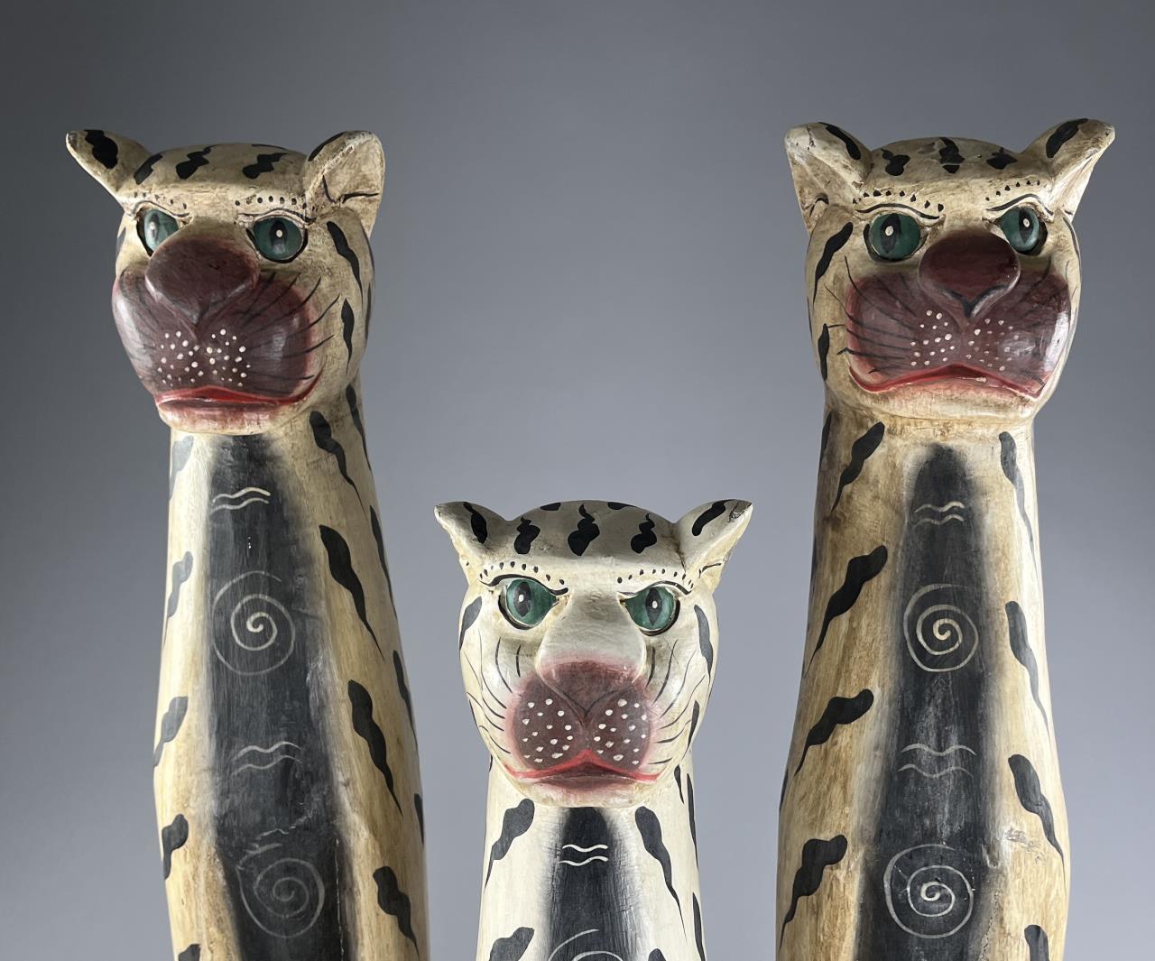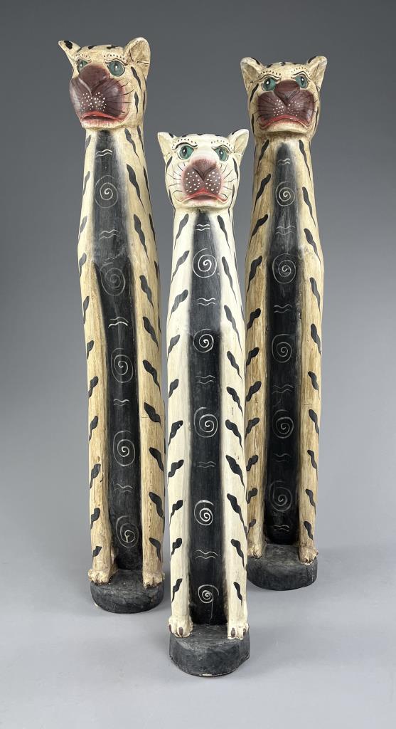 Set of three Balinese folk art tigers, leopards, or cats, hand carved and hand painted wood, the largest one is approximately 38″ H. CONDITION: Some minor chipping and loss to paint, commensurate with age and use. SHIPPING: Local pick-up or third party shipping only for this lot. Please see the Shipping Policy for information on suggested shippers. We recommend the Pak Mail Store of Battle Creek to assist you. Please contact the shipper of your choice for shipping estimates on this lot. Refer to the Shipping section in our full Terms and Conditions for all information on shipping.