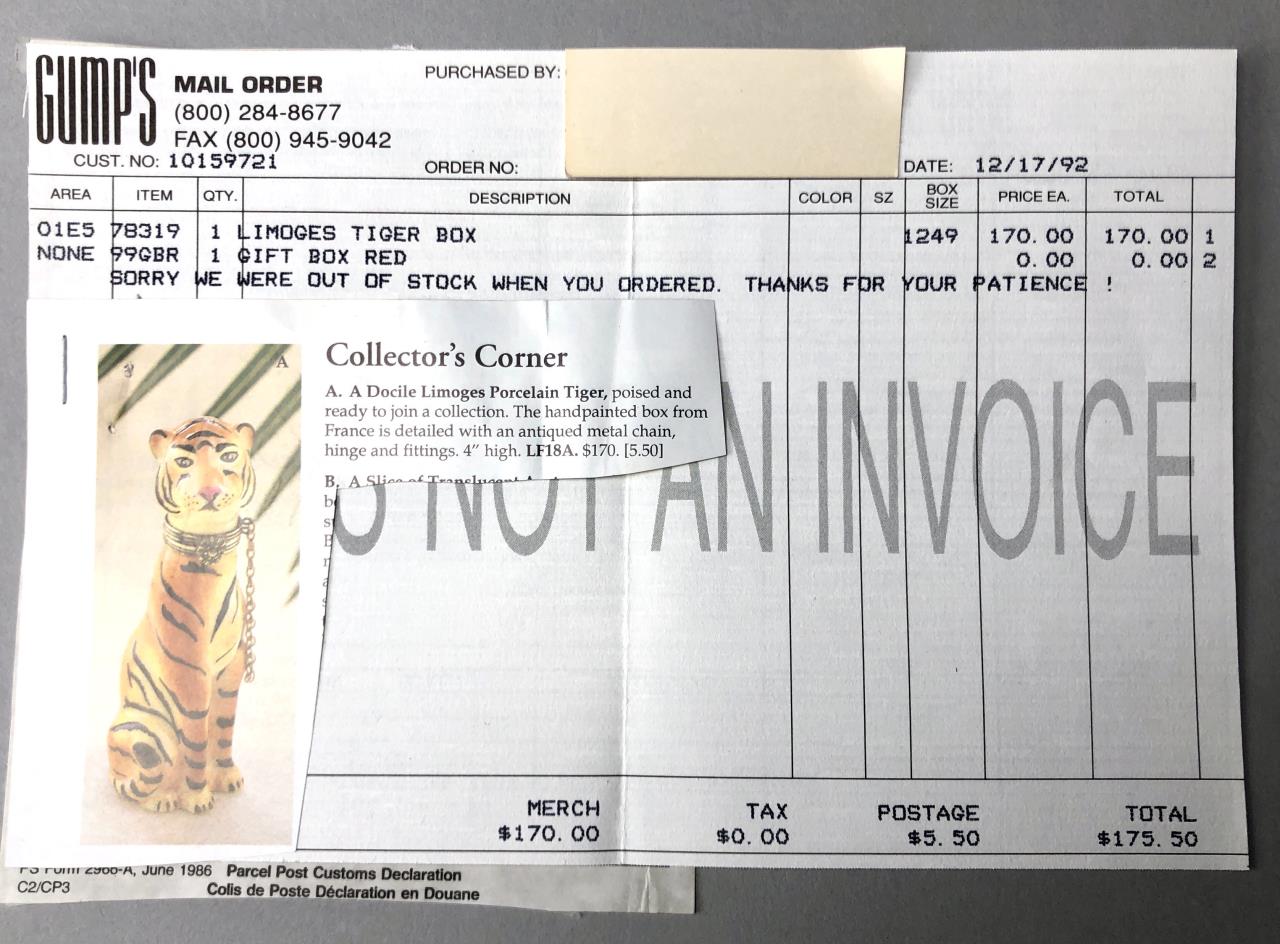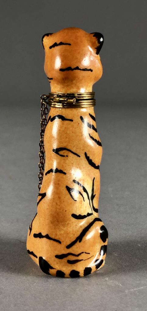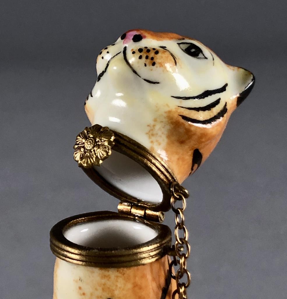 French, hand painted porcelain, figural hinged trinket or pill box, in the form of a Bengal tiger cat, marked on the bottom “Limoges France Peint. Main Chamart,” purchased from Gump’s in 1992, approximately 4″ H. CONDITION: SHIPPING: In-House Shipping Available. Please read our Shipping Policies and Terms and Conditions
