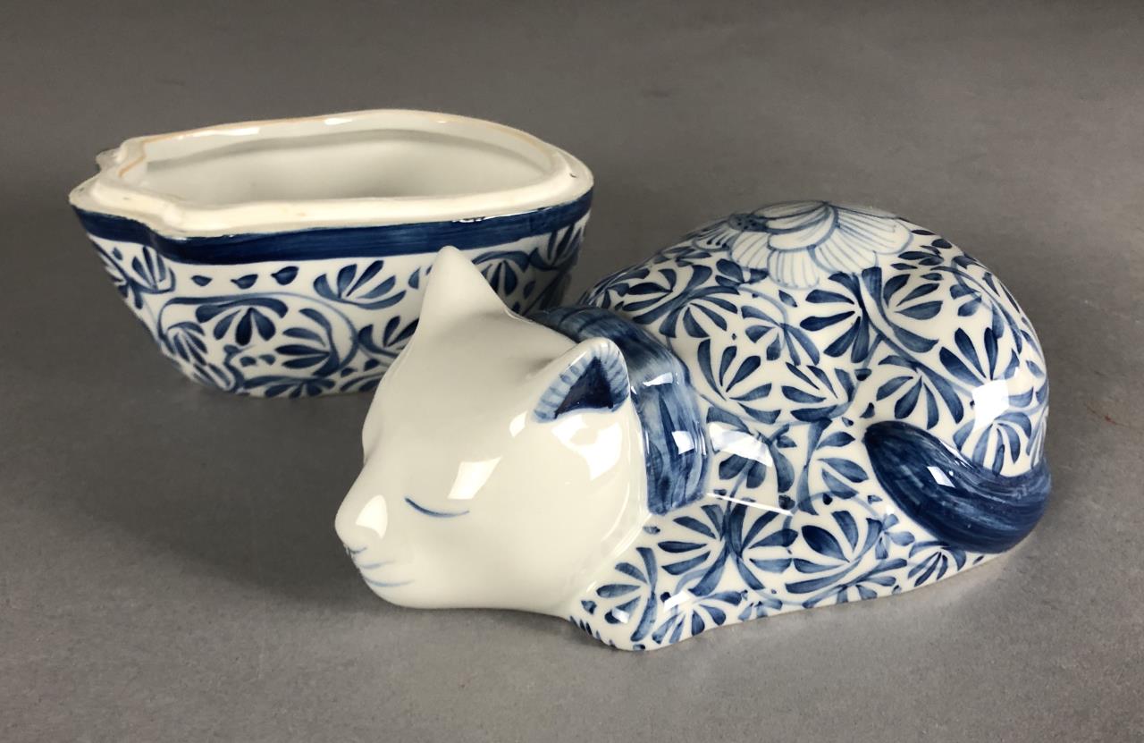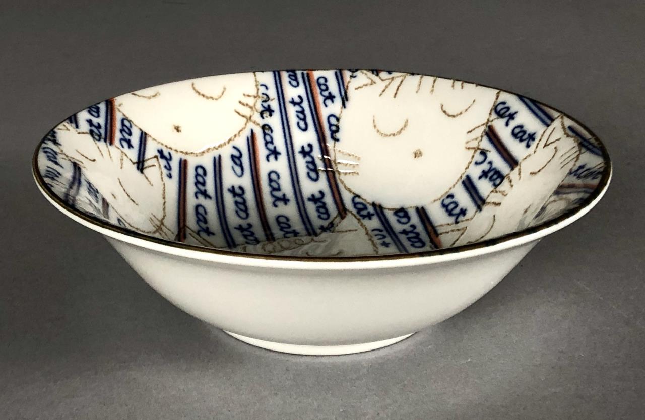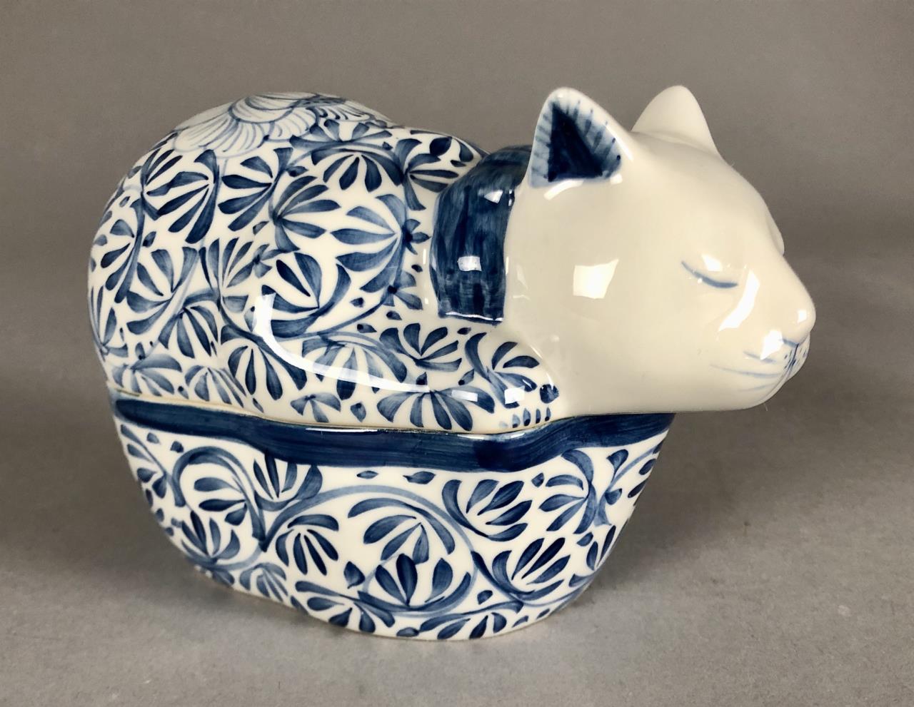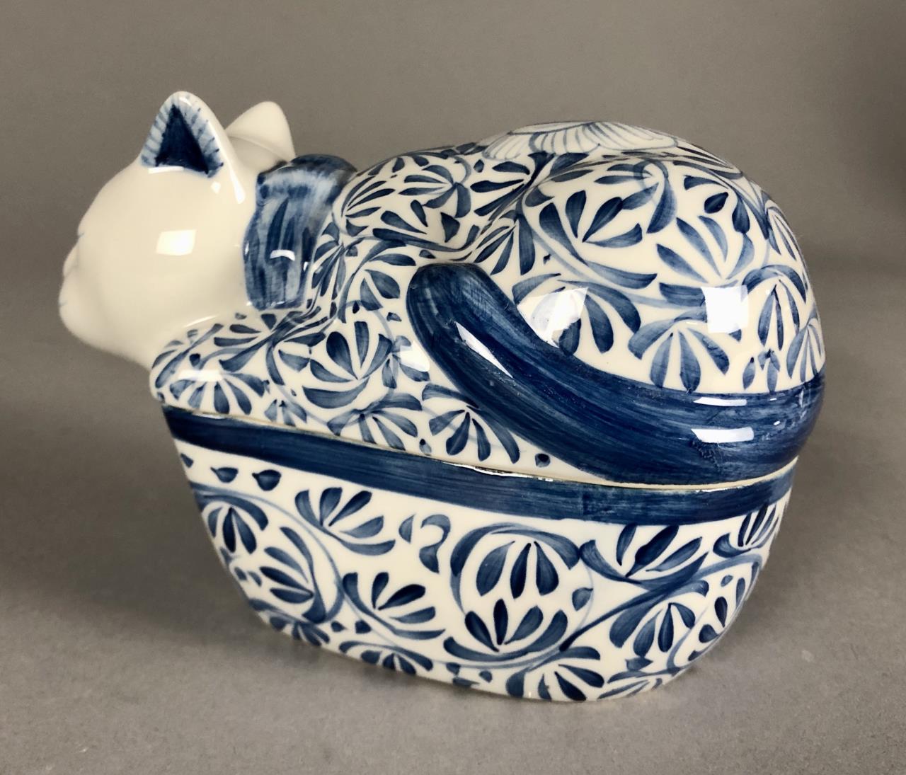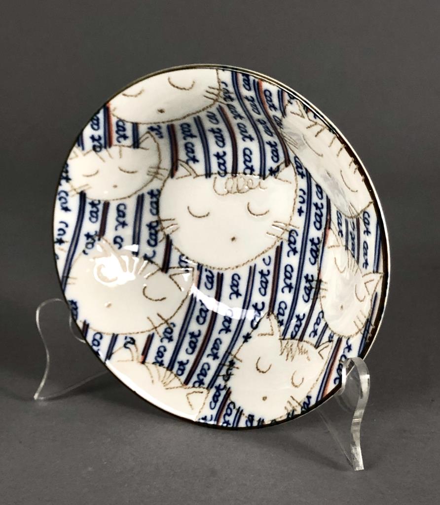 Laurie Gates California Designs (USA) ceramic cat cookie jar from 2000 (13-5/8″ H), blue and white covered porcelain cat trinket dish (unmarked), Japanese porcelain bowl with incised and painted cats (5-5/8″ D). CONDITION: There is a small chip on the rim of the bottom half of the covered cat dish. SHIPPING: In-House Shipping Available. Please read our Shipping Policies and Terms and Conditions