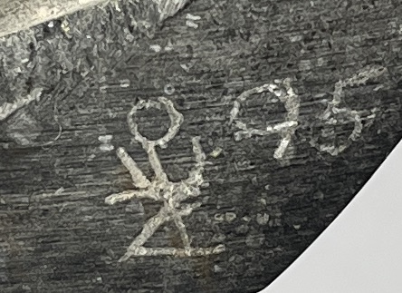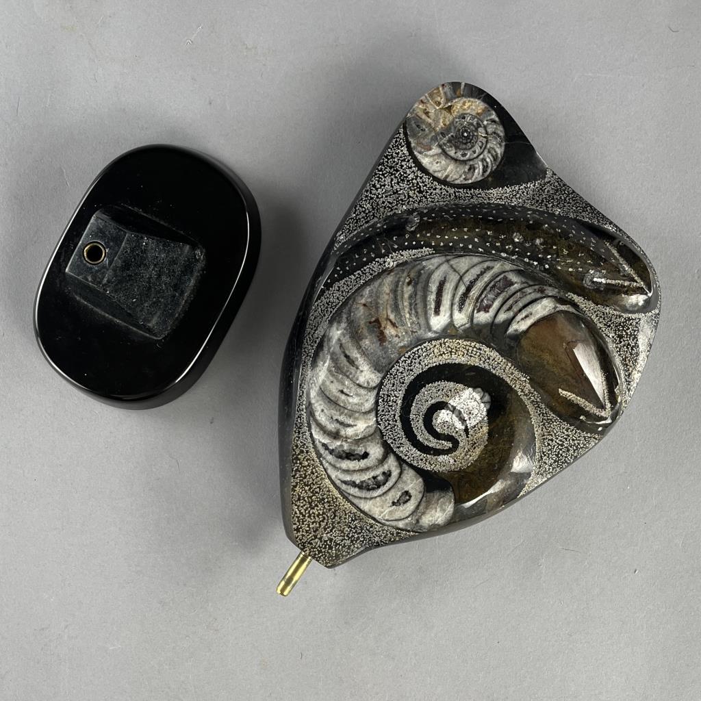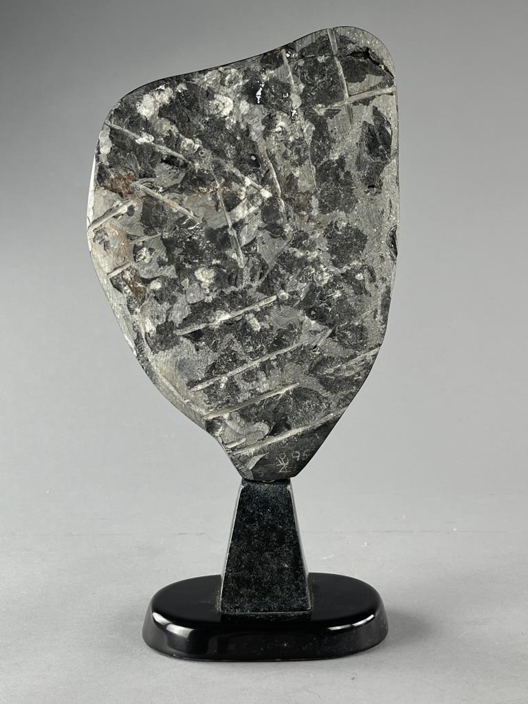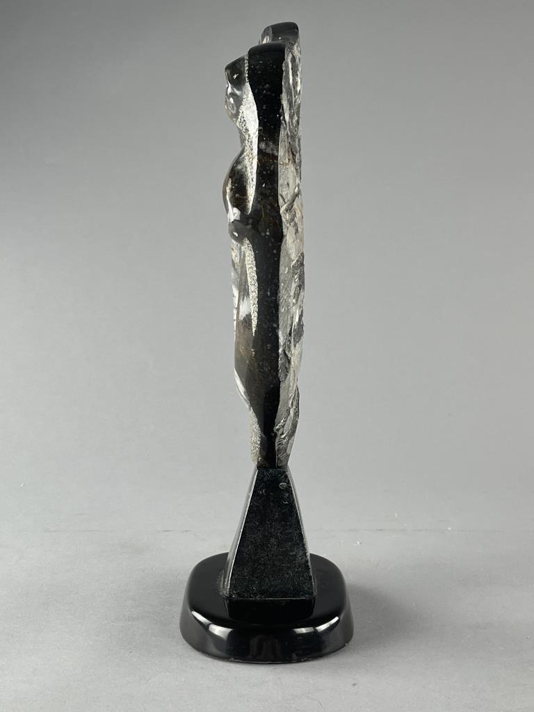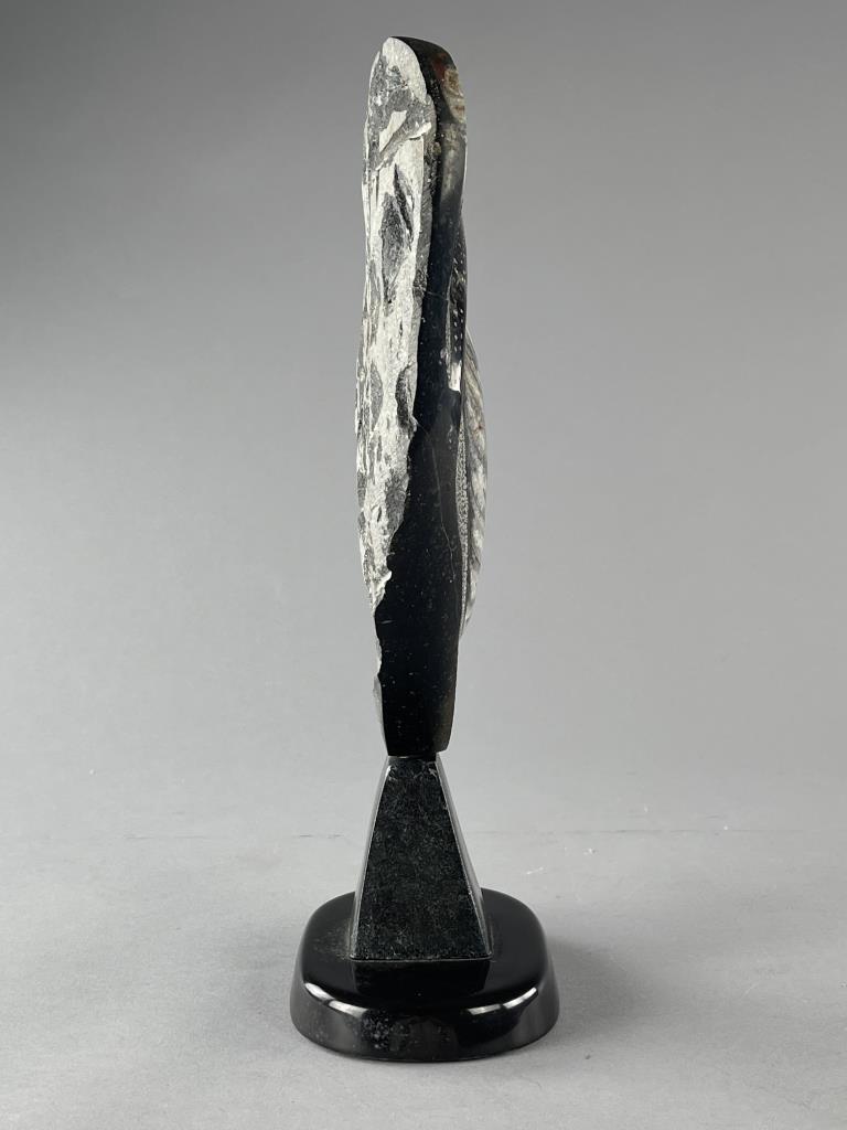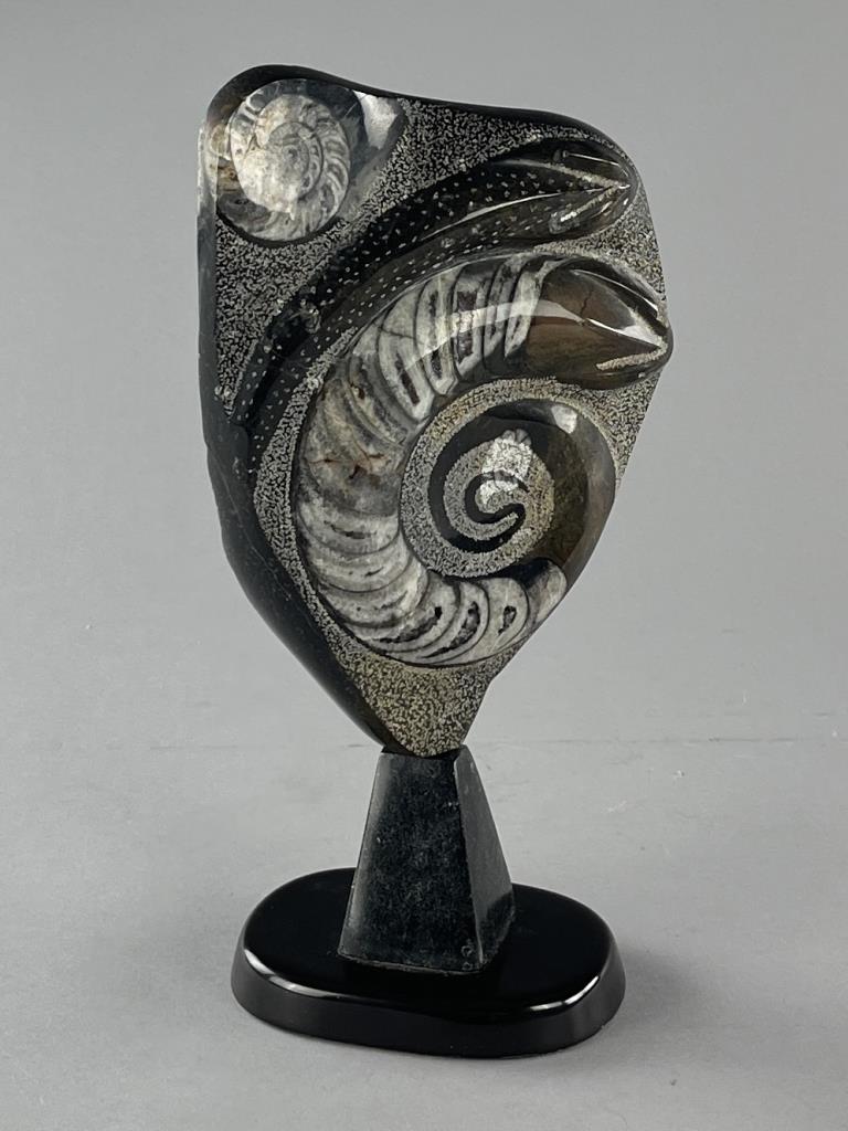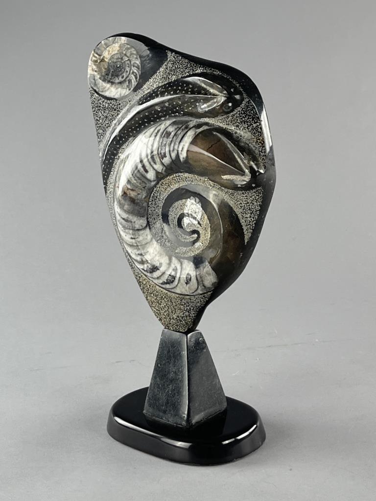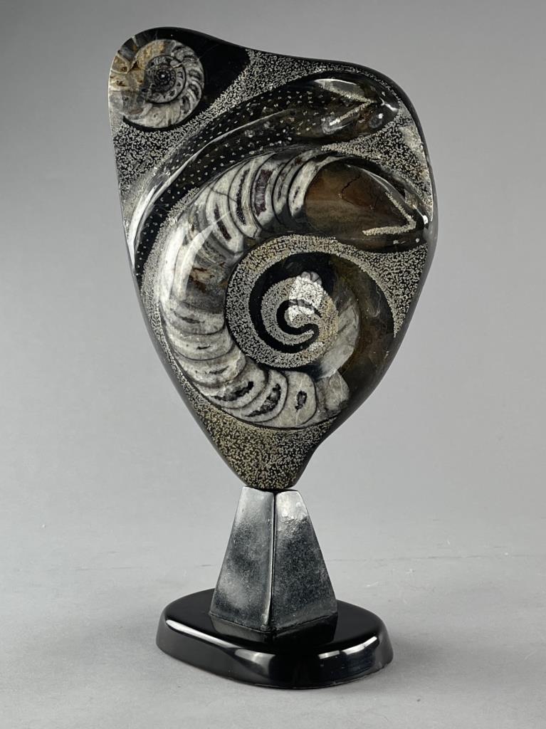 Polished Orthoceras and Ammonite fossil specimen, or statue, on stand, possible signature and date etched on reverse, approximately 14″ (H) x 7″ (W), including stand. CONDITION: SHIPPING: In-House Shipping Available. Please read our Shipping Policies and Terms and Conditions