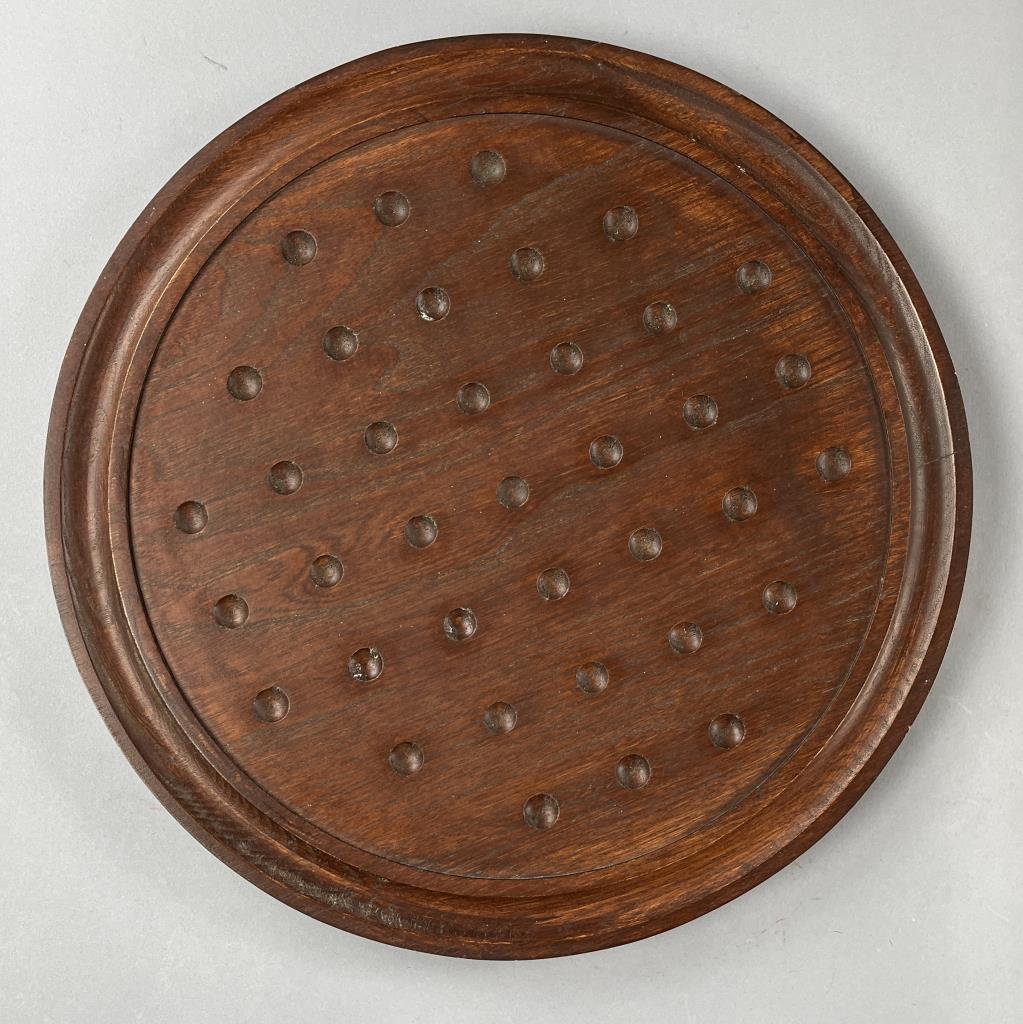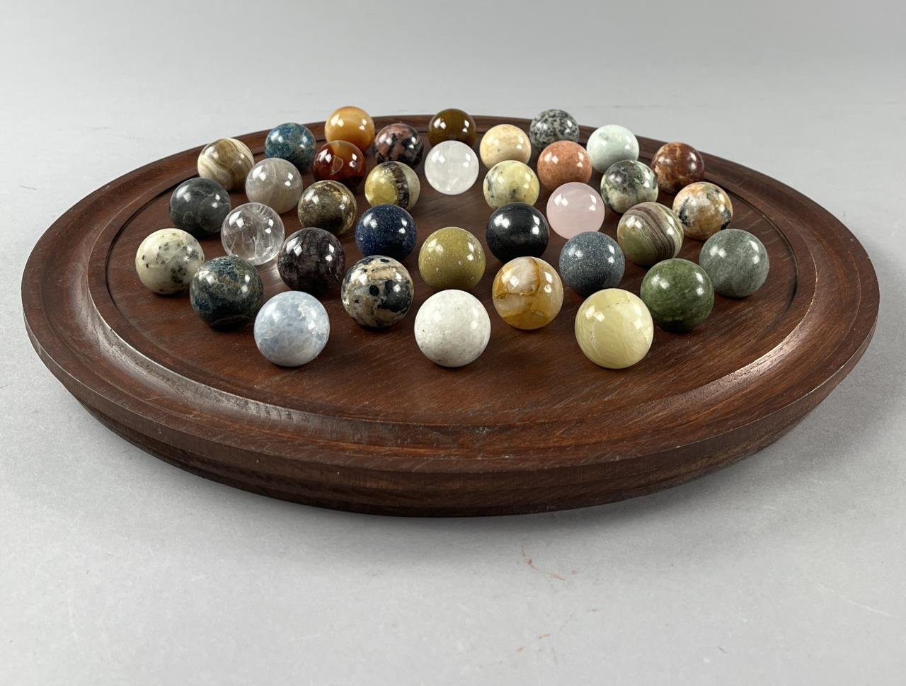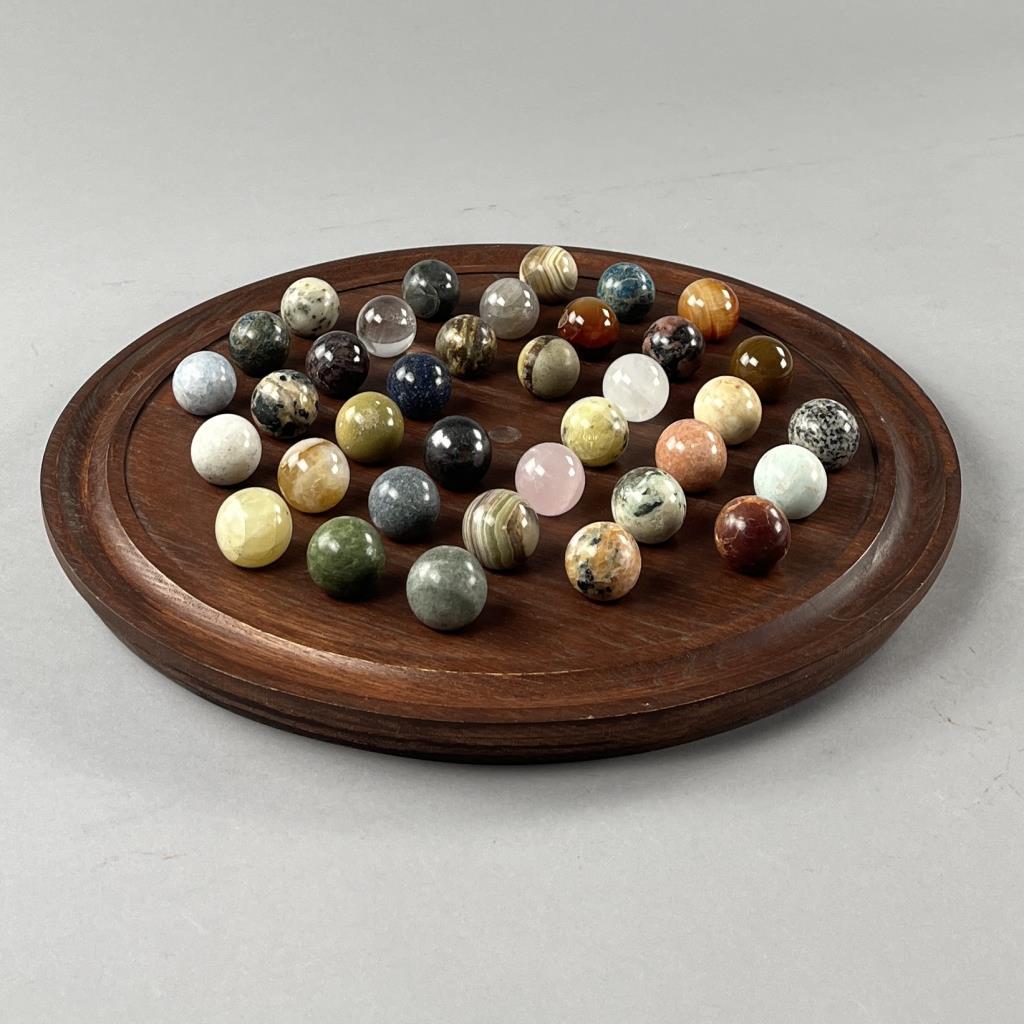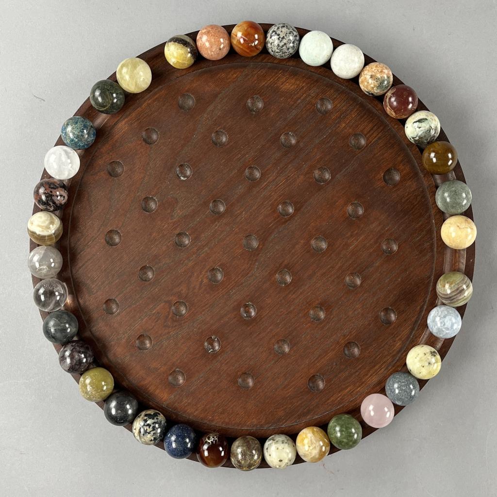 Marble solitaire board game, featuring semi precious stones each approximately 1-1/8″ (D), and a wood base approximately 15-3/4″ (D), late 20th Century. CONDITION: SHIPPING: In-House Shipping Available. Please read our Shipping Policies and Terms and Conditions
