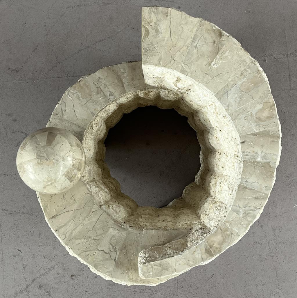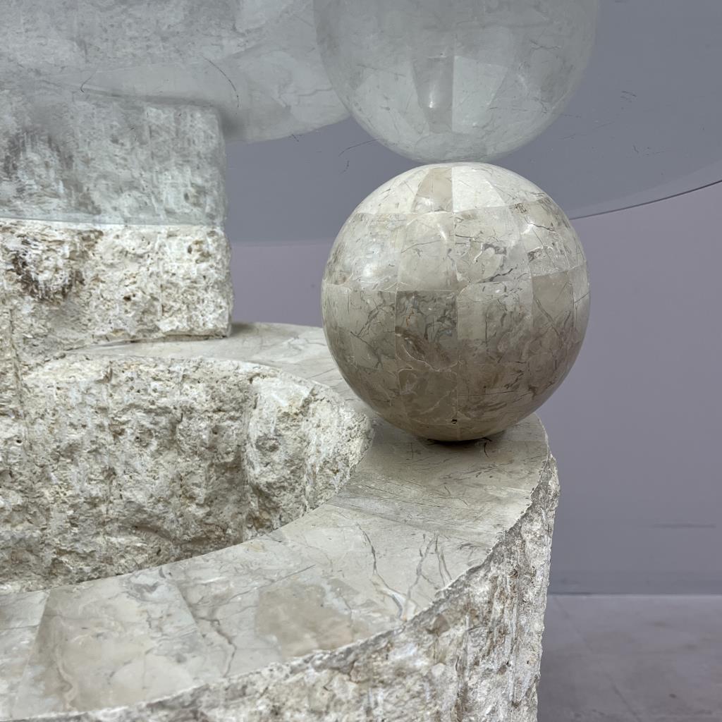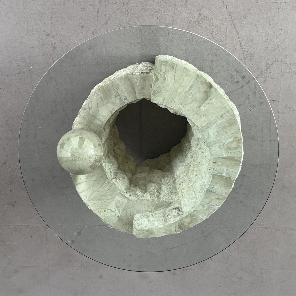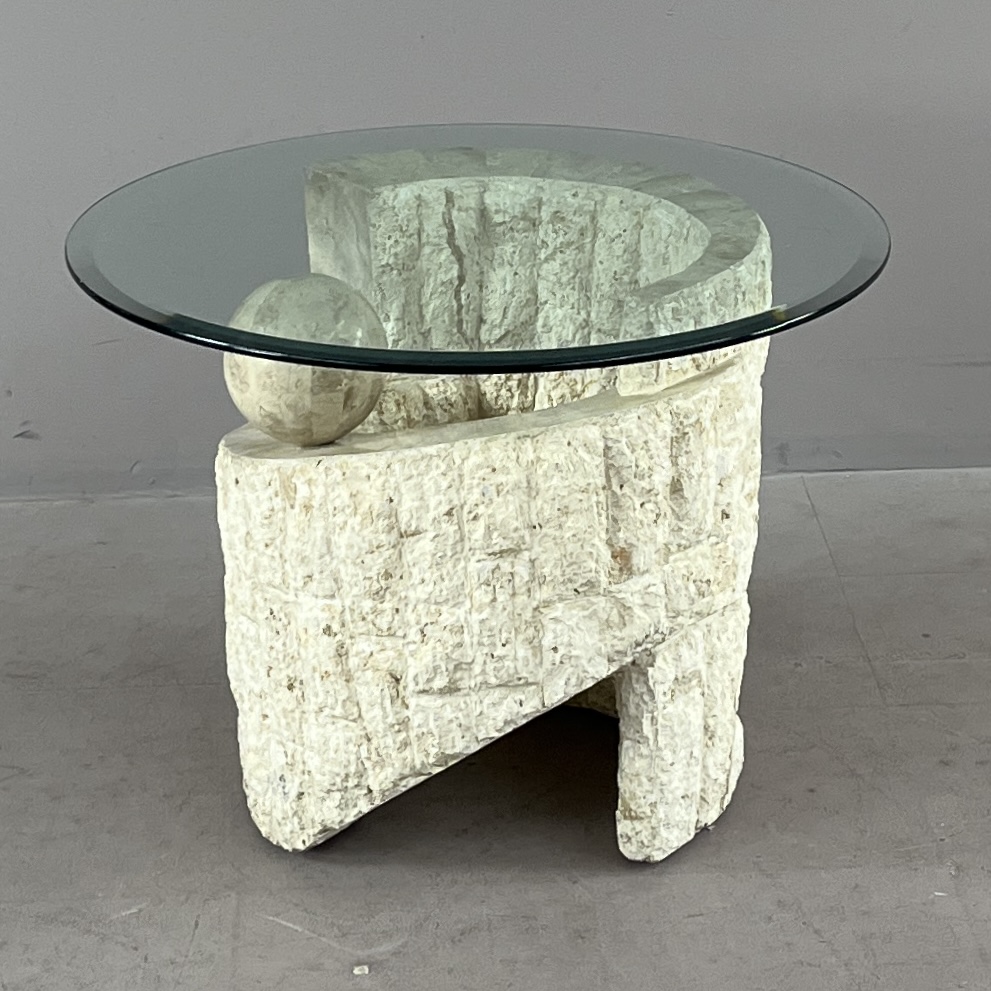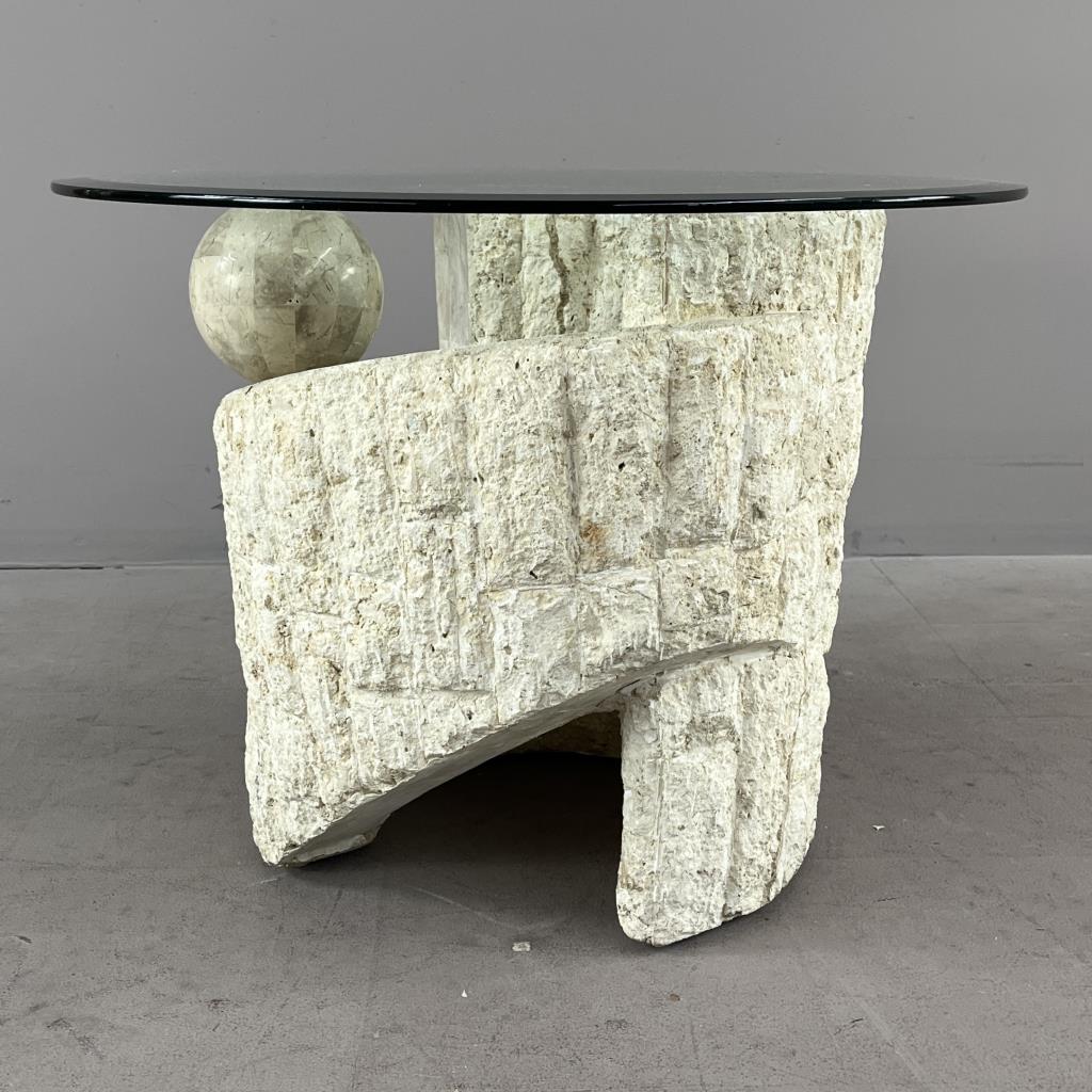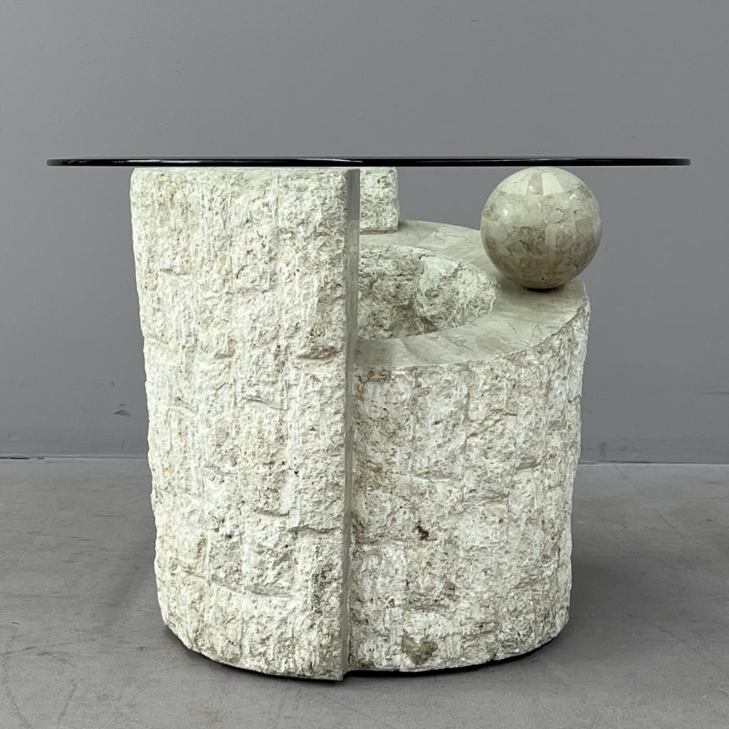 Magnussen Ponte Postmodern end table, tessellated Mactan stone (Philippines), with beveled glass top, circa 1980s, 28″ (diameter) x 20-5/16″ (H). CONDITION: Some minor scratching to the glass, very minor chip to the edge of the glass, please see last two photos. SHIPPING: Local pick-up or third party shipping only for this lot. Please see the Shipping Policy for information on suggested shippers. We recommend the Pak Mail Store of Battle Creek to assist you. Please contact the shipper of your choice for shipping estimates on this lot. Refer to the Shipping section in our full Terms and Conditions for all information on shipping.