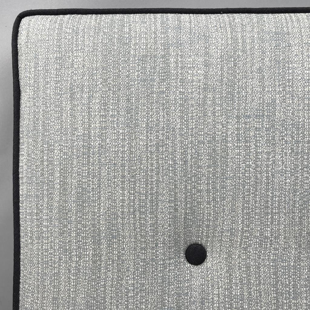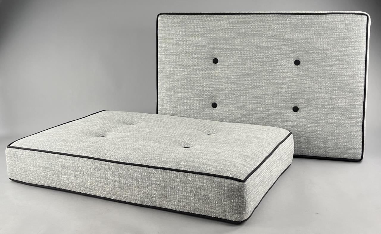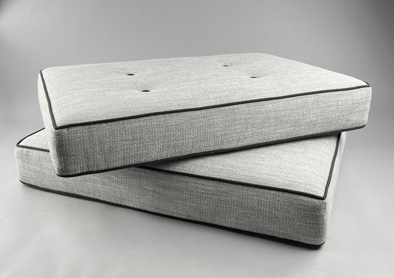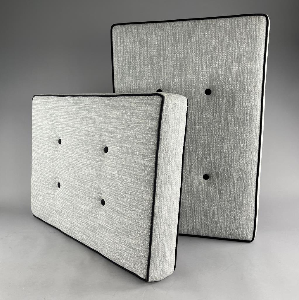 Pair of tufted cushion, grey upholstery with contrasting black piping and buttons, zippered on one side, each approximately 25″ x 36-1/3″. CONDITION: Local pick-up or third party shipping only for this lot. Please see the Shipping Policy for information on suggested shippers. We recommend the Pak Mail Store of Battle Creek to assist you. Please contact the shipper of your choice for shipping estimates on this lot. Refer to the Shipping section in our full Terms and Conditions for all information on shipping. SHIPPING: In-House Shipping Available. Please read our Shipping Policies and Terms and Conditions