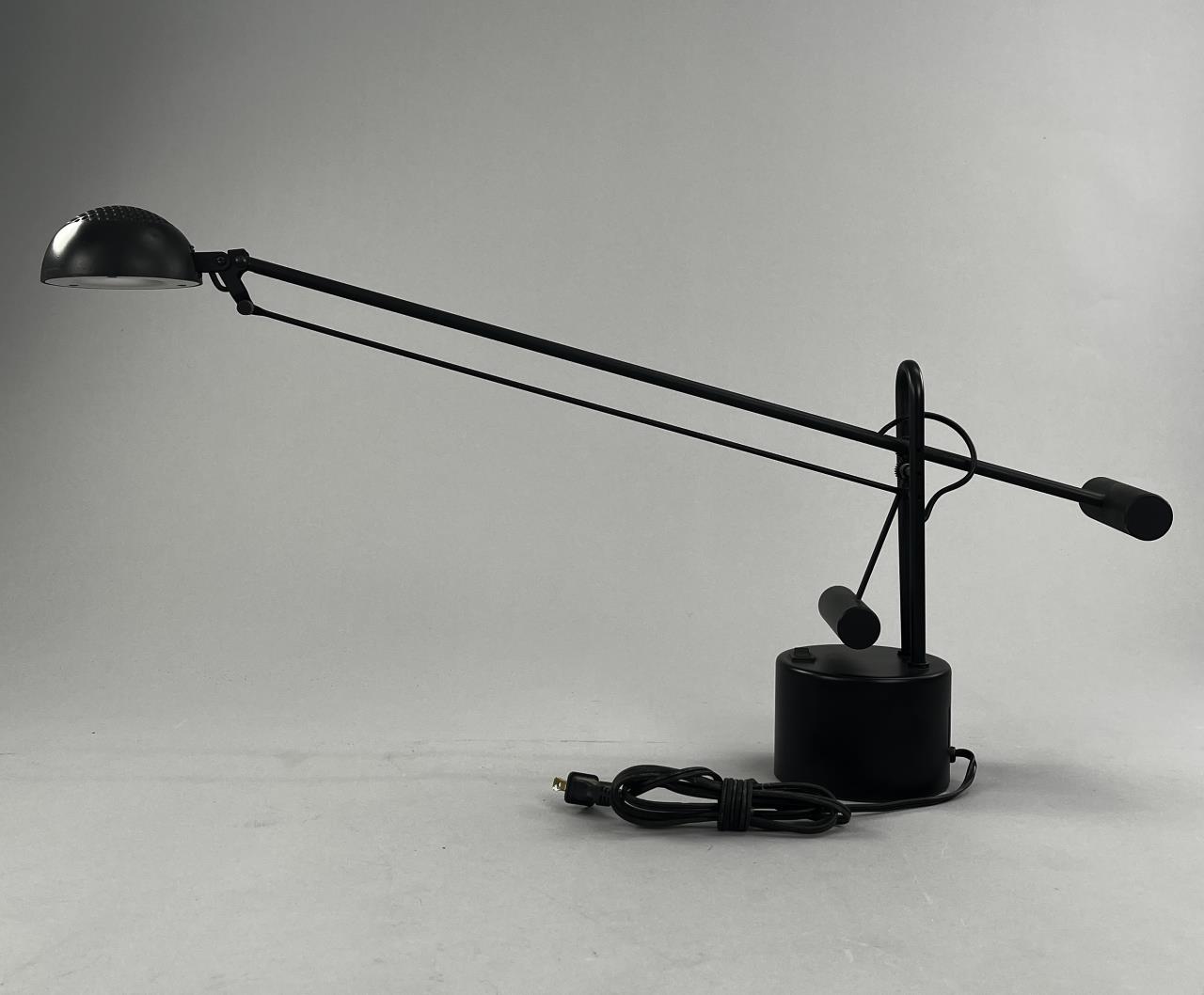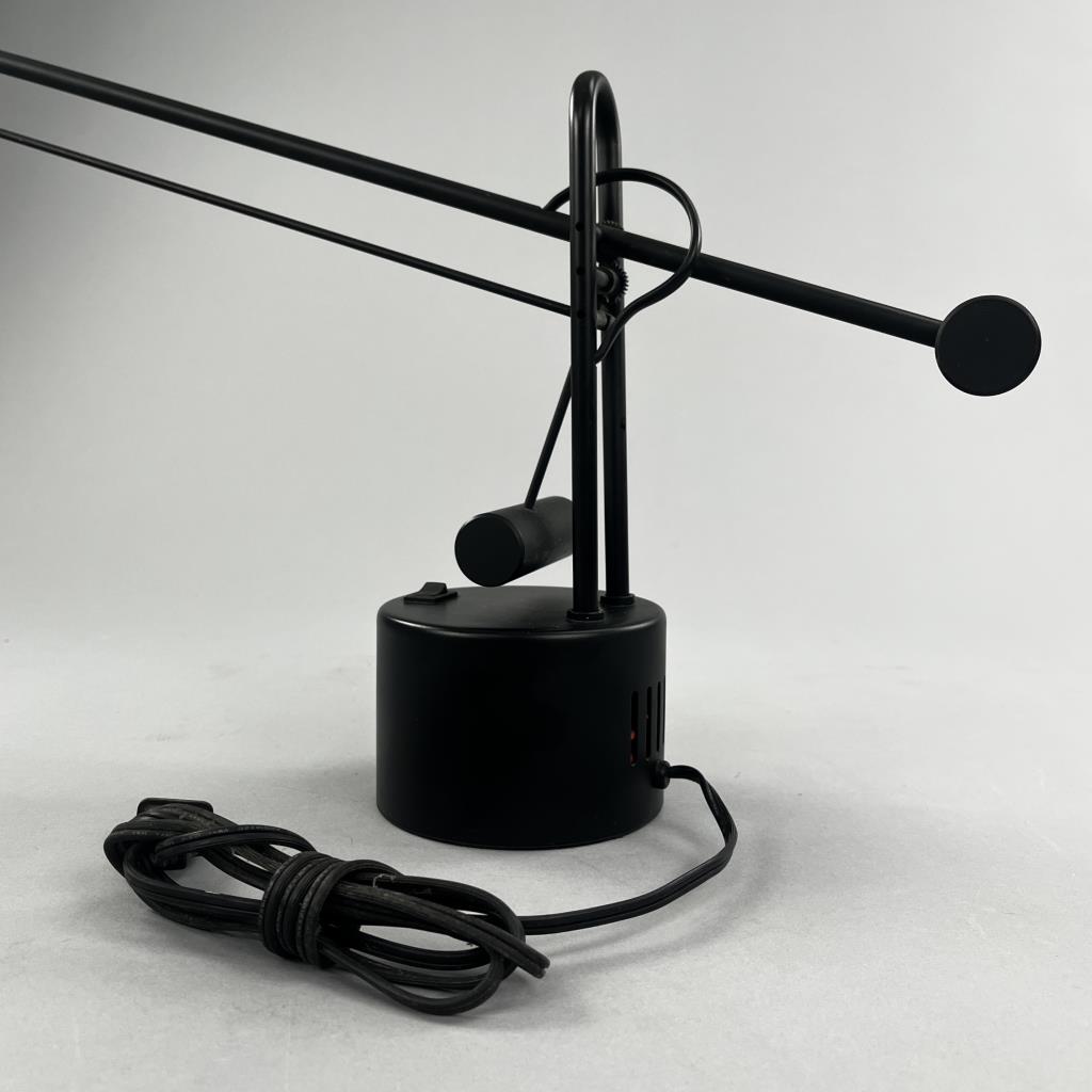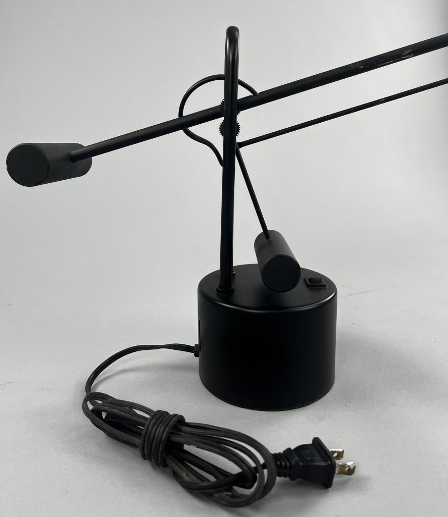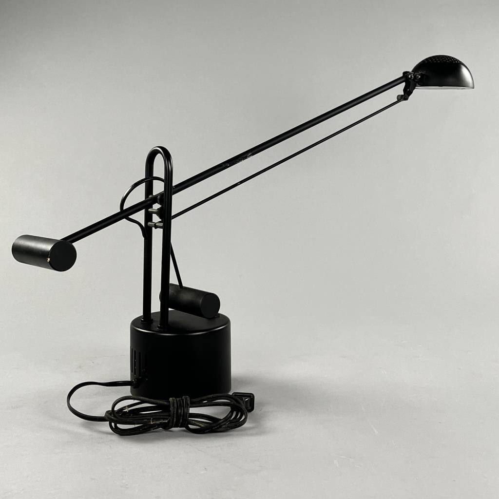 Modern Italian style counter balance desk lamp, with switch on base, reminiscent of the iconic Artimede Tizio lamp, circa 1990s, approximately 11″ (H) to top of framework and 22-1/2″ (H) in its highest position. CONDITION: Not working but may simply be a burned out bulb. There is a very small dent in the top of the lamp, please see last photo. SHIPPING: Local pick-up or third party shipping only for this lot. Please see the Shipping Policy for information on suggested shippers. We recommend the Pak Mail Store of Battle Creek to assist you. Please contact the shipper of your choice for shipping estimates on this lot. Refer to the Shipping section in our full Terms and Conditions for all information on shipping.