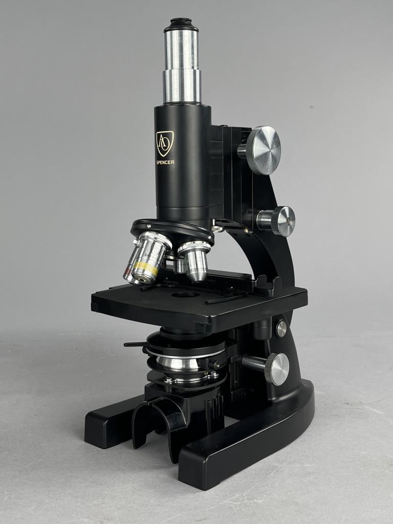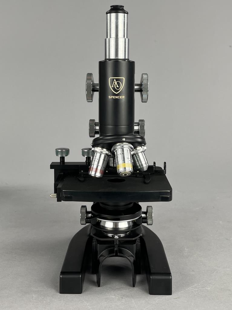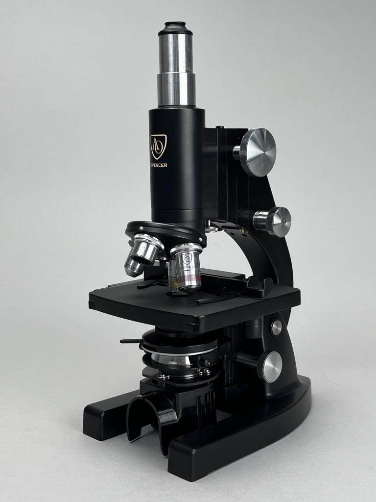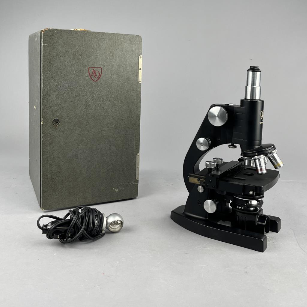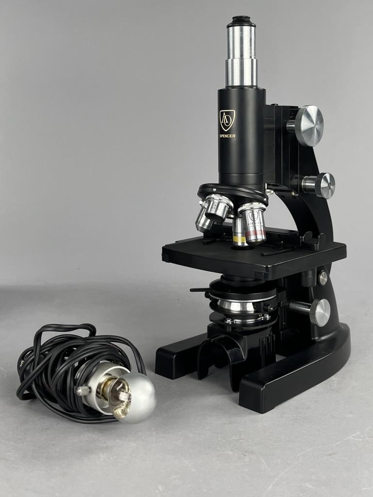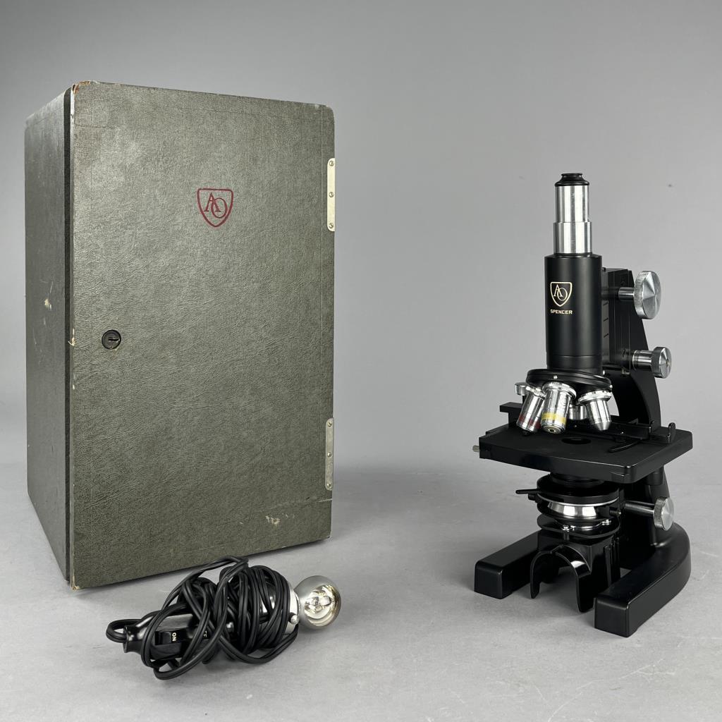 Research microscope, American Optical Company / Spencer Lens Company (Buffalo, New York), marked on bottom, mid to late 29th Century, includes light and carry case. CONDITION: The handle on the case missing. Also, there is no key for the case and as a result it cannot be locked or fully closed at the moment. SHIPPING: In-House Shipping Available. Please read our Shipping Policies and Terms and Conditions