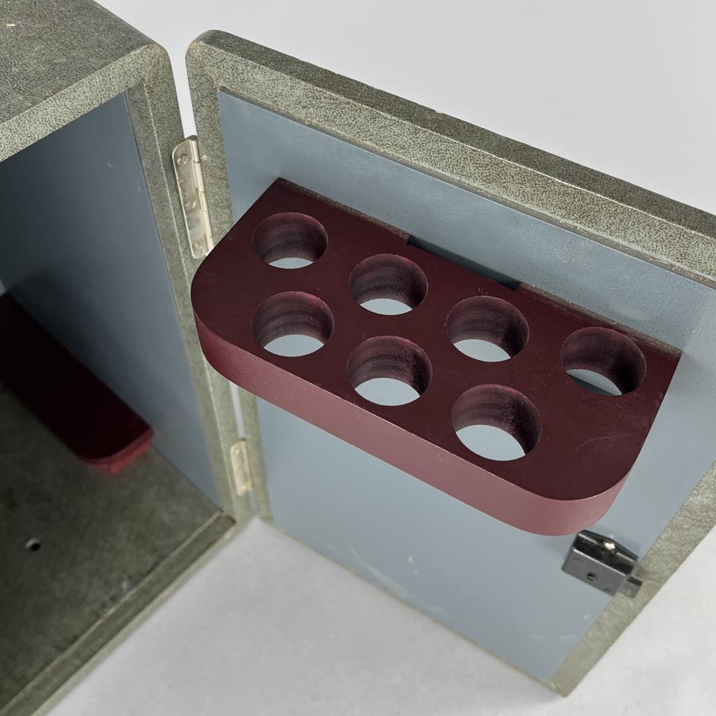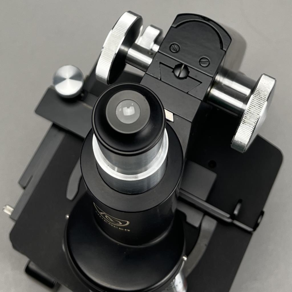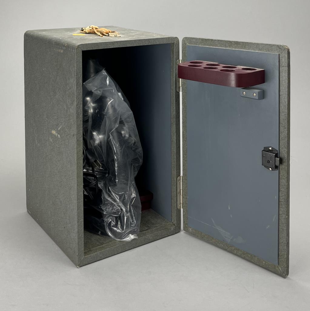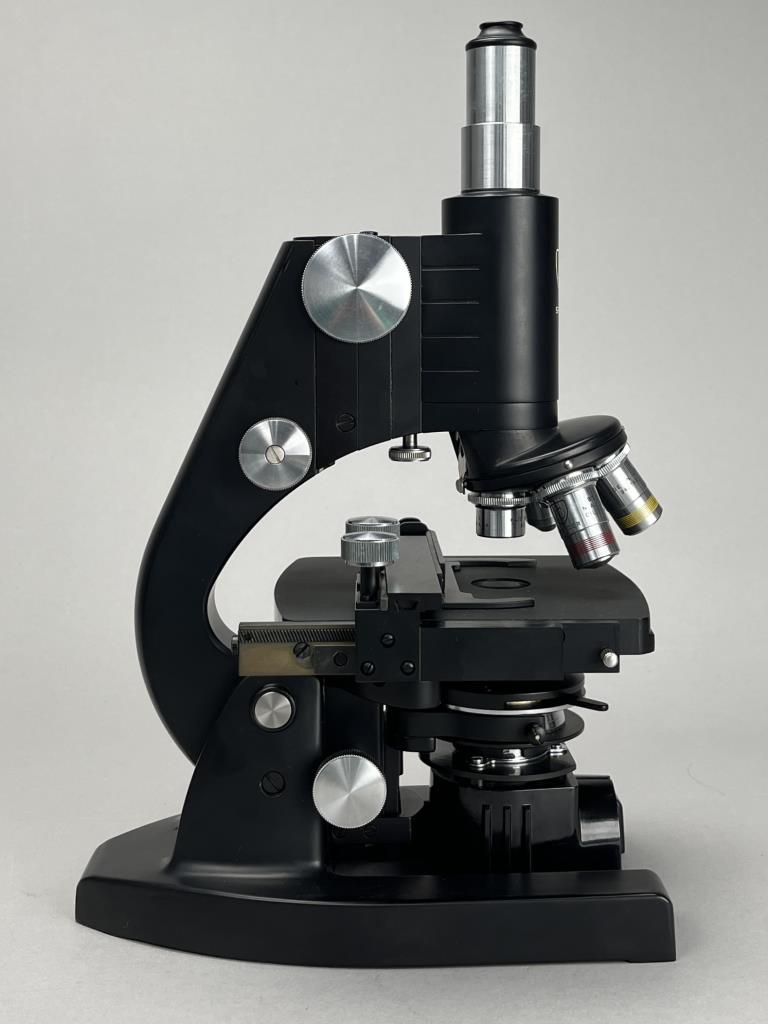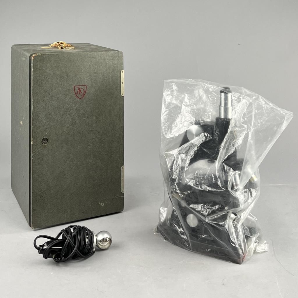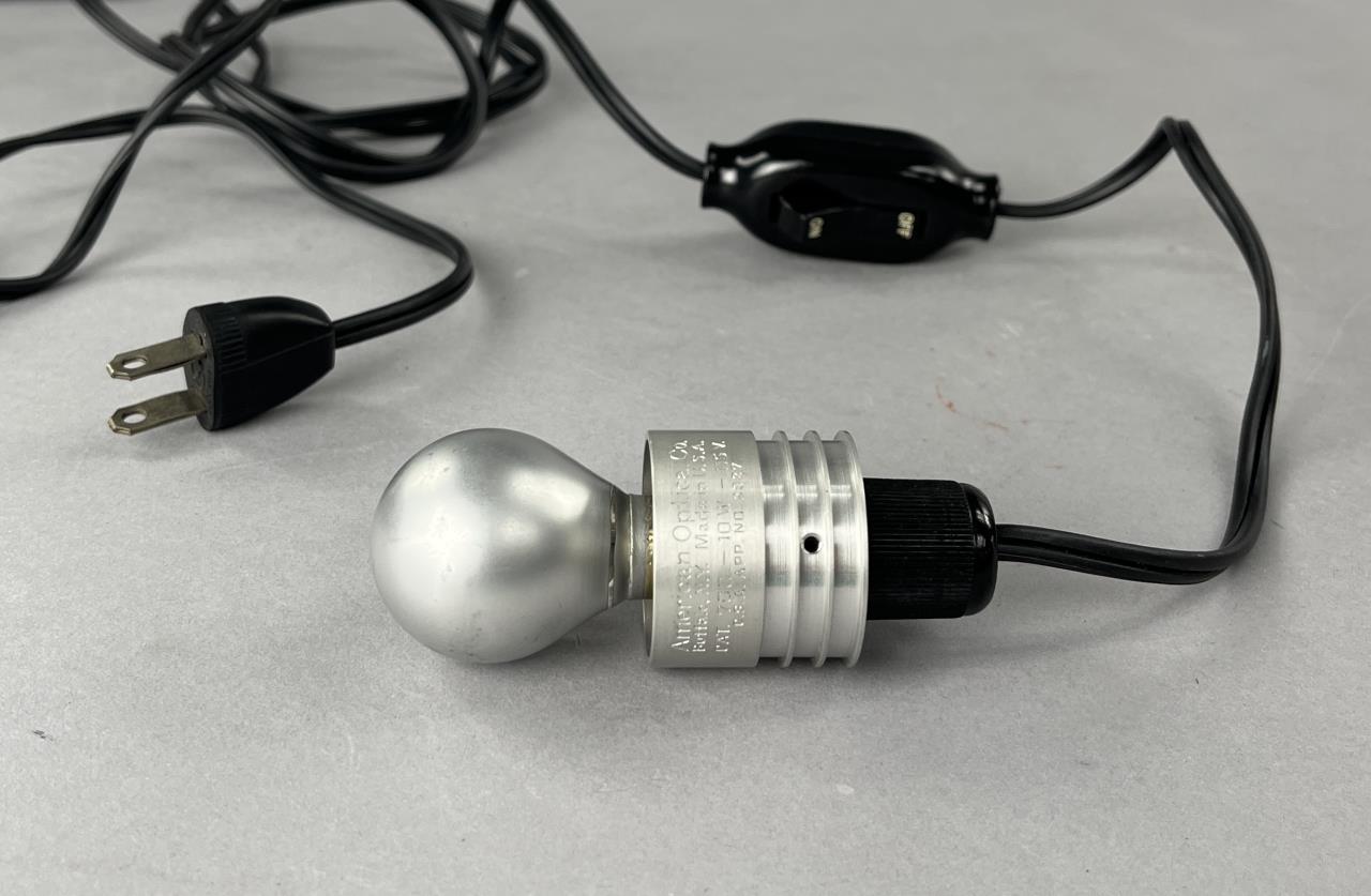 Research microscope, American Optical Company / Spencer Lens Company (Buffalo, New York), marked on bottom, mid to late 29th Century, includes light and carry case. CONDITION: The handle on the case missing. Also, there is no key for the case and as a result it cannot be locked or fully closed at the moment. SHIPPING: In-House Shipping Available. Please read our Shipping Policies and Terms and Conditions