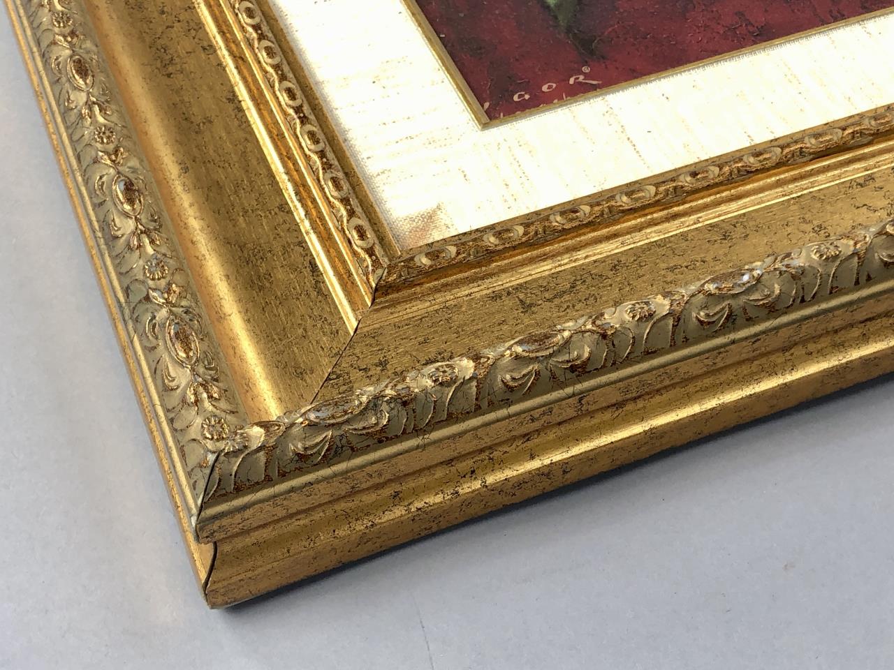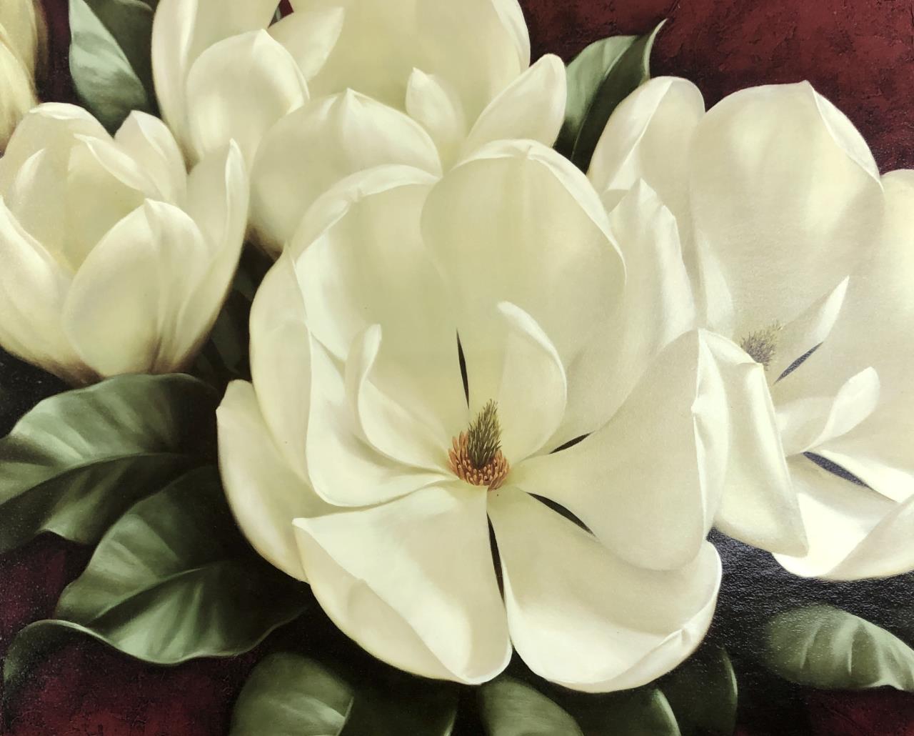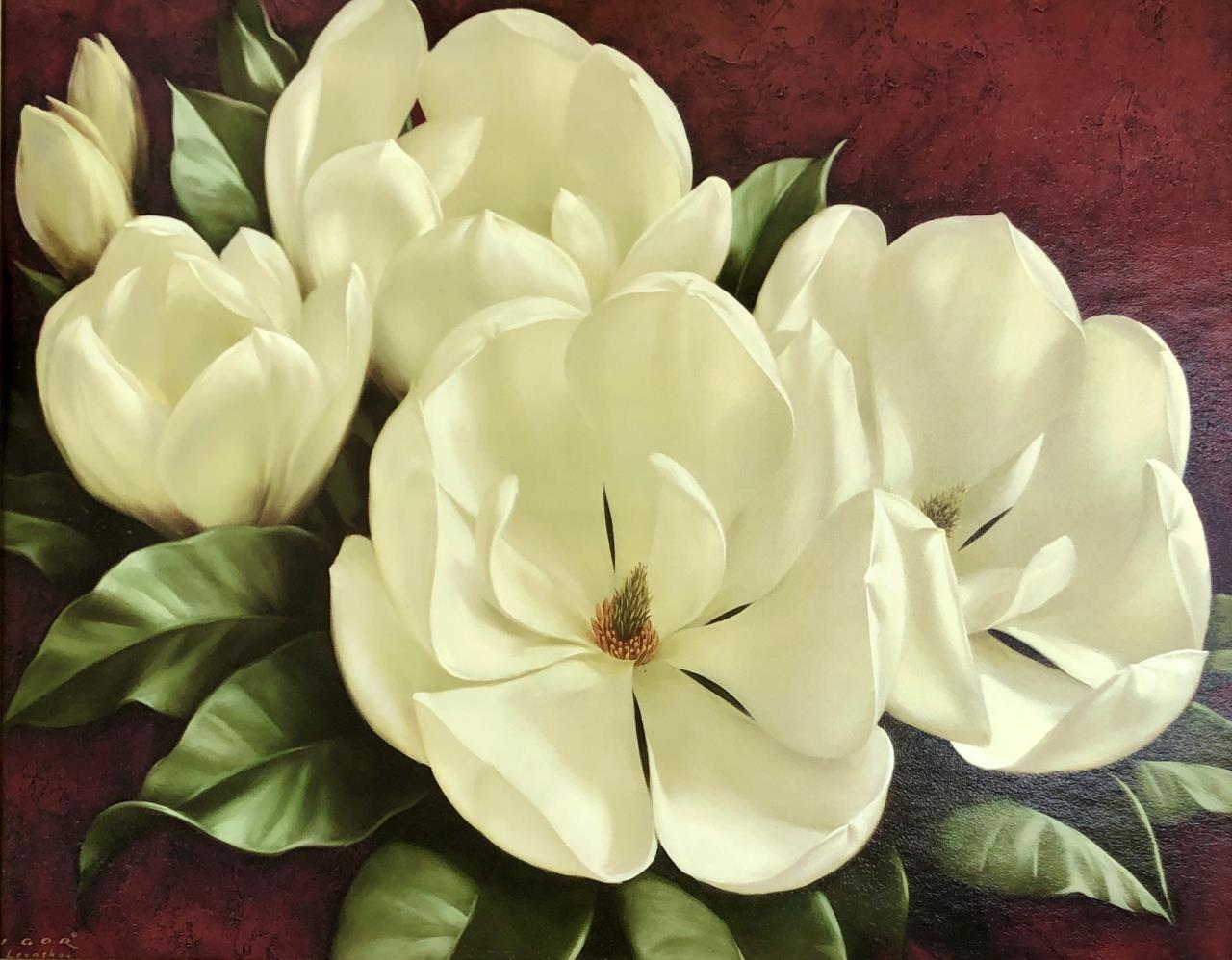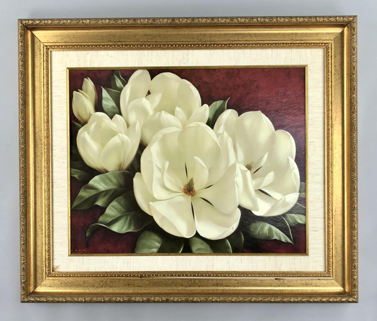 Igor Levashov (Russian, b. 1964), “Magnolia,” offset printed on board, in a gold colored synthetic composite frame measuring 38-3/4″ x 32-5/8″. CONDITION: Damage to upper left corner of frame, as well as apparent errors in the surface application to the frame, please see last photos. SHIPPING: Local pick-up or third party shipping only for this lot. Please see the Shipping Policy for information on suggested shippers. We recommend the Pak Mail Store of Battle Creek to assist you. Please contact the shipper of your choice for shipping estimates on this lot. Refer to the Shipping section in our full Terms and Conditions for all information on shipping.
